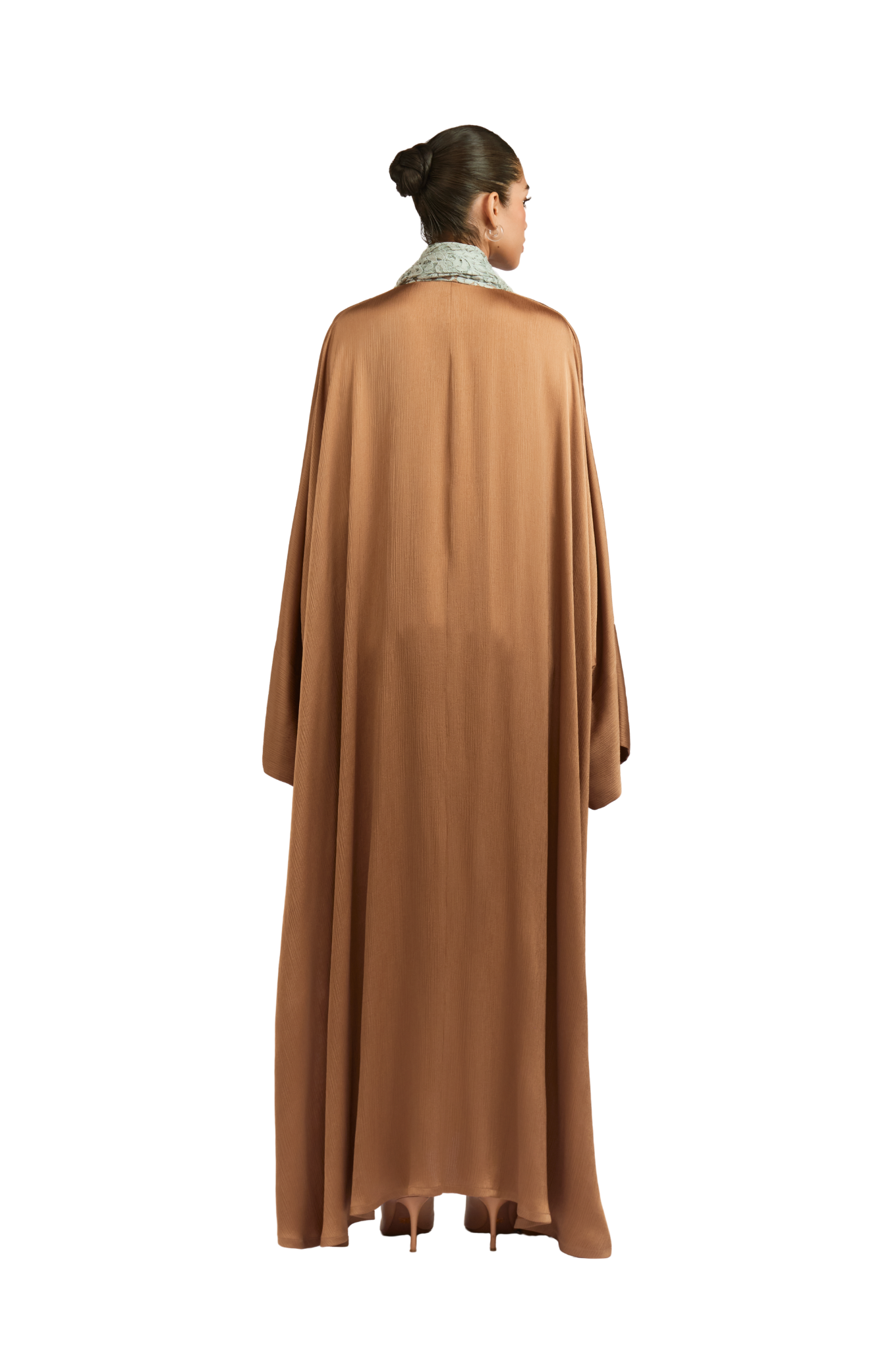 Crafted from premium pleated satin fabric, this nude abaya exudes a smooth, lustrous finish that drapes beautifully on the body. The sophisticated square cut provides a flowing, graceful silhouette, while the attached lace sheila in teal adds a touch of intricate detail. The side slits, enhanced with lace detailing, allow for ease of wear, further elevating the refinement of the design.