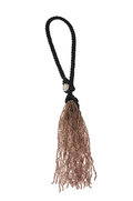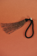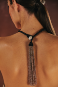 This distinctive back tassel is crafted from thick black rope, exuding a bold and modern aesthetic. The closure at the back is secured with a signature 1309 shell button, adding a refined touch of uniqueness. A stunning black-to-mauve ombre crystal tassel gracefully hangs, shimmering with every movement, making this accessory a statement piece that beautifully balances elegance and contemporary design.