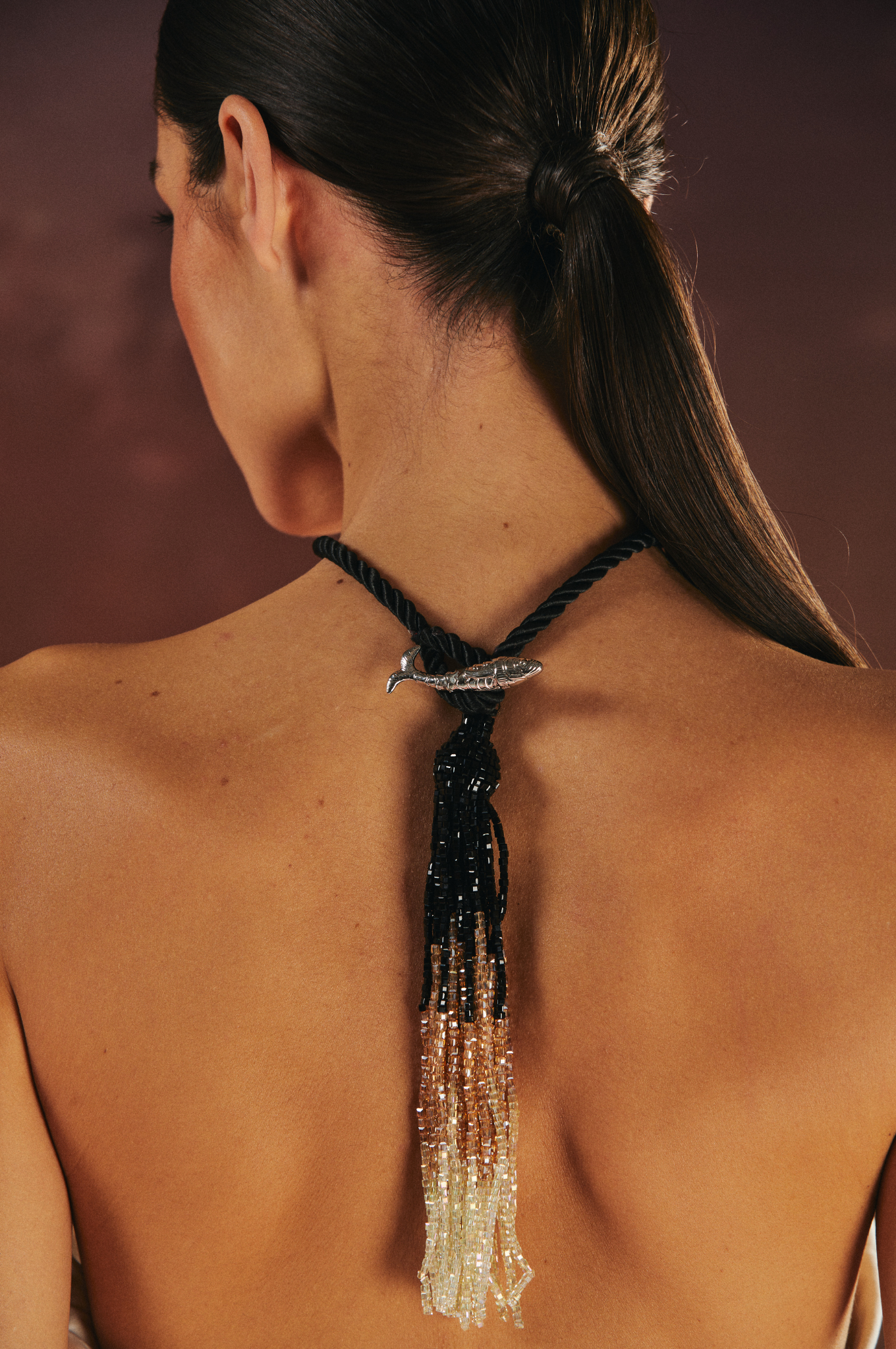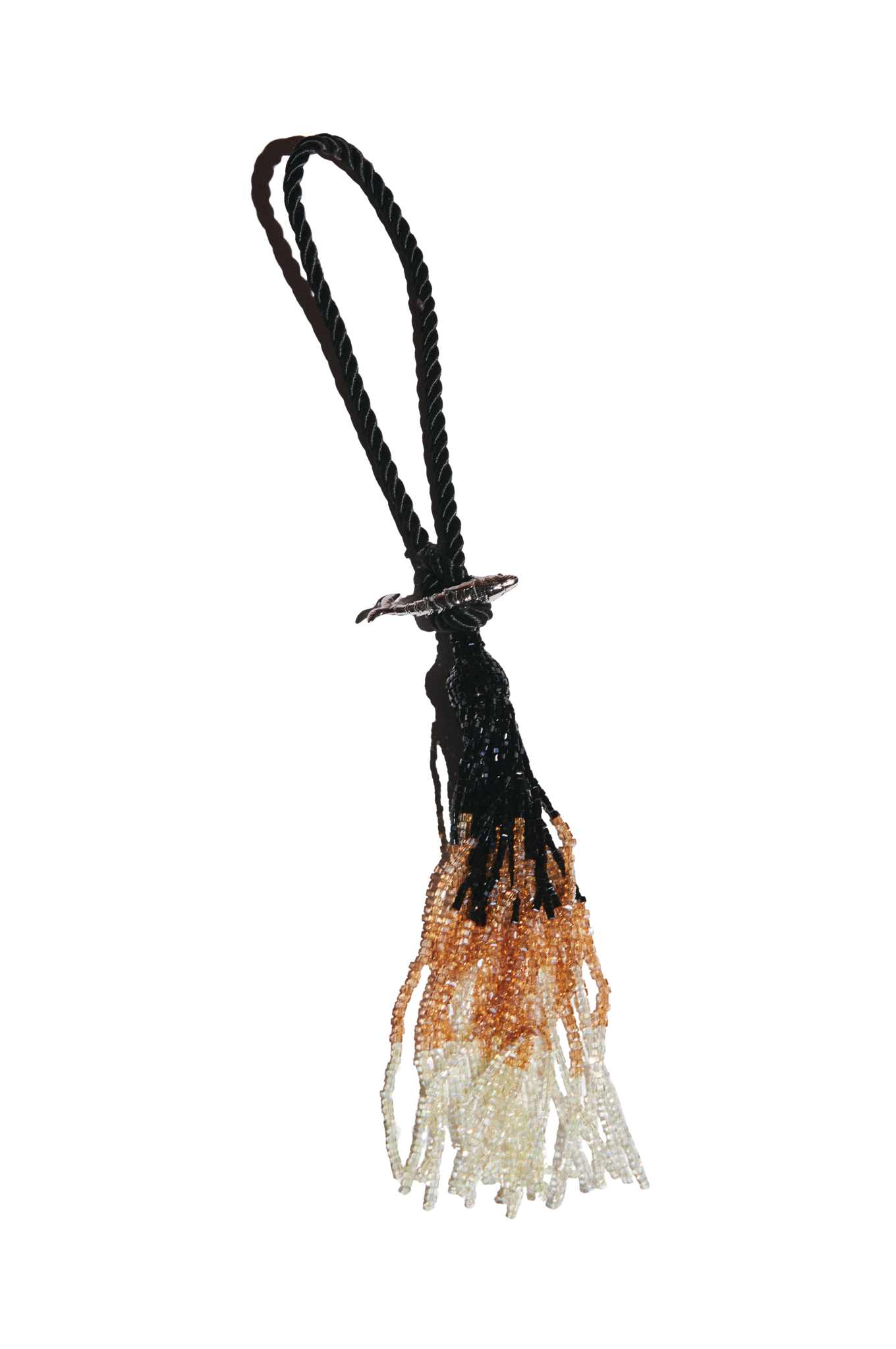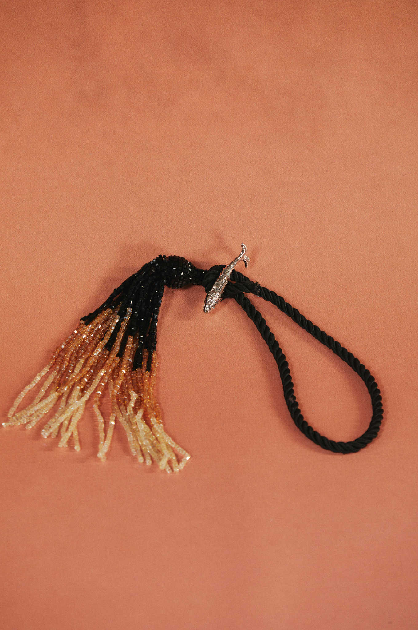 This distinctive back tassel is crafted from thick black rope, exuding a bold and modern aesthetic. The closure at the back is secured with a signature 1309 shell button, adding a refined touch of uniqueness. A stunning black-to-mauve ombre crystal tassel gracefully hangs, shimmering with every movement, making this accessory a statement piece that beautifully balances elegance and contemporary design.