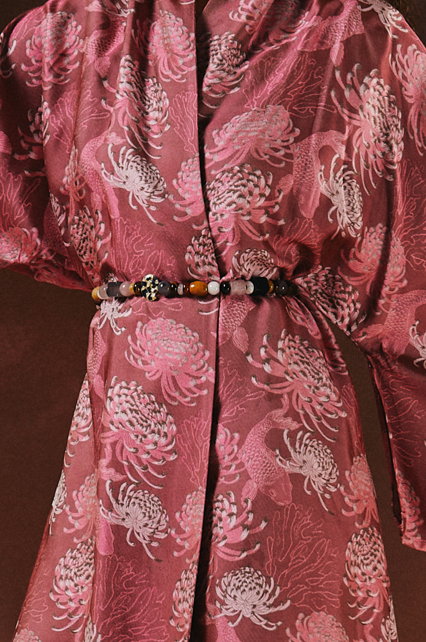 This elegant belt features mixed marble-colored beads, blending earthy and neutral tones for a sophisticated, natural look. Perfect for cinching dresses, kaftans, or tunics, it adds a polished touch to any outfit with its artistic design and secure bow.