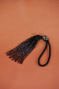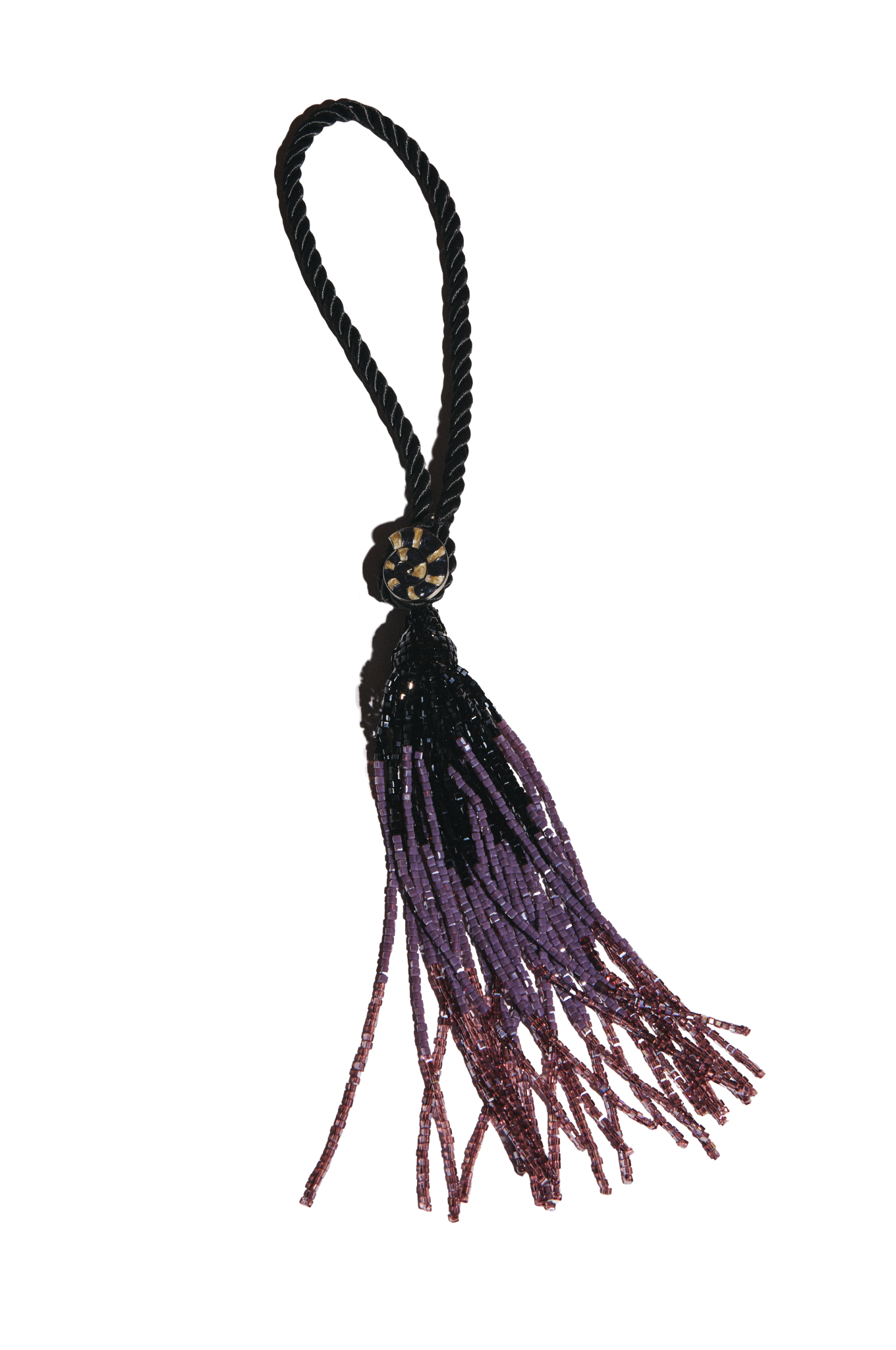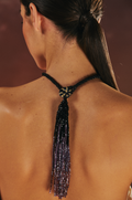 This distinctive back tassel is crafted from thick black rope, exuding a bold and modern aesthetic. The closure at the back is secured with a signature 1309 shell button, adding a refined touch of uniqueness. A stunning black-to-mauve ombre crystal tassel gracefully hangs, shimmering with every movement, making this accessory a statement piece that beautifully balances elegance and contemporary design.