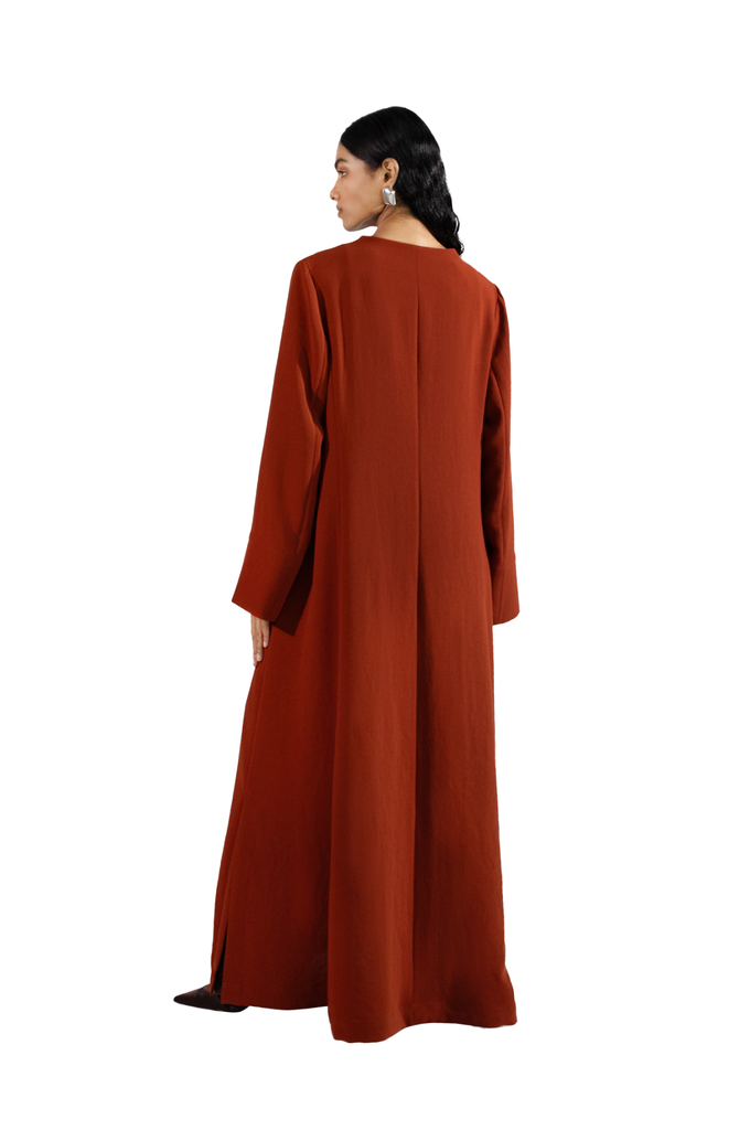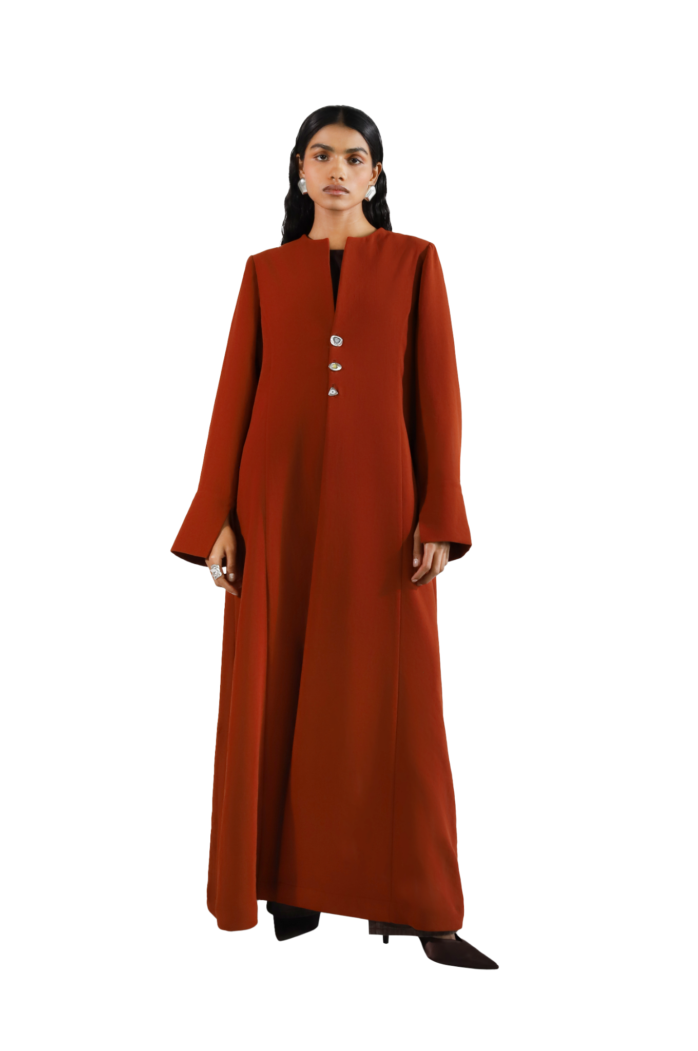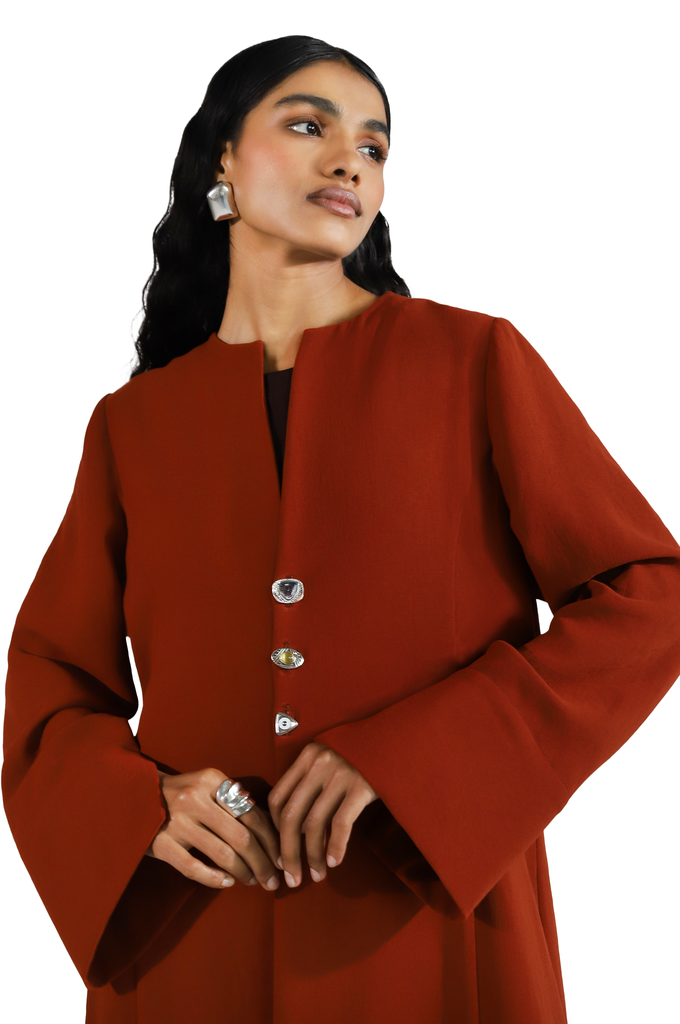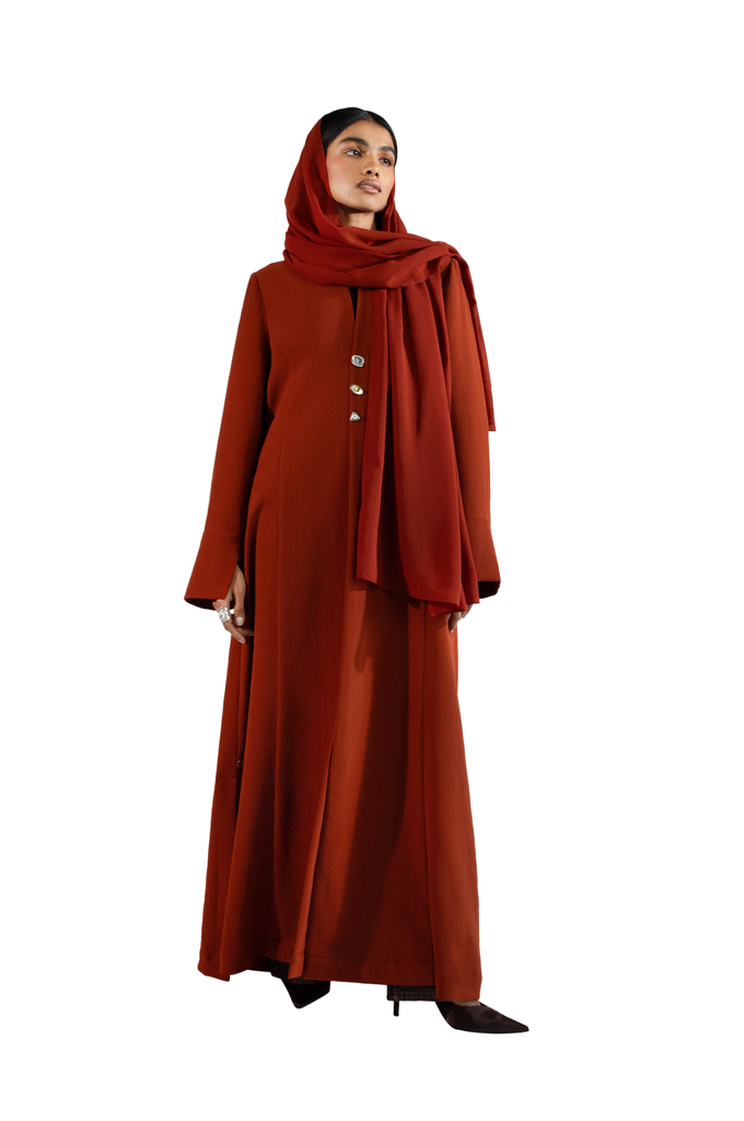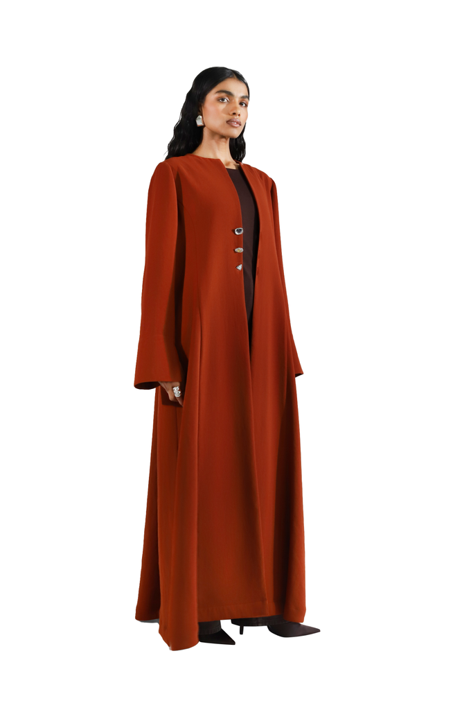 The Amelia Abaya is reimagined in warm terracotta-hued textured crepe, flowing in a graceful A-line silhouette that brings understated richness to everyday elegance. Down the center, three sets of geometric-shaped buttons—each adorned with delicate crystals—serve as sculptural accents, catching the light with subtle sparkle.
