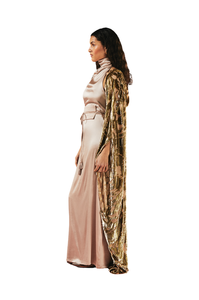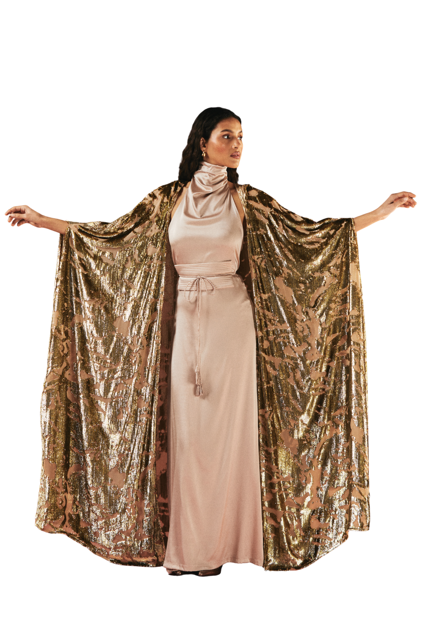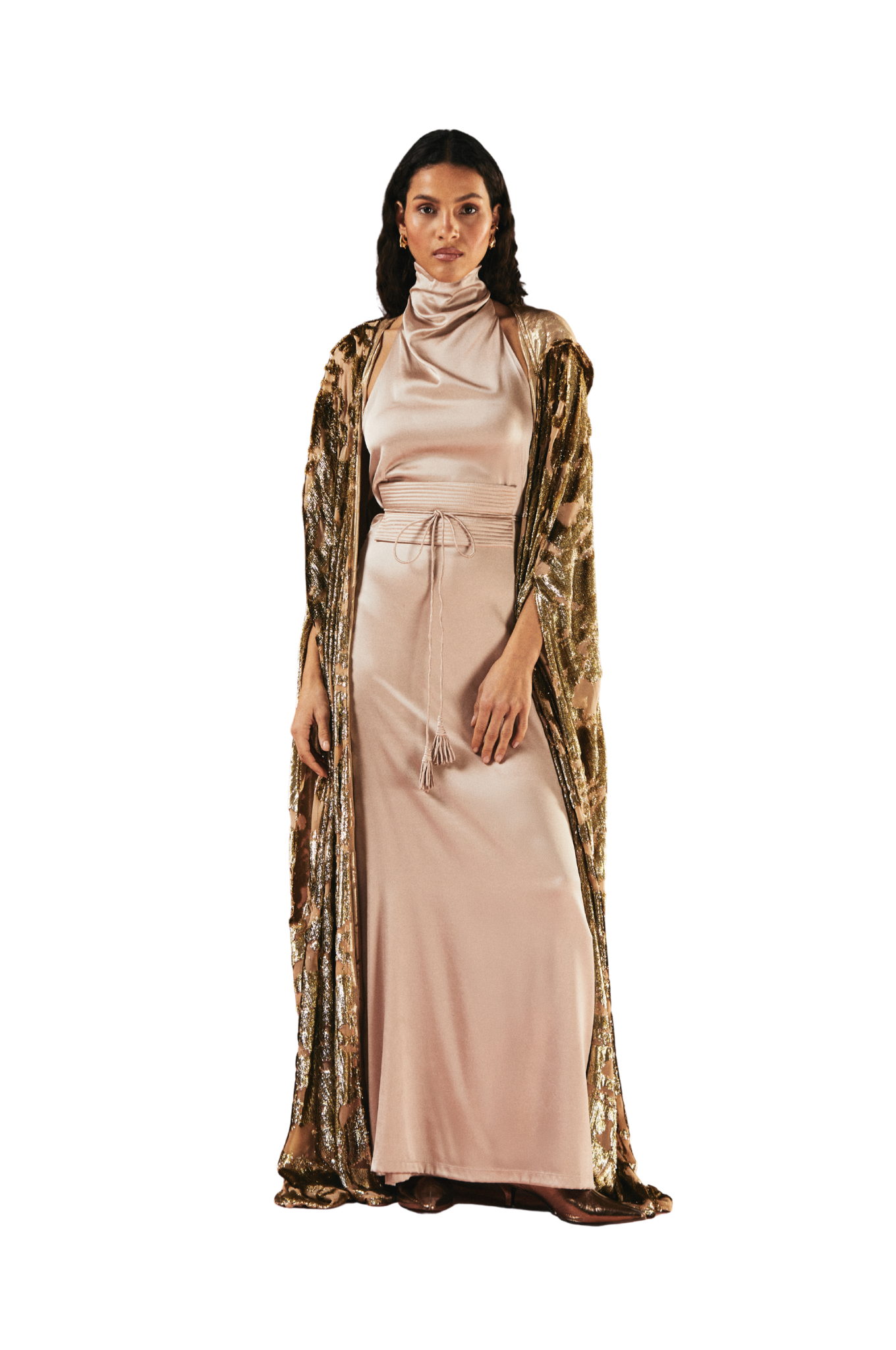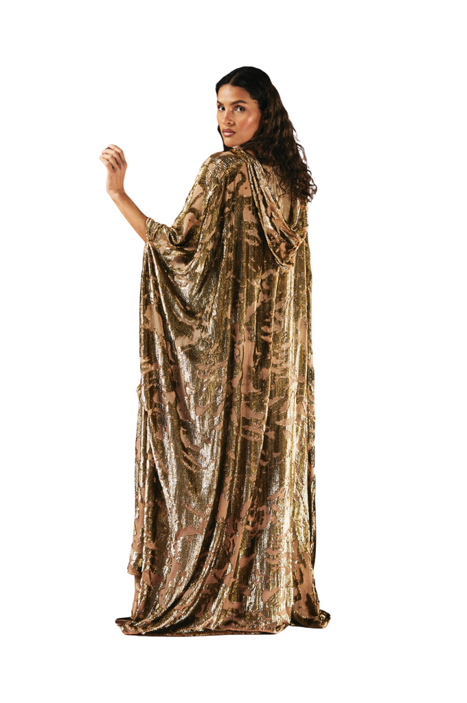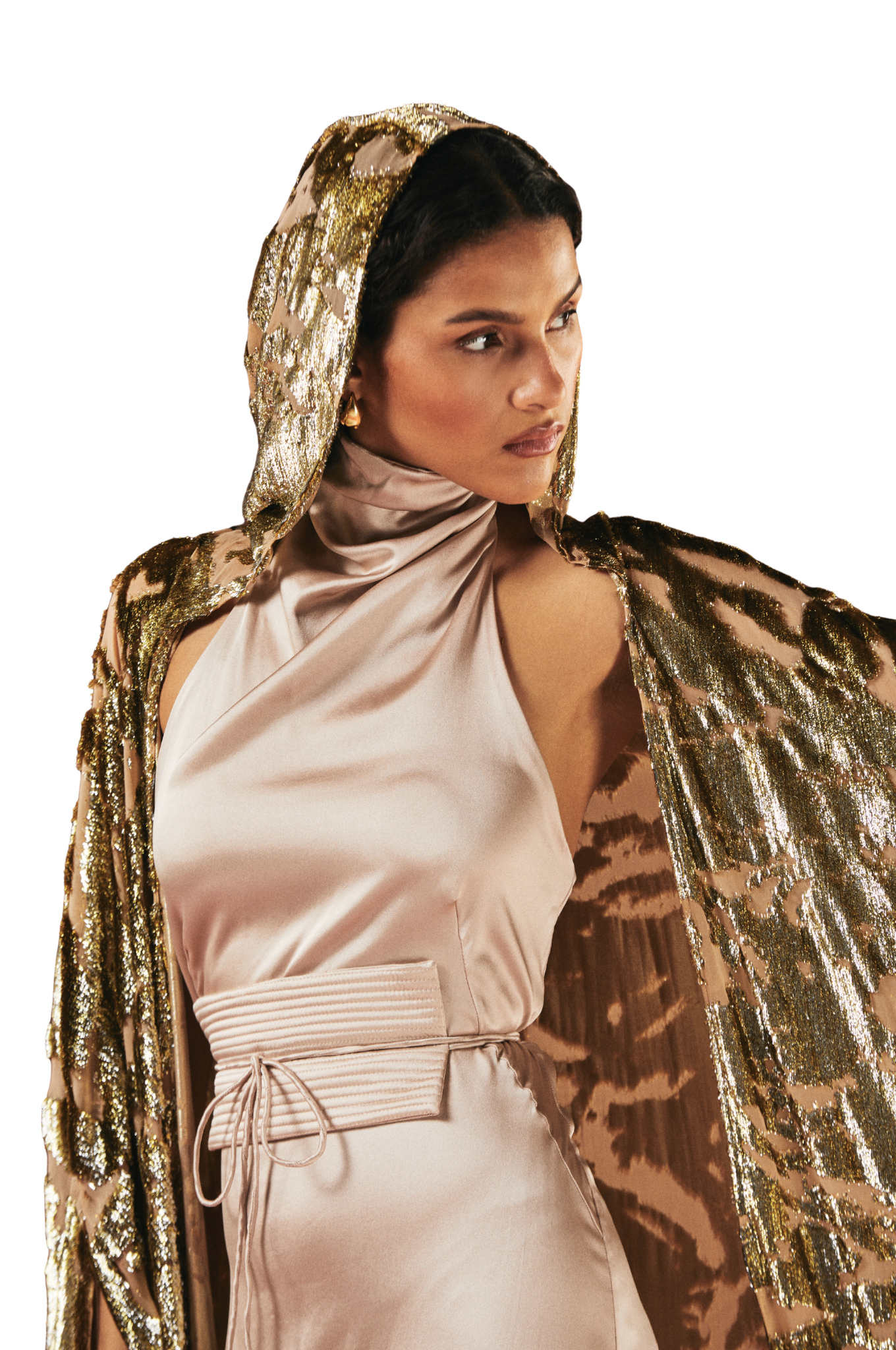 This stunning hooded cape is crafted from luxurious flocked marble gold velvet chiffon, adding a rich texture to its ethereal design. Beneath it lies a soft, stretchy nude silk inner dress, perfectly complemented by a unique padded belt that cinches the waist for a flattering silhouette. The cape features dramatic, exaggerated sleeves that flow elegantly, creating a sense of effortless movement with every step. A distinctive twisted neck detail adds a striking element, setting this piece apart with its innovative design.