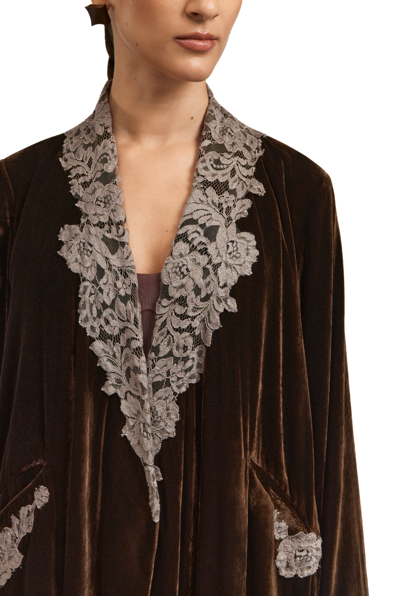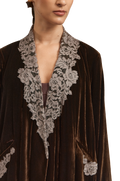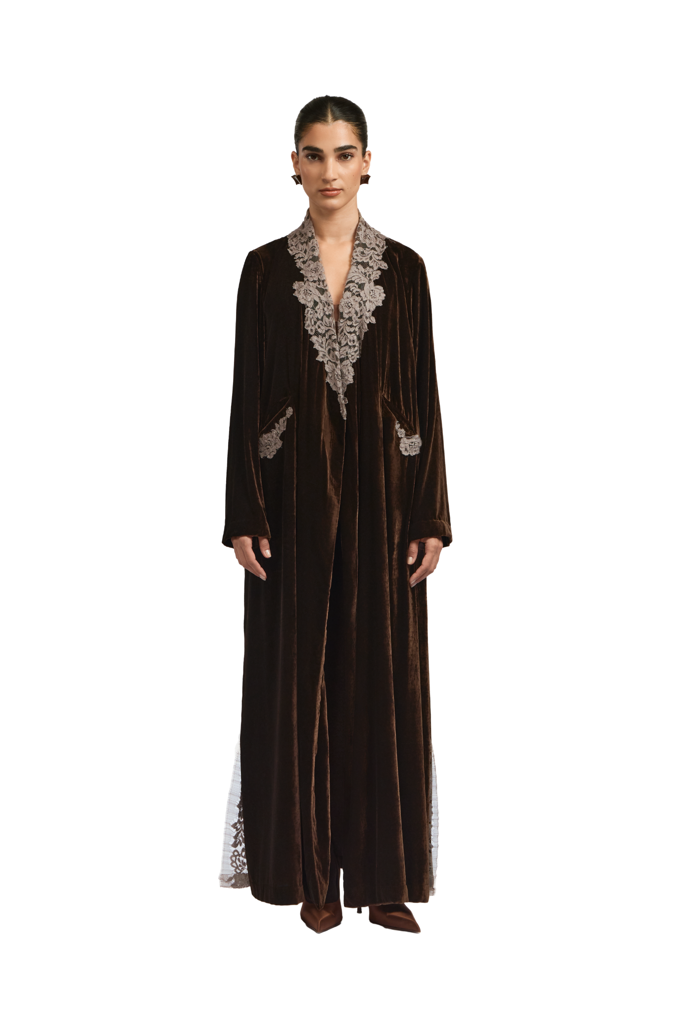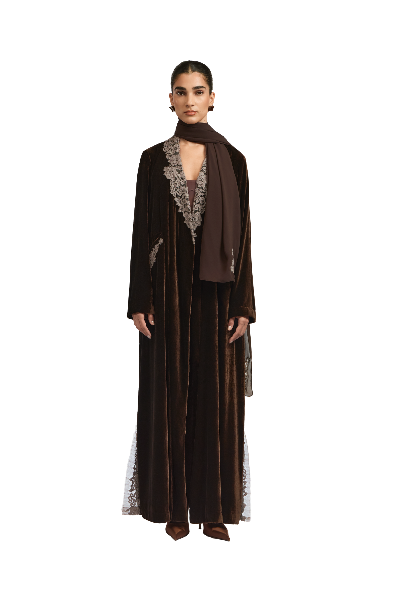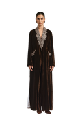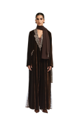 Ines brown abaya embodies refined elegance through a tailored silhouette. Crafted from rich brown velvet, this collared trench-style abaya features intricate lace detailing that adds depth and graceful flow. The subtle side-closure design enhances its structured form while maintaining an effortlessly polished finish—reflecting 1309’s signature harmony of sophistication and ease.