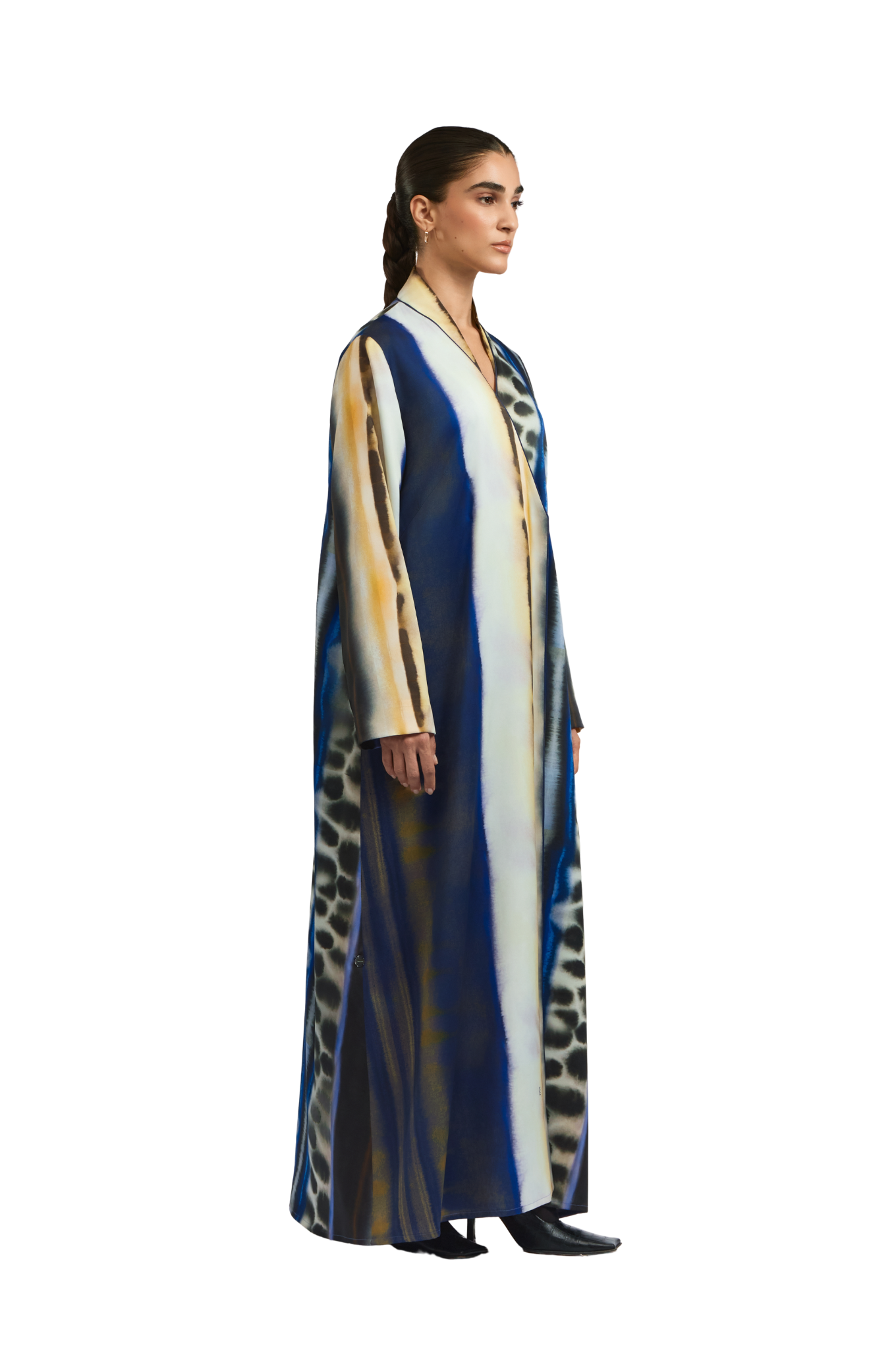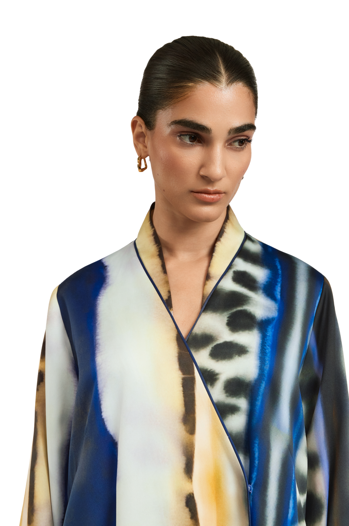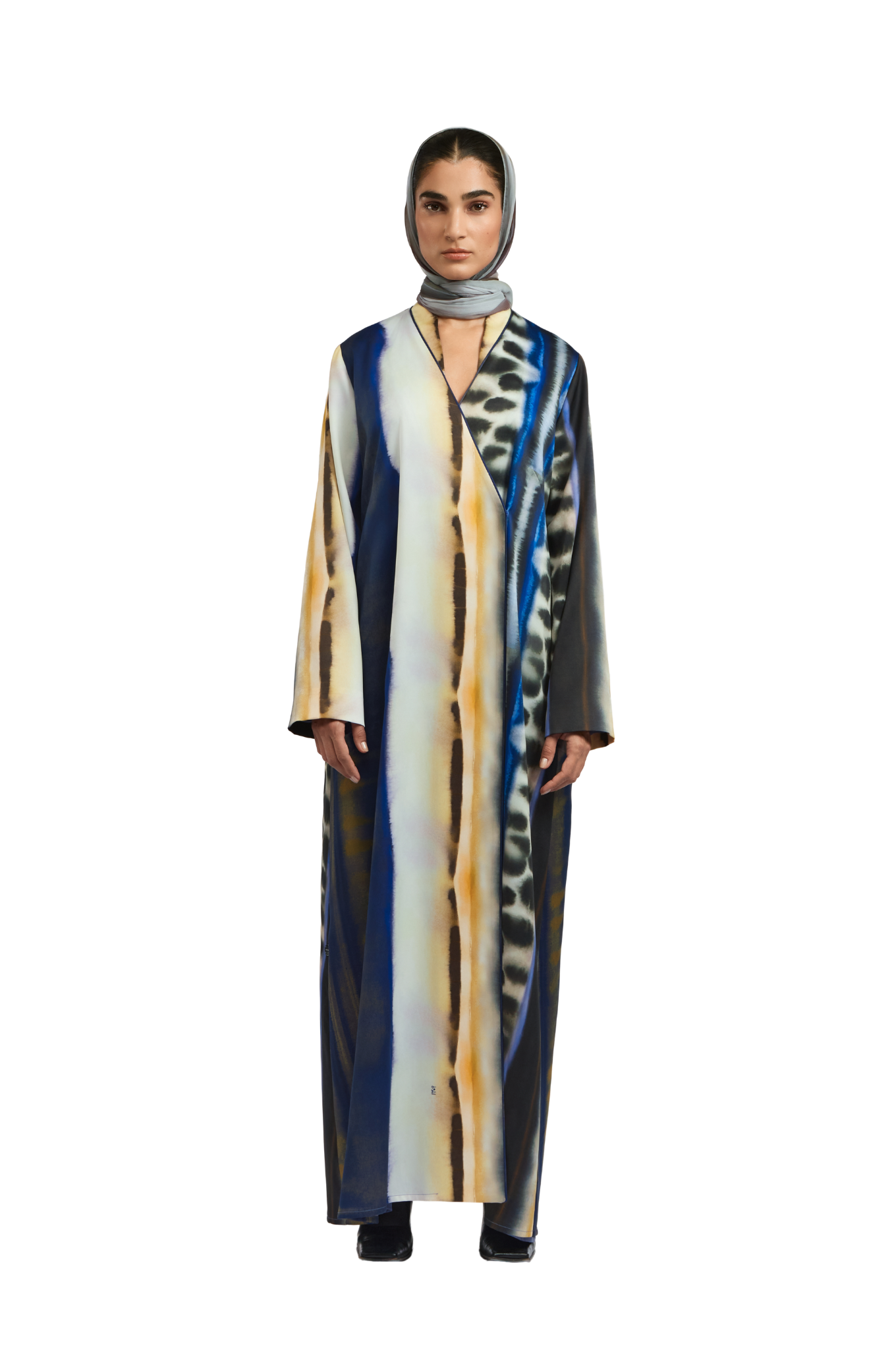 This striking abaya is crafted in rich silk and features a bold, in-house print that blends abstract patterns with deep, moody tones. The fluid silhouette offers both comfort and sophistication, perfect for making a refined statement.