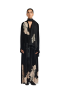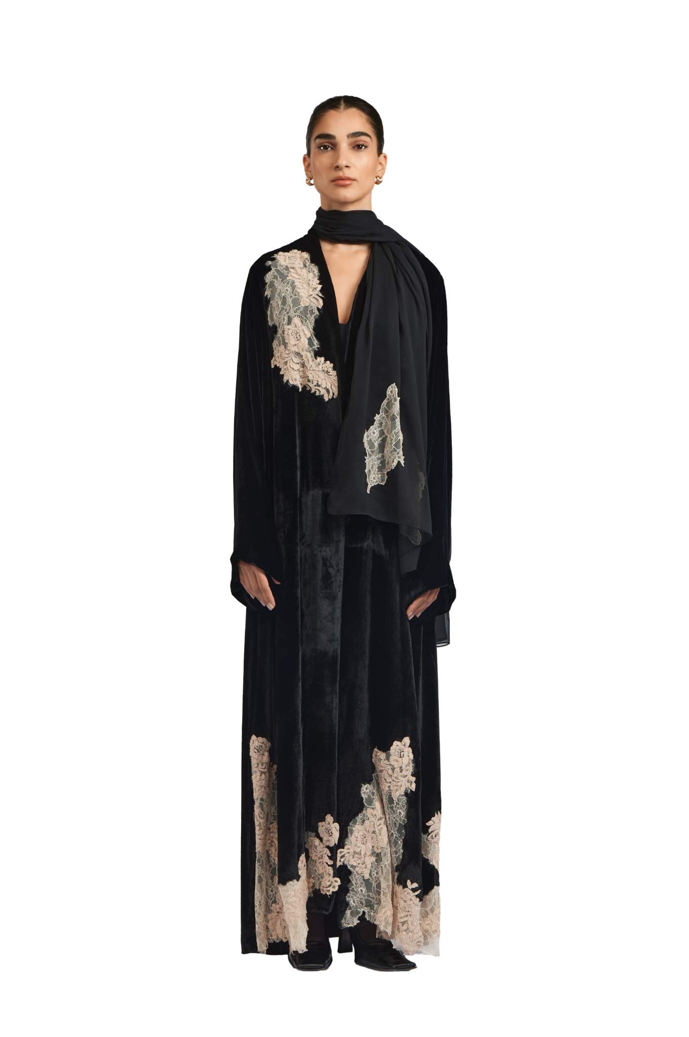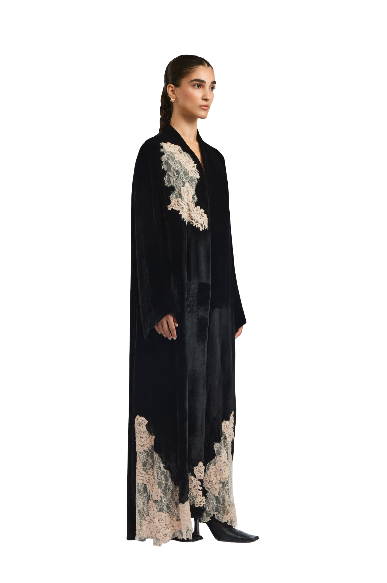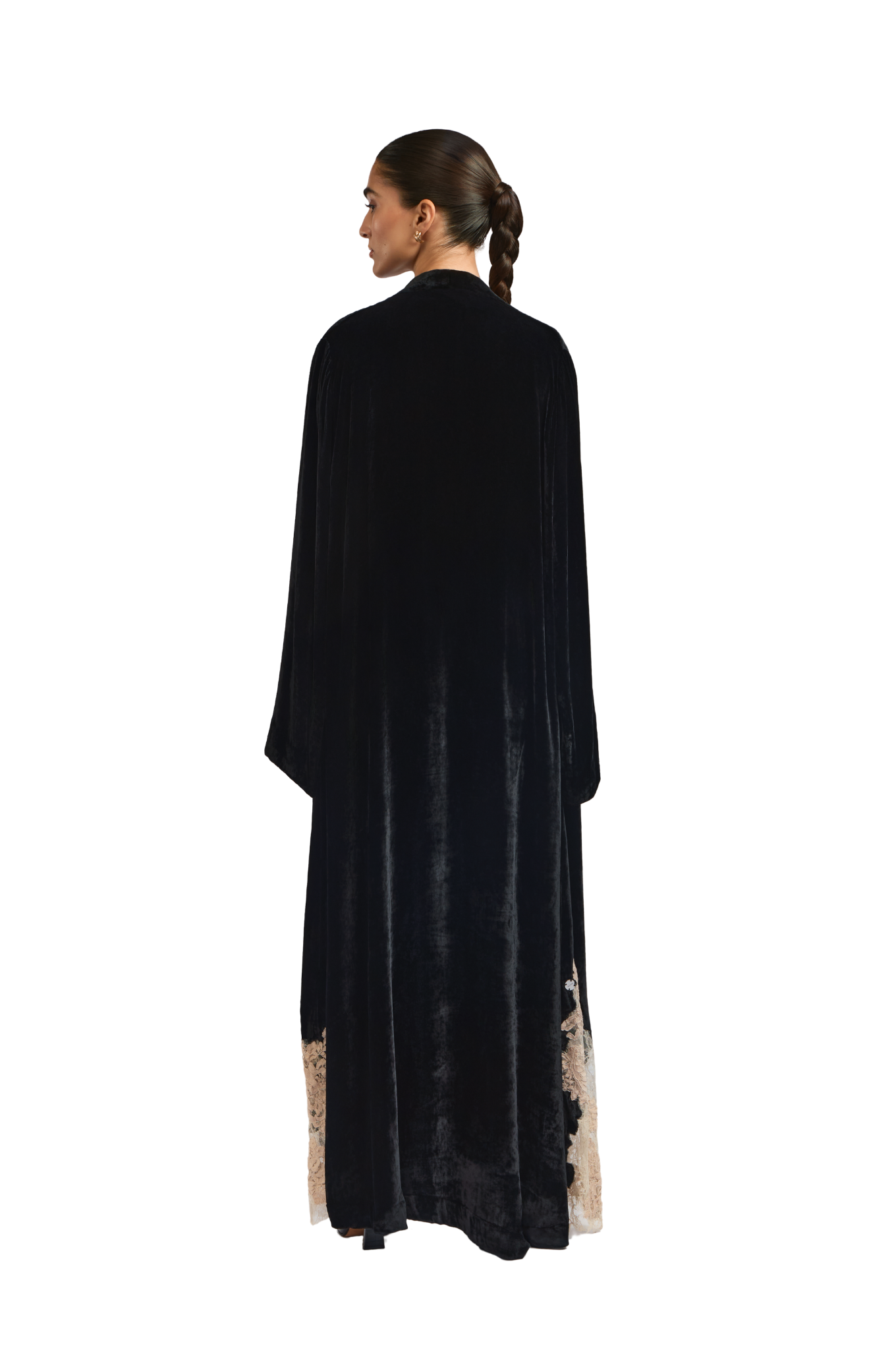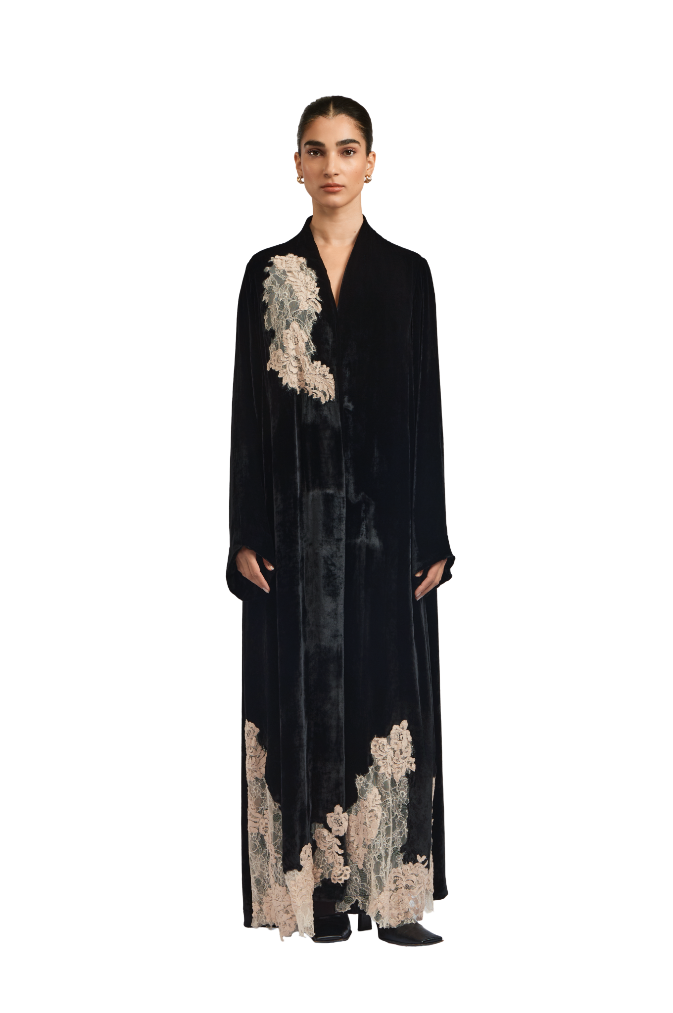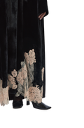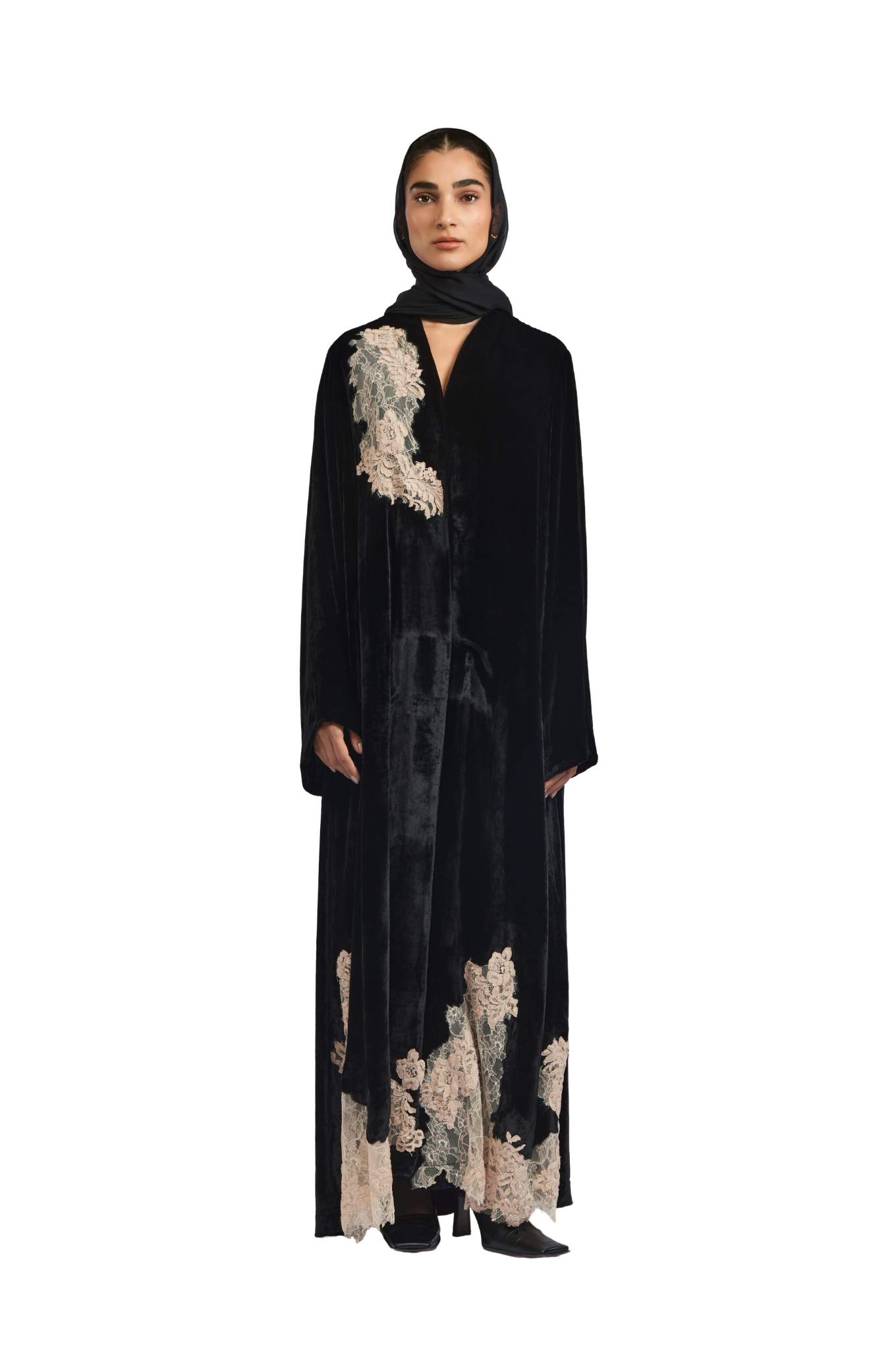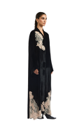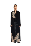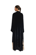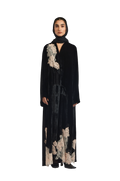 Exuding quiet elegance, the Kia Abaya is crafted from luxurious velvet, offering a rich texture and graceful drape. Its straight-cut silhouette delivers a clean, flattering fit, while delicate lace patchwork is thoughtfully placed throughout the design, creating a subtle contrast that adds depth and refinement.