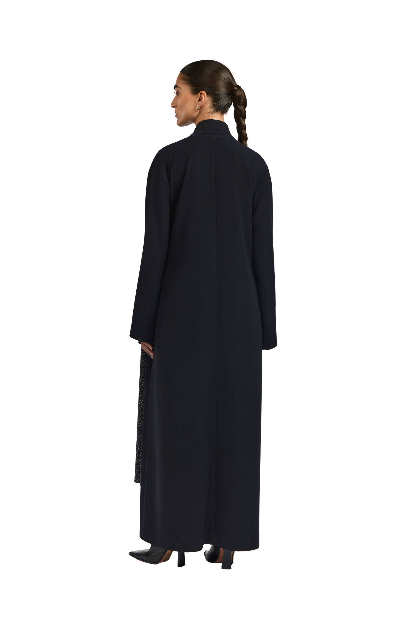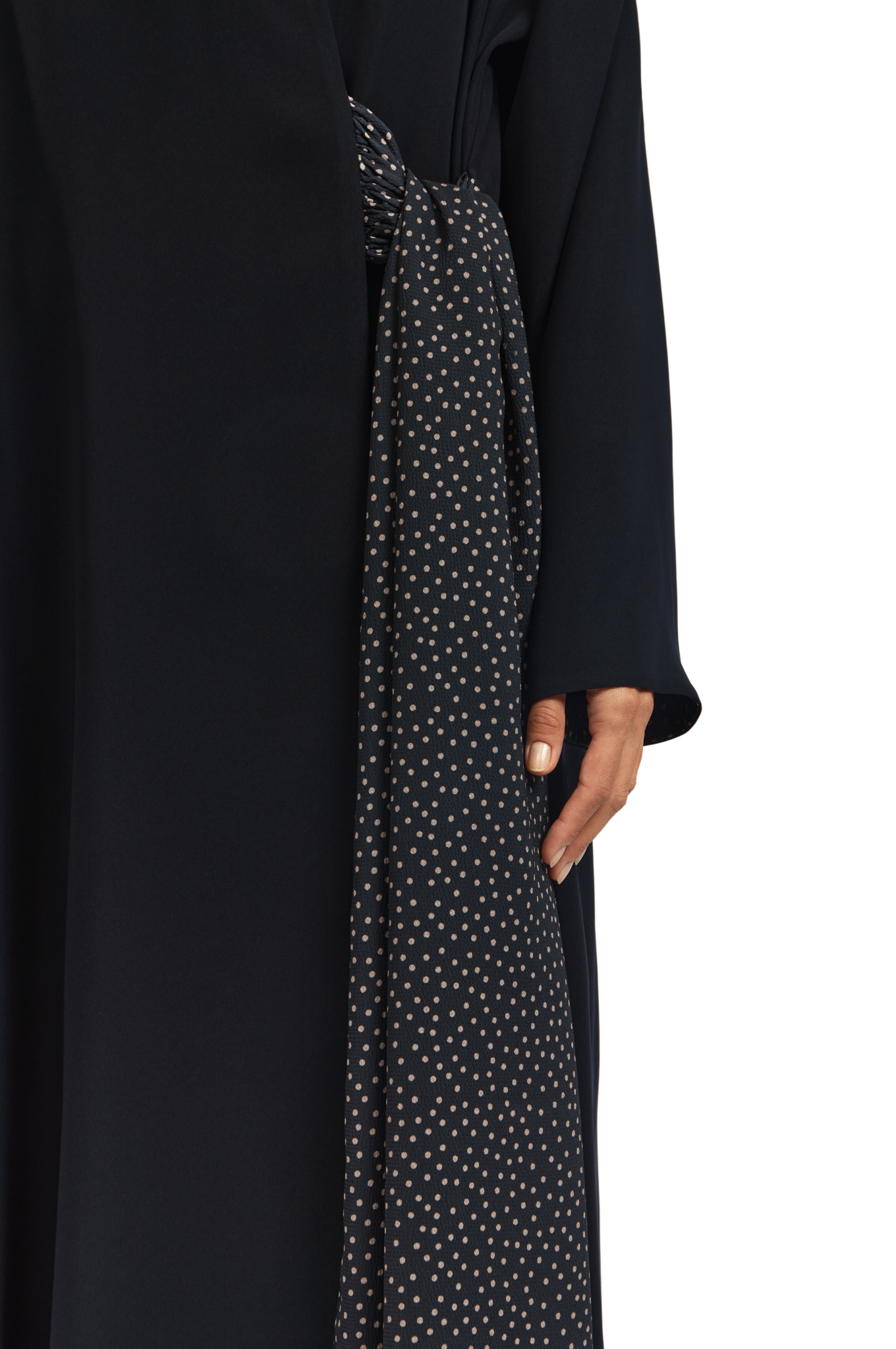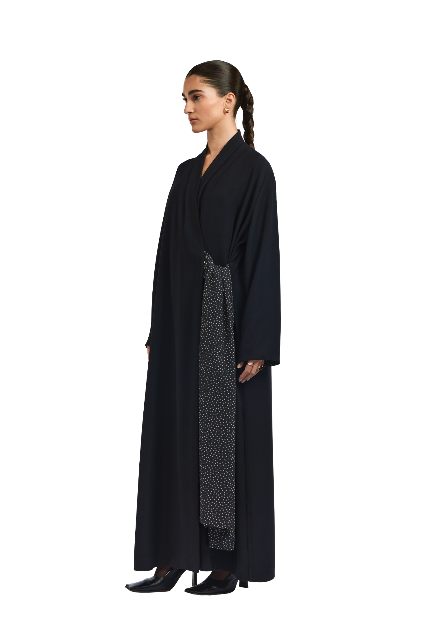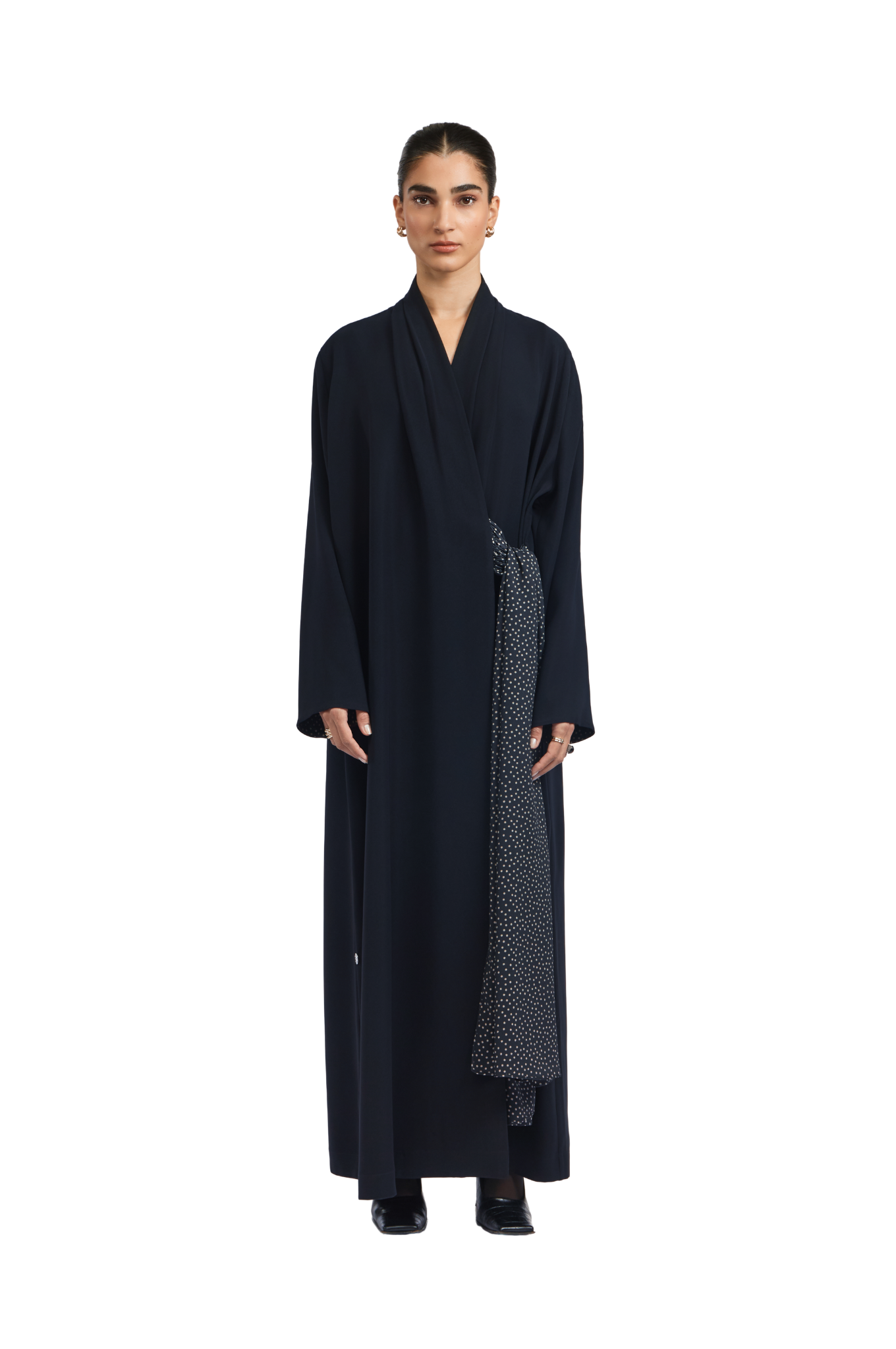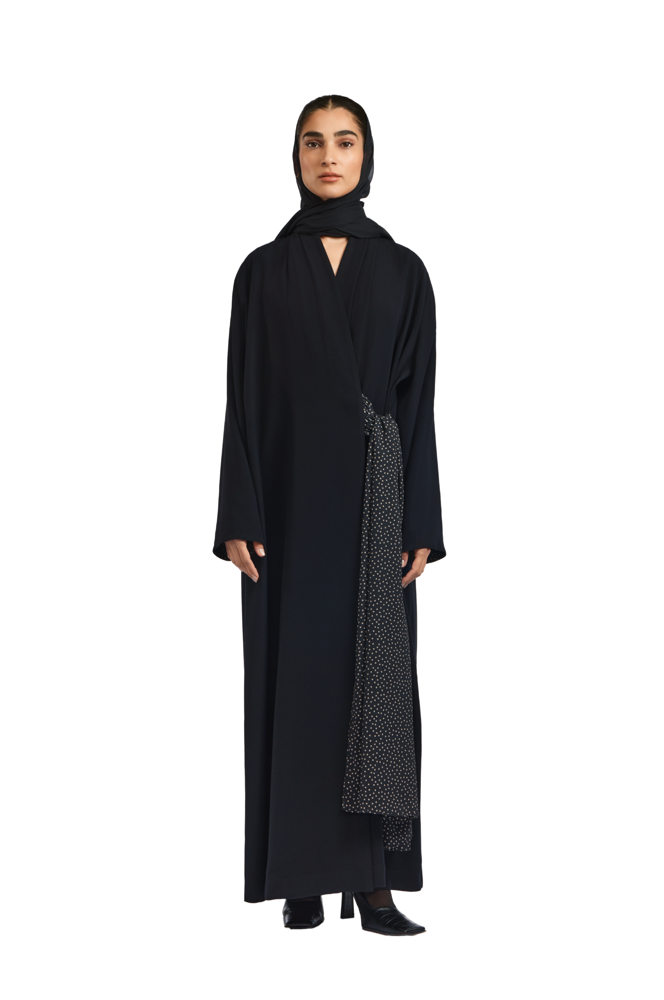 The Kyara abaya presents a contemporary take on the classic slim bisht cut. Crafted from rich crepe . it features a side-tie closure in playful polka-dot textured silk, adding a modern twist to its refined silhouette. Flowing into a soft, graceful trail, it embodies effortless sophistication.
