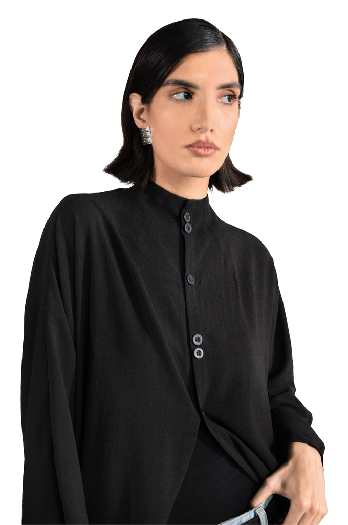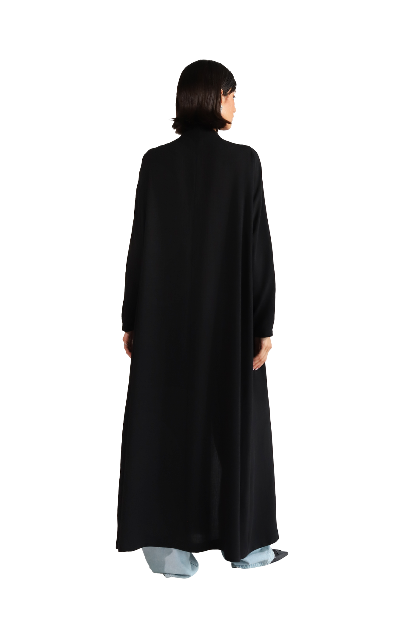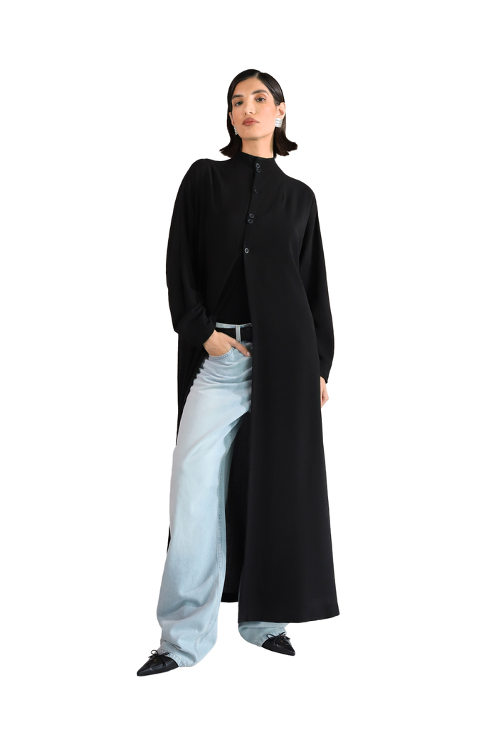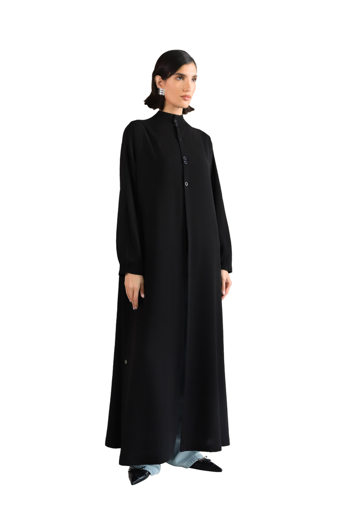 Structured yet fluid, the Amina Abaya is crafted from breathable linen in a high-neck, jacket-style silhouette. Designed without traditional armholes, it offers a modern, draped fit that enhances movement and comfort. Scattered along the front, black 1309 signature buttons act as understated embellishments—bringing a sense of rhythm and detail to the minimalist design.