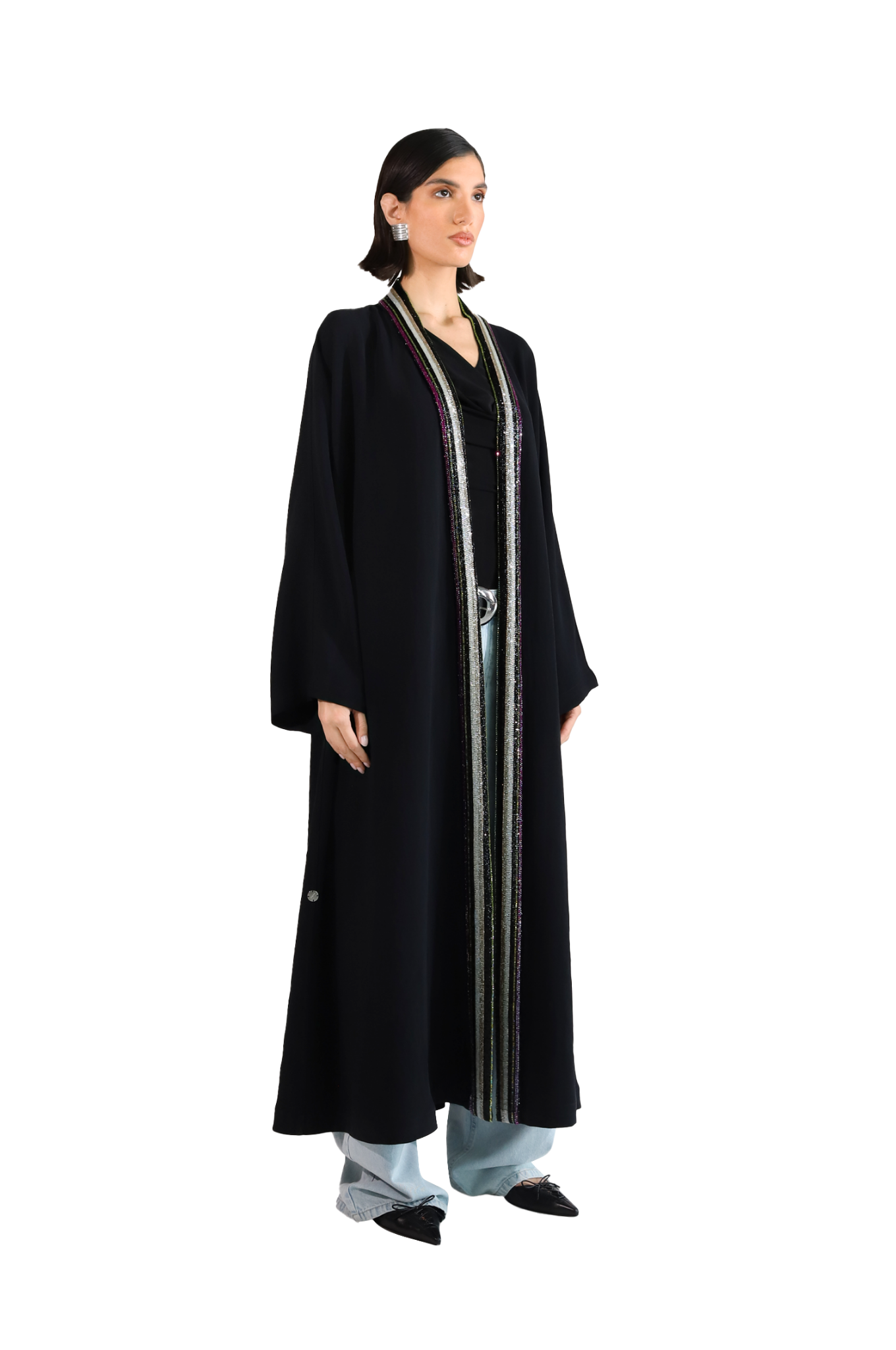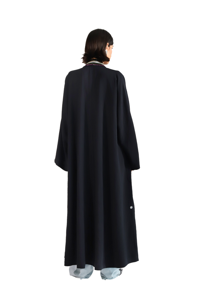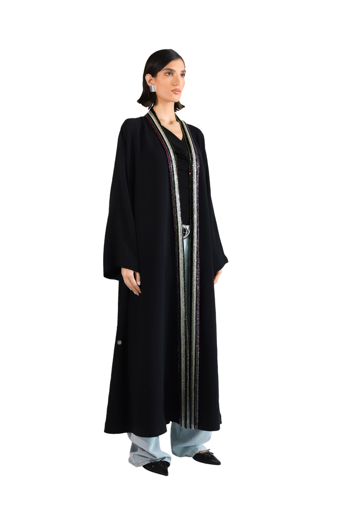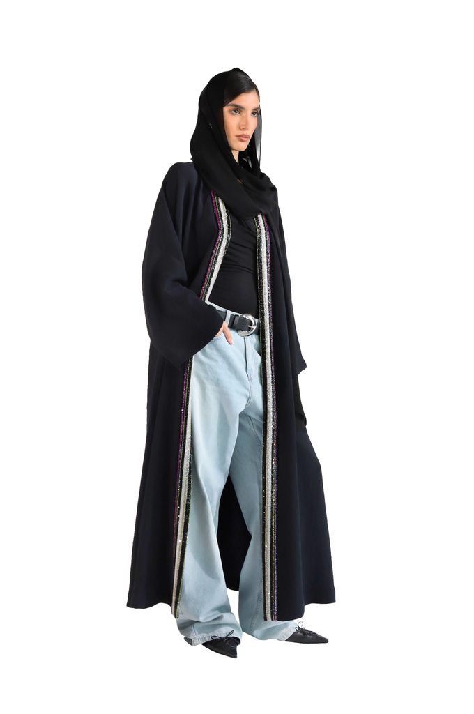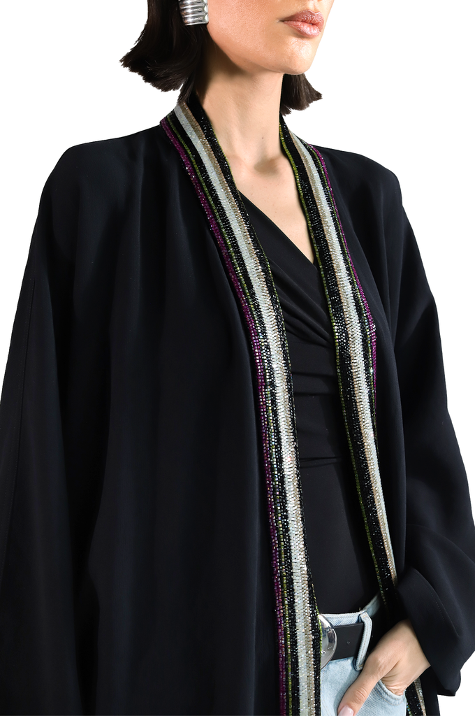 Crafted in textured black crepe, this square-cut abaya exudes sophistication with its heavy beaded band around the neckline, featuring a blend of black, fuchsia, and beige beads. The intricate beadwork adds a striking contrast, enhancing the overall elegance of the piece. Designed as a double-sided piece, it offers both versatility and refinement, allowing you to showcase its beauty from every angle.