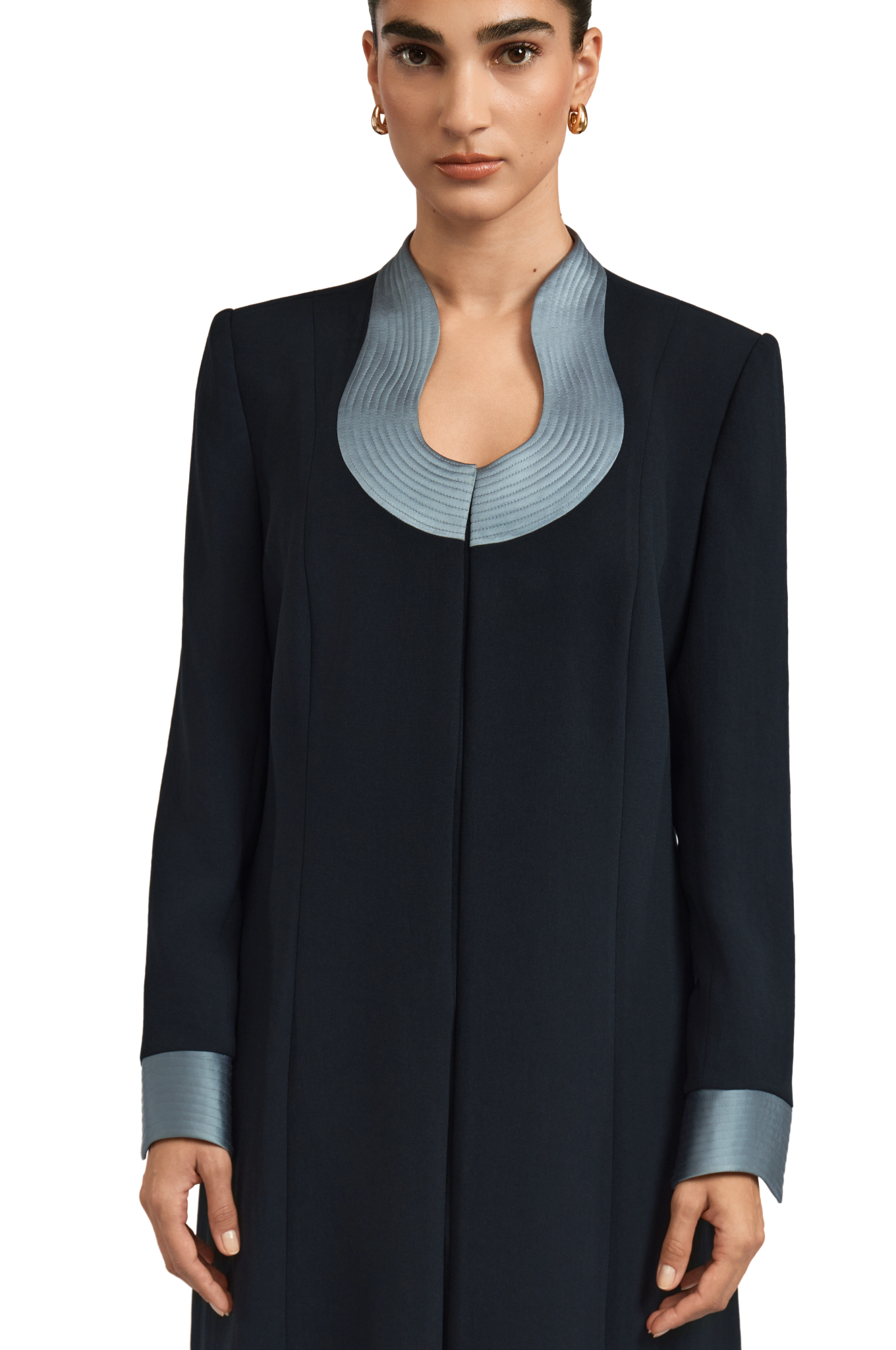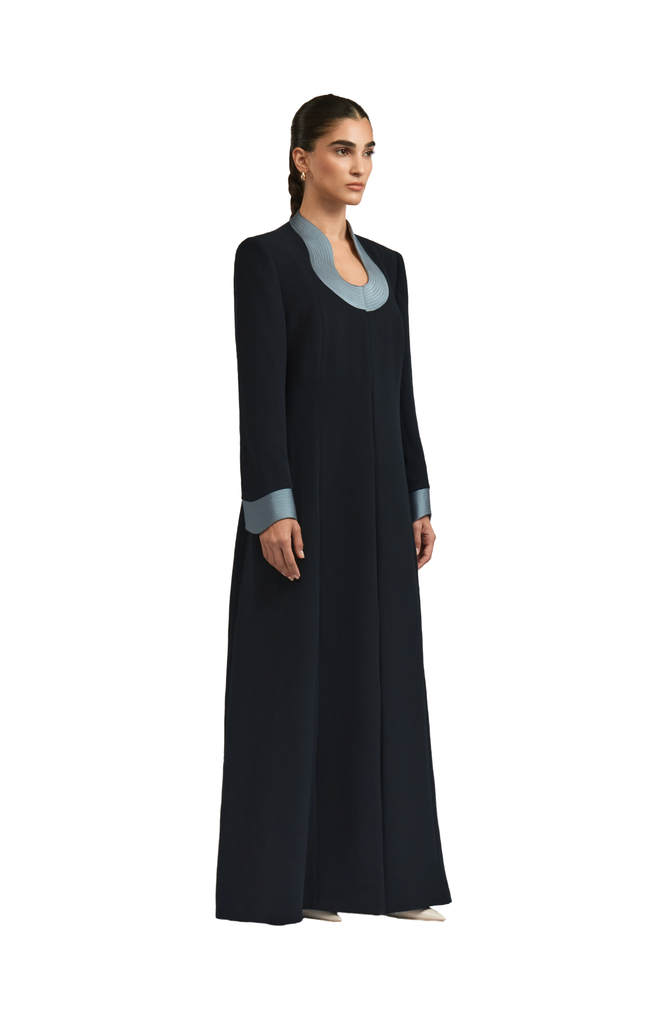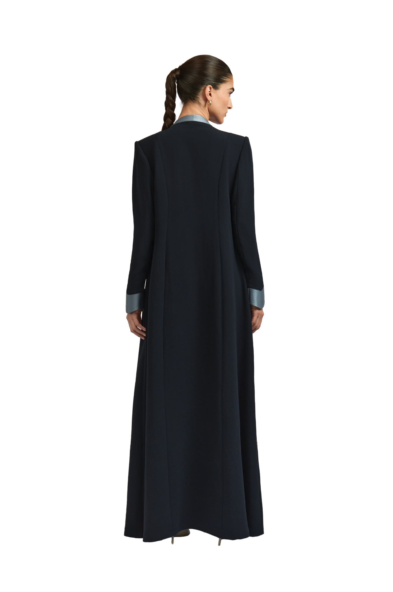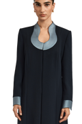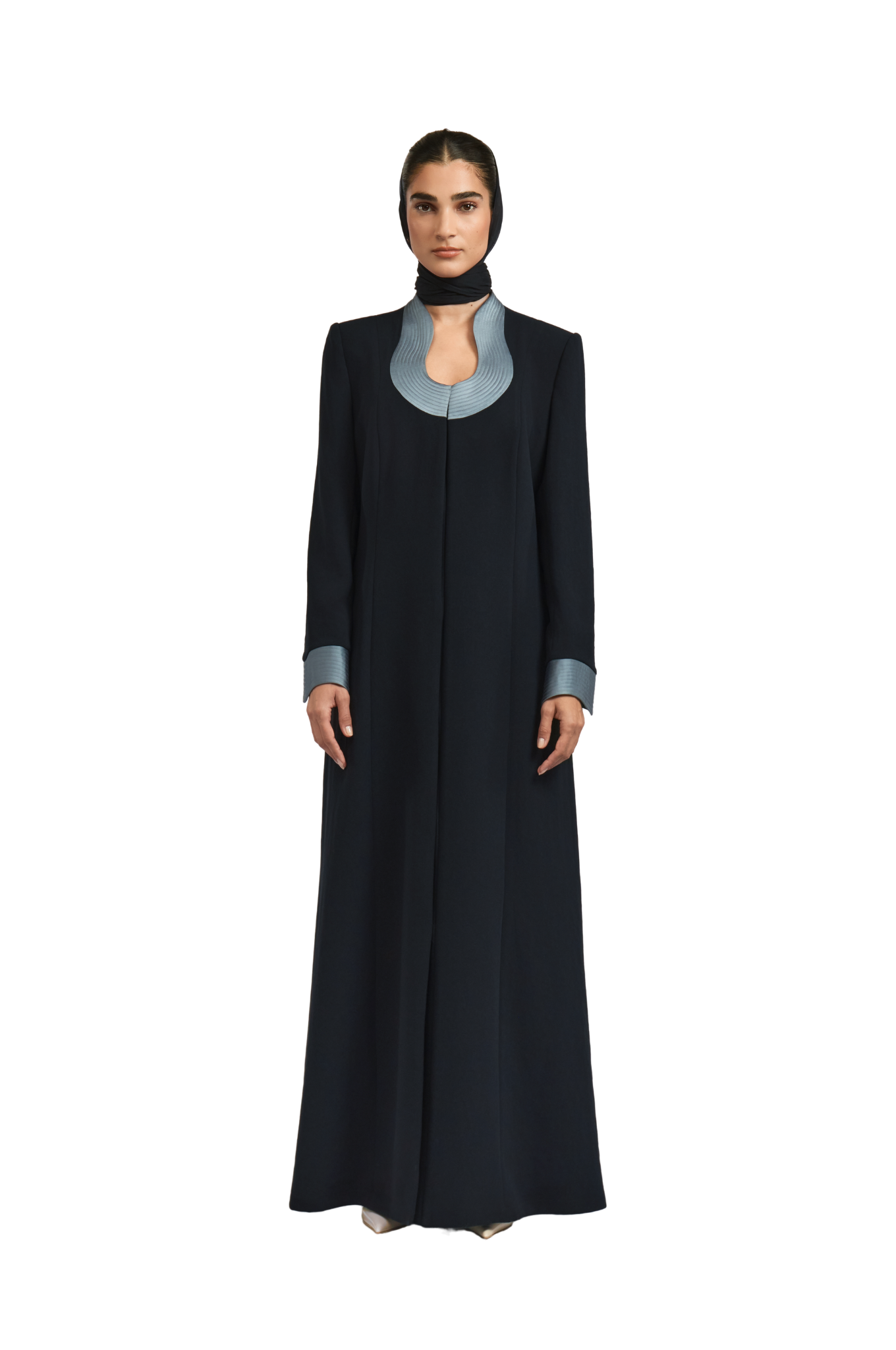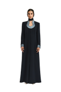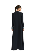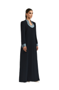 The Leoni abaya offers a refined reinterpretation of the classic A-line abaya with a contemporary edge. Tailored from smooth black crepe, it features padded shoulders and a contrasting U neckline for a striking, balanced look. The flowing A-line silhouette enhances movement, embodying 1309’s distinctive fusion of structured elegance and effortless poise.