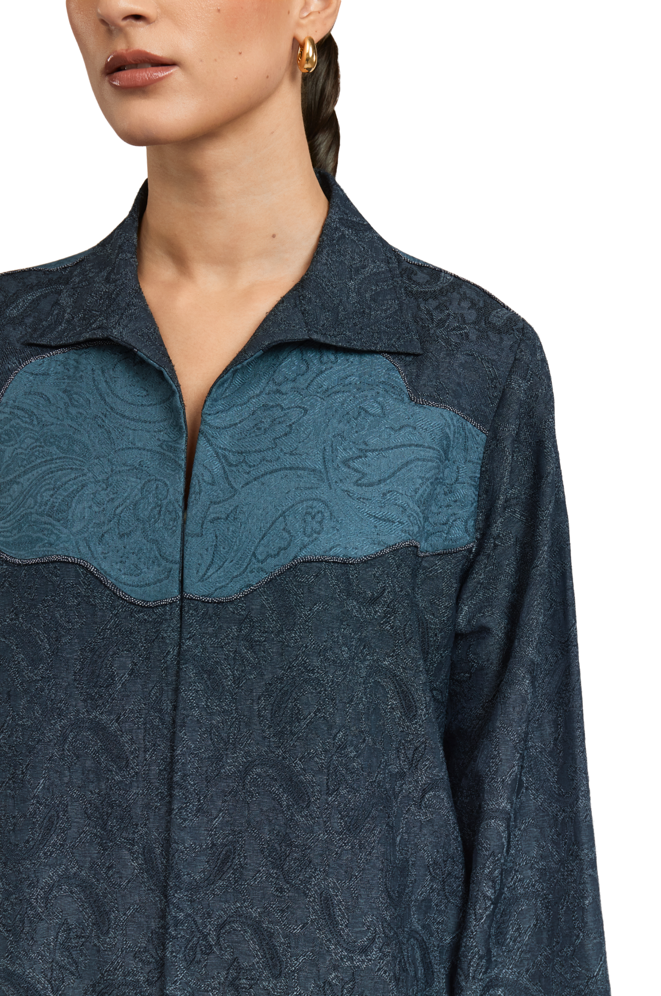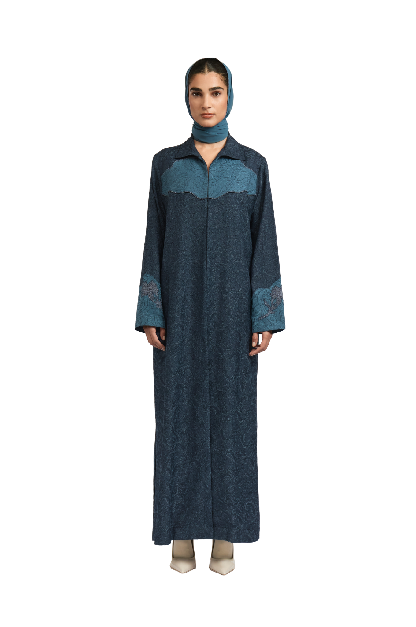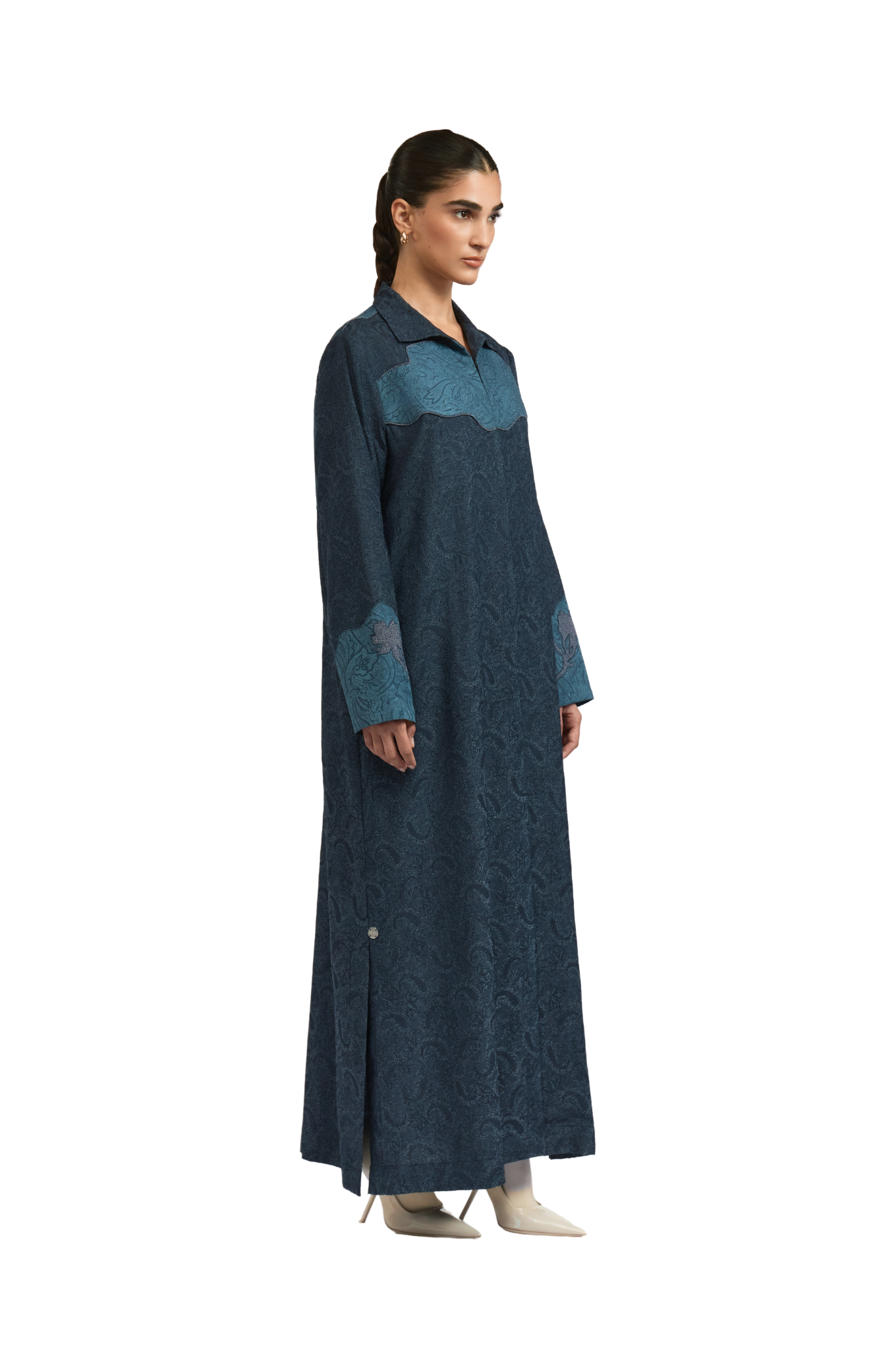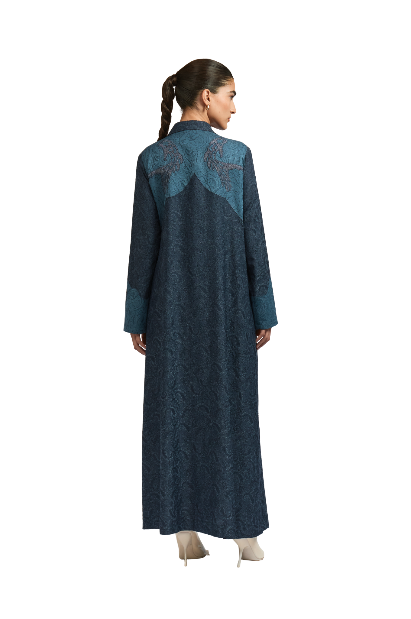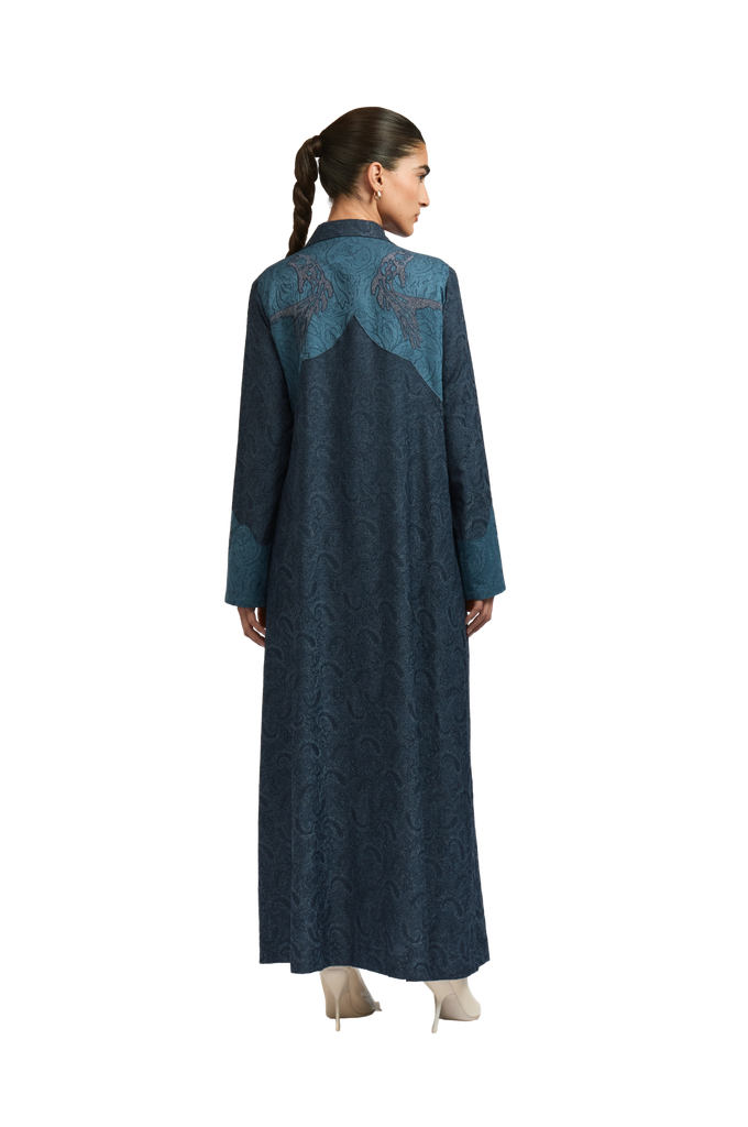 With a straight-cut silhouette, shirt-style lapel, and vent slit, the MONROE Abaya reimagines classic structure with a Western twist. Made from dyed jacquard with a paisley pattern, it features a fish patchwork on the back, floral appliqué on the sleeves, and cross-stitch embroidery throughout.
