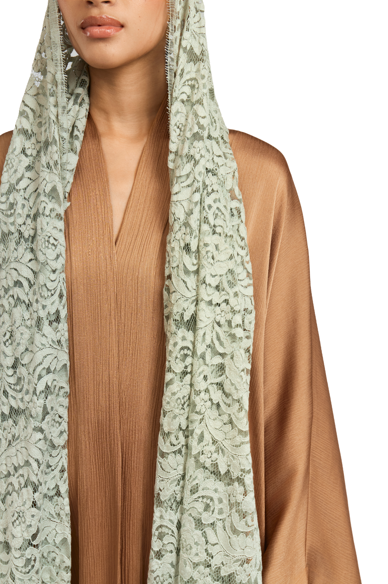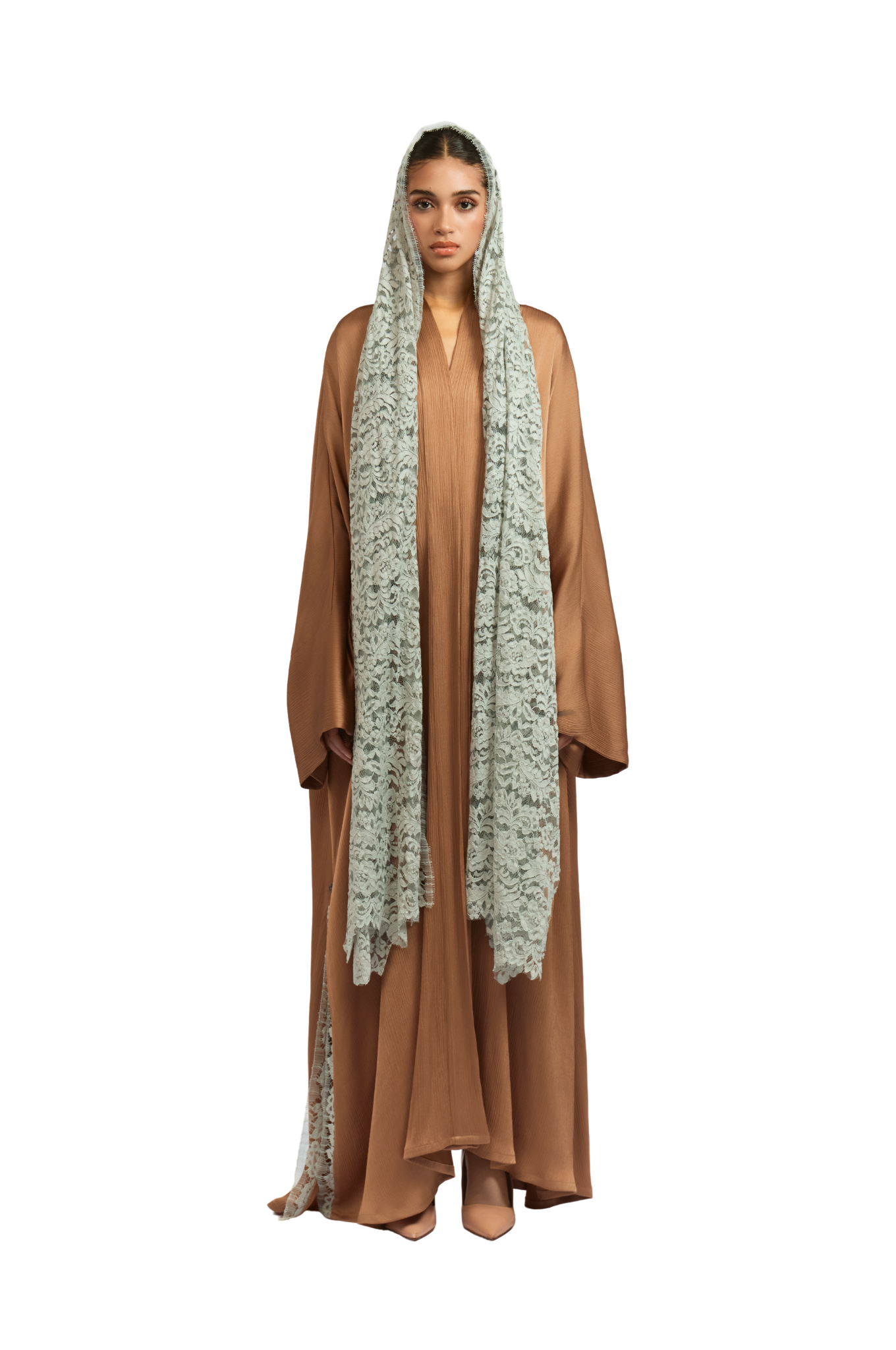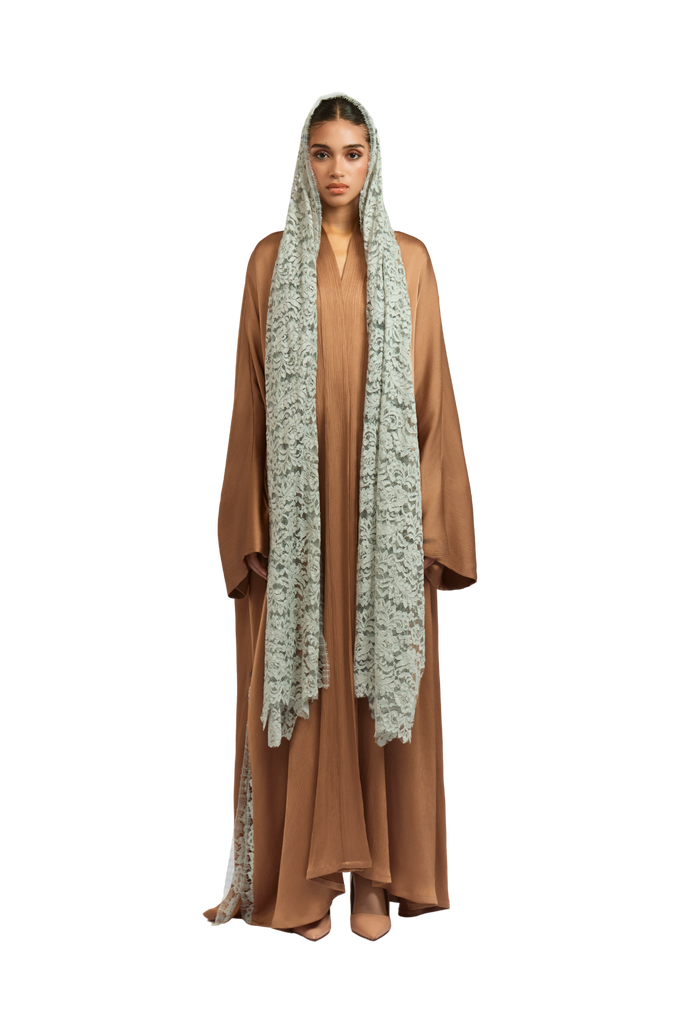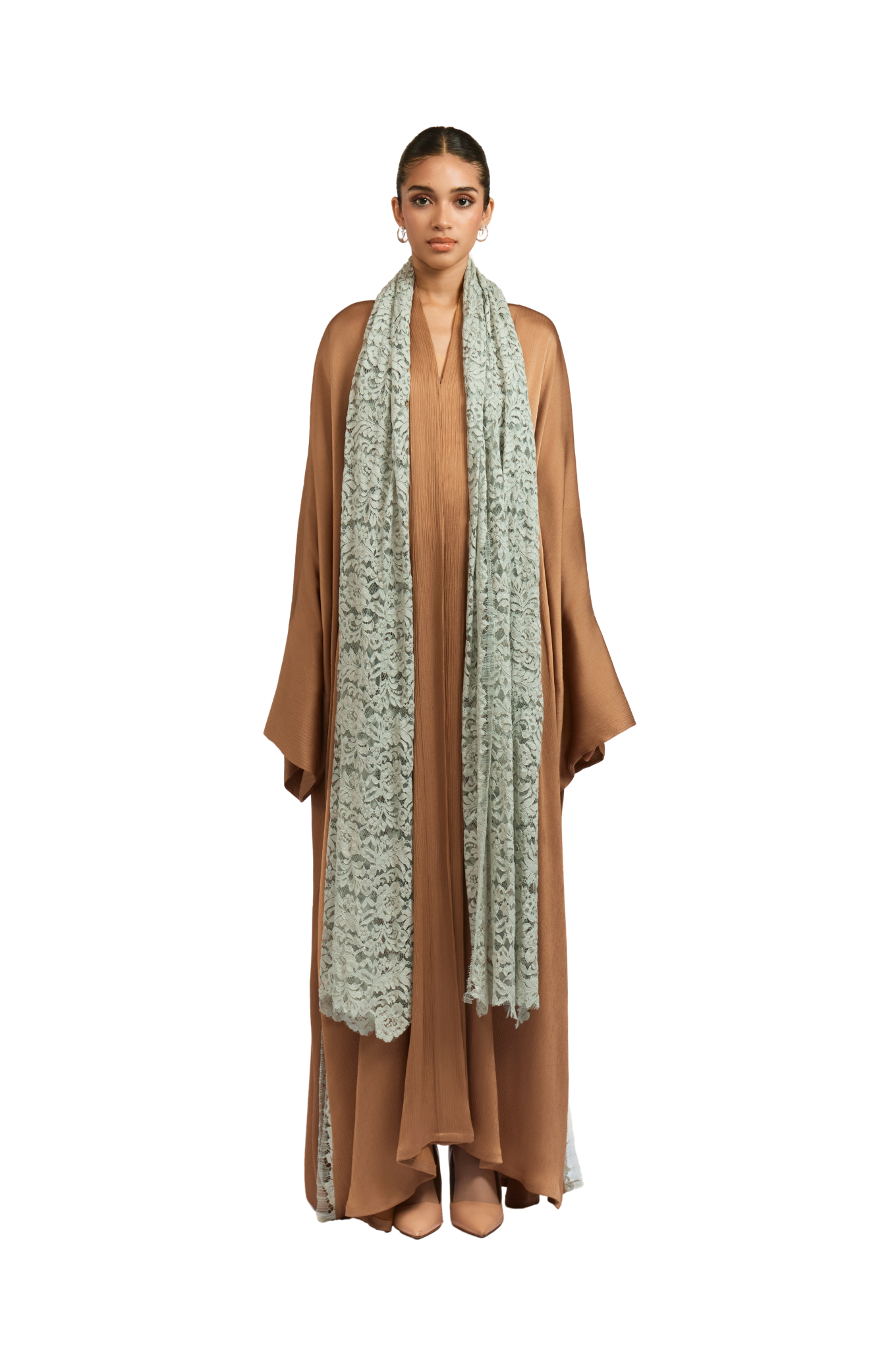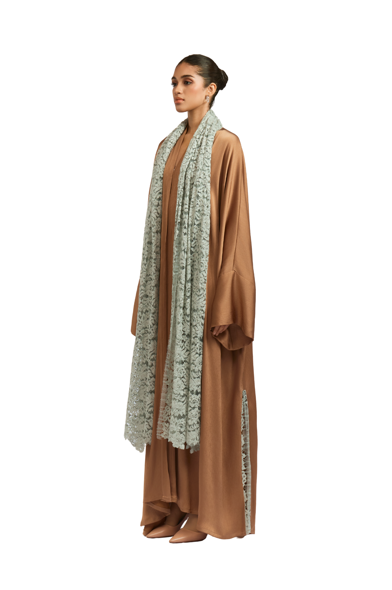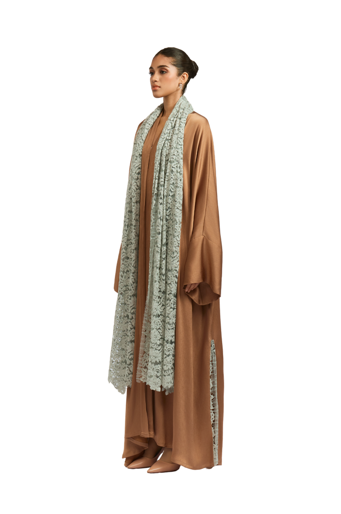 Crafted from premium pleated satin fabric, this nude abaya exudes a smooth, lustrous finish that drapes beautifully on the body. The sophisticated square cut provides a flowing, graceful silhouette, while the attached lace sheila in teal adds a touch of intricate detail. The side slits, enhanced with lace detailing, allow for ease of wear, further elevating the refinement of the design.
