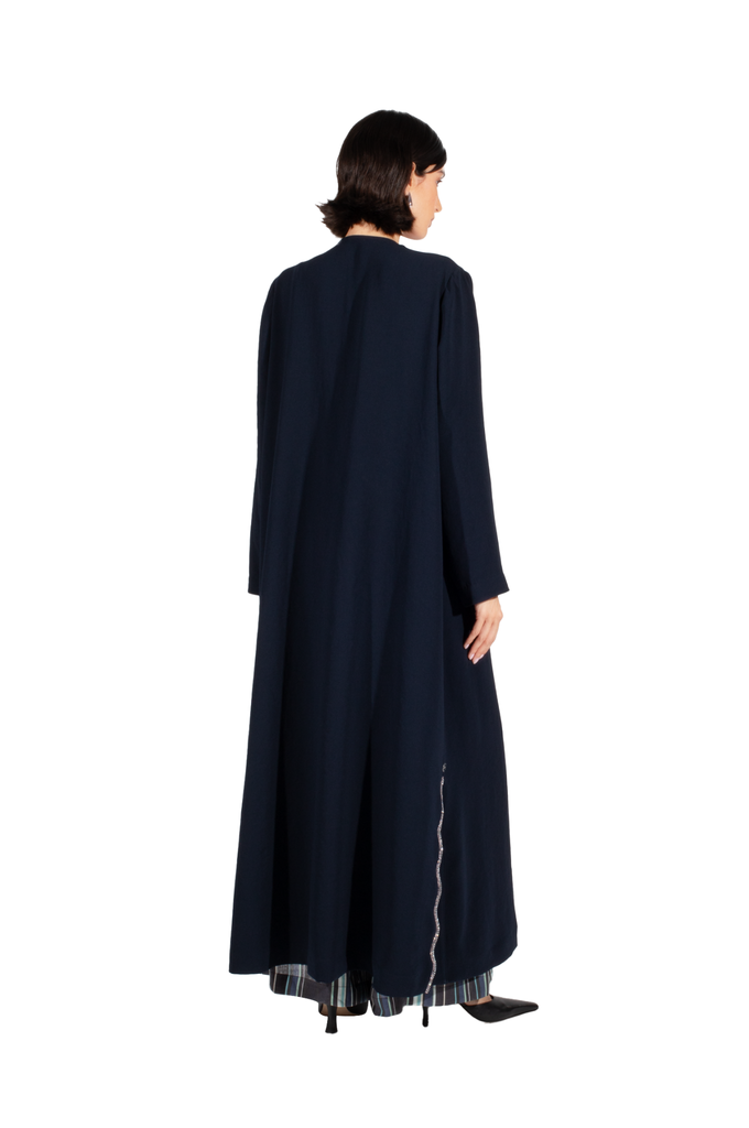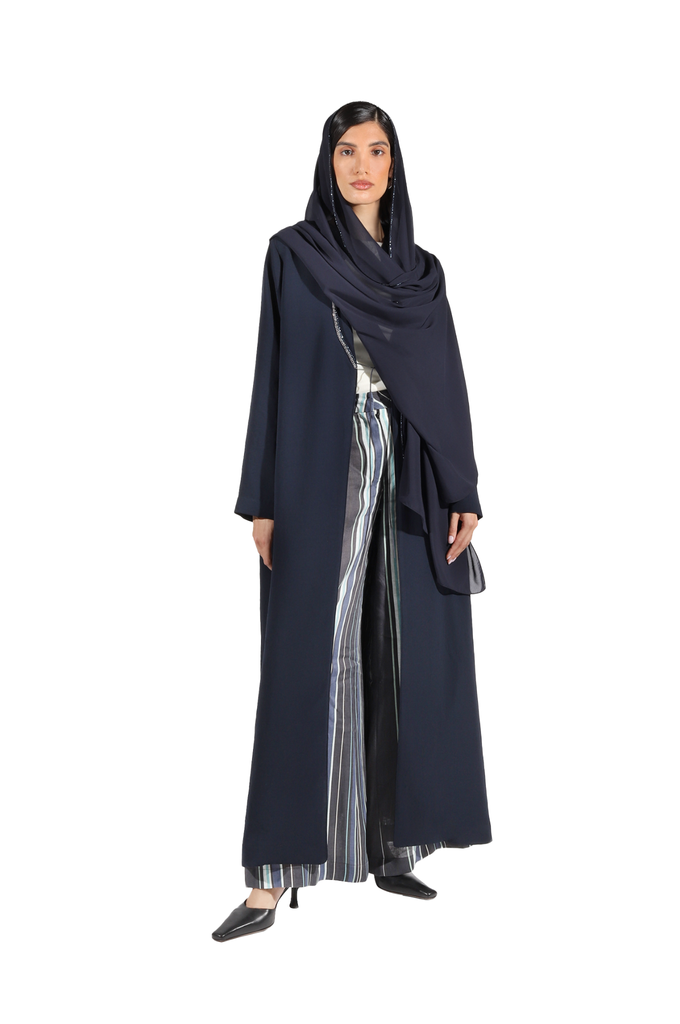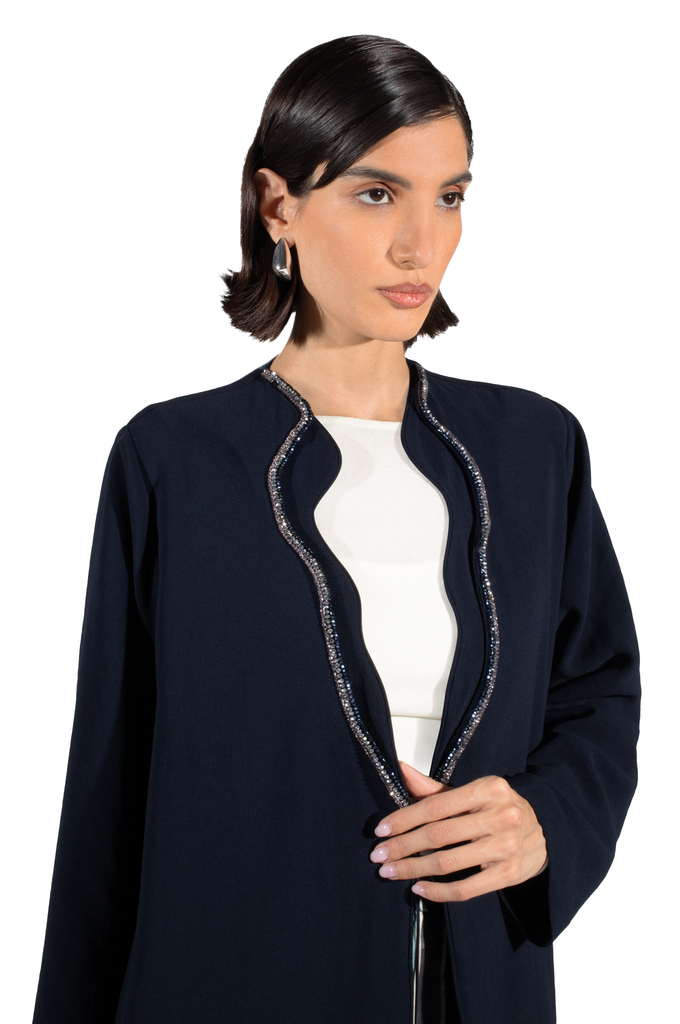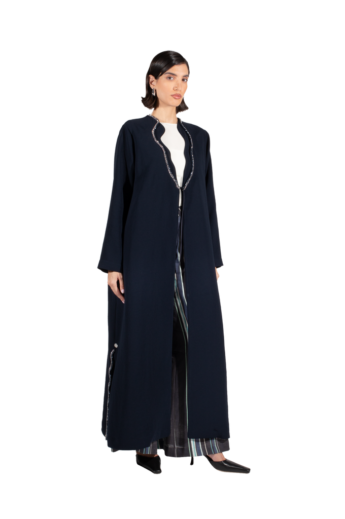Crafted in a rich navy hue, this chic abaya features an abstract double collar neckline, beautifully accented with crystal swirl embroidery along the collar and side slits. Suede drawstrings serve as a subtle closure, adding a soft contrast in texture.