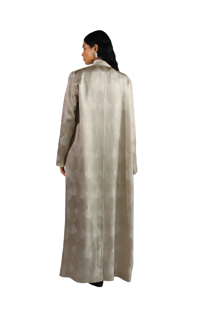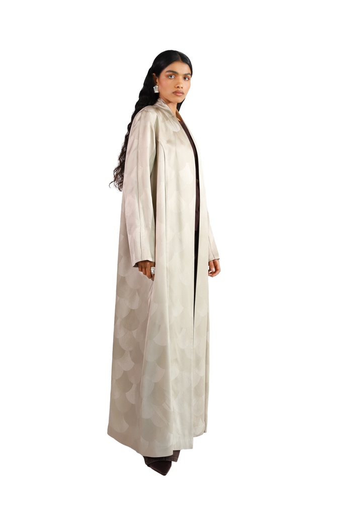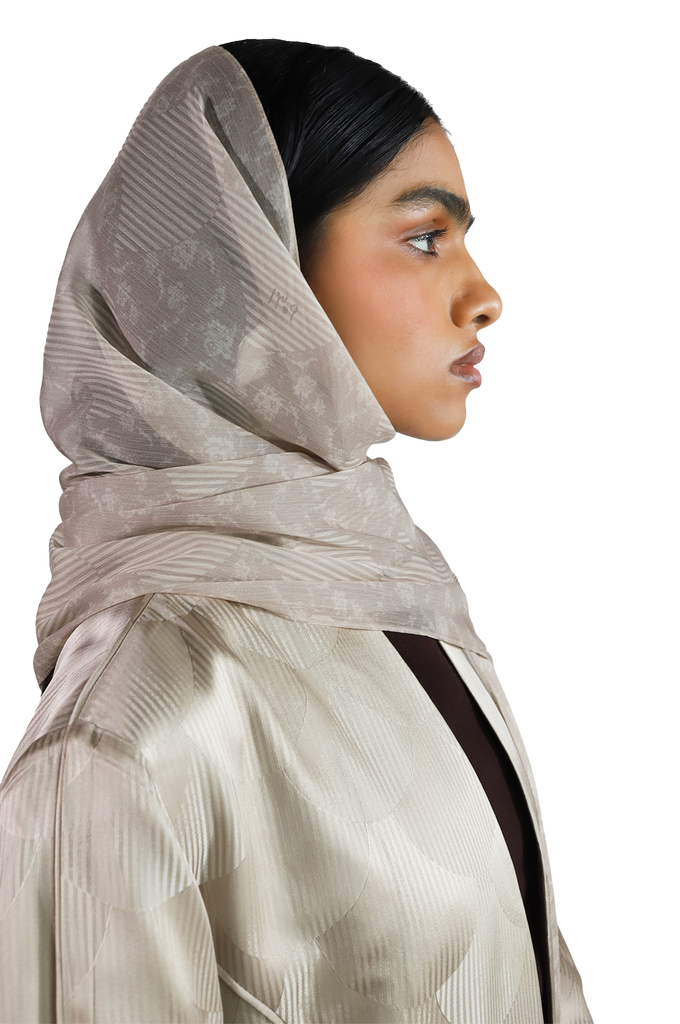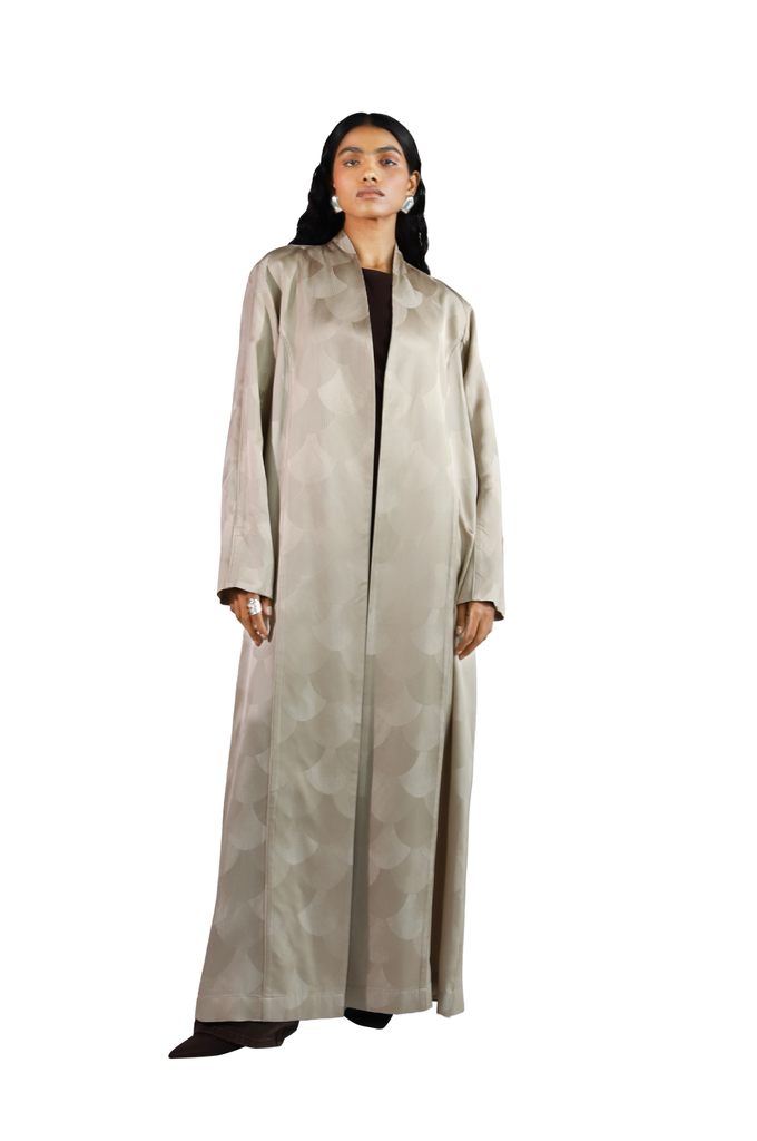 Designed as a feminine and statement-making piece for special occasions, the Penelope abaya features a straight-cut silhouette crafted from luxurious woven silk fabric. The seamless Japanese fan motif, embossed on the sheen base, adds a sophisticated touch of luster and intricate design. In beige, the soft, warm tone creates a light, airy feel, allowing the fan motif to stand out delicately, adding subtle sophistication to the overall look.