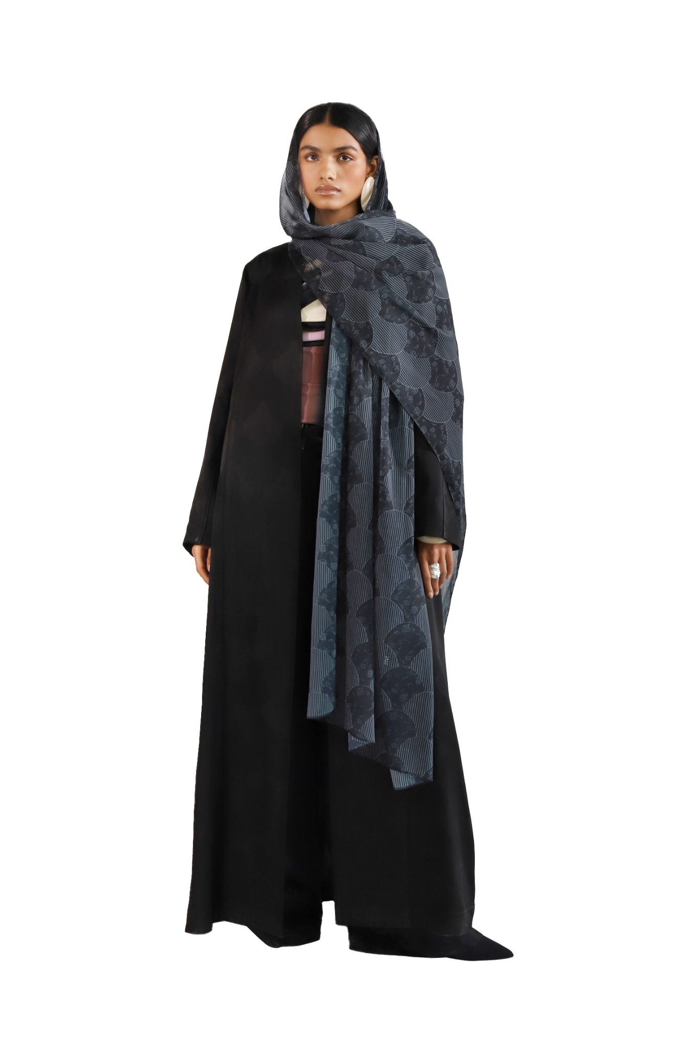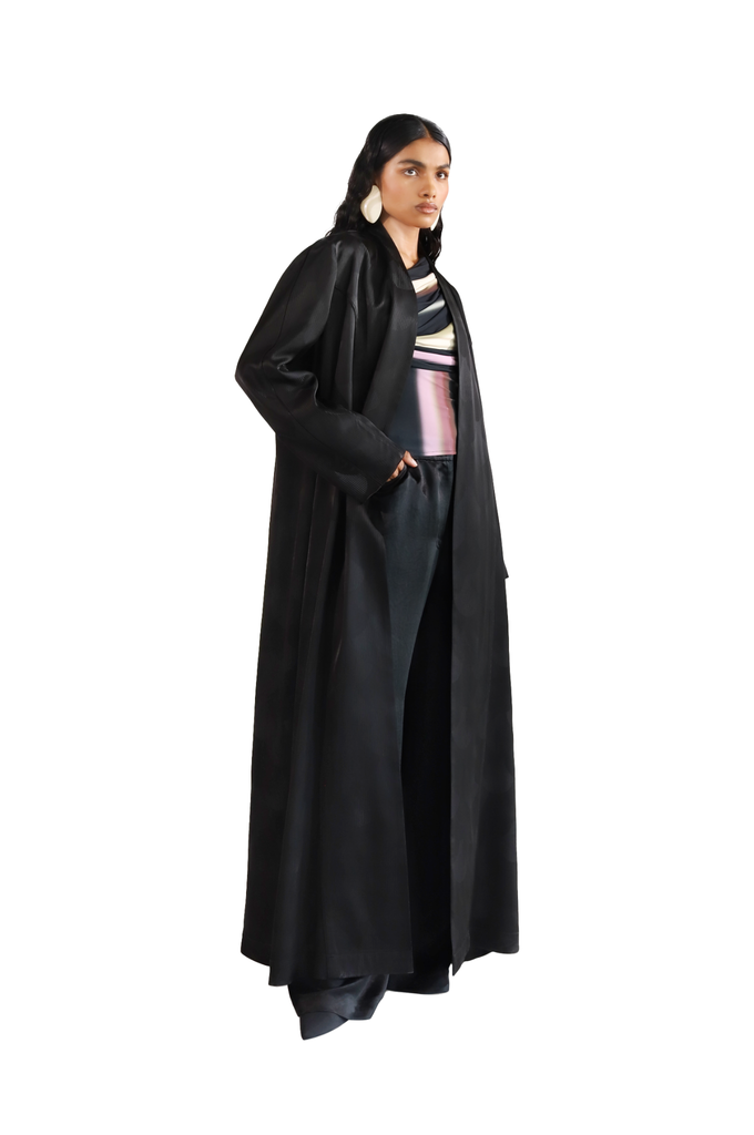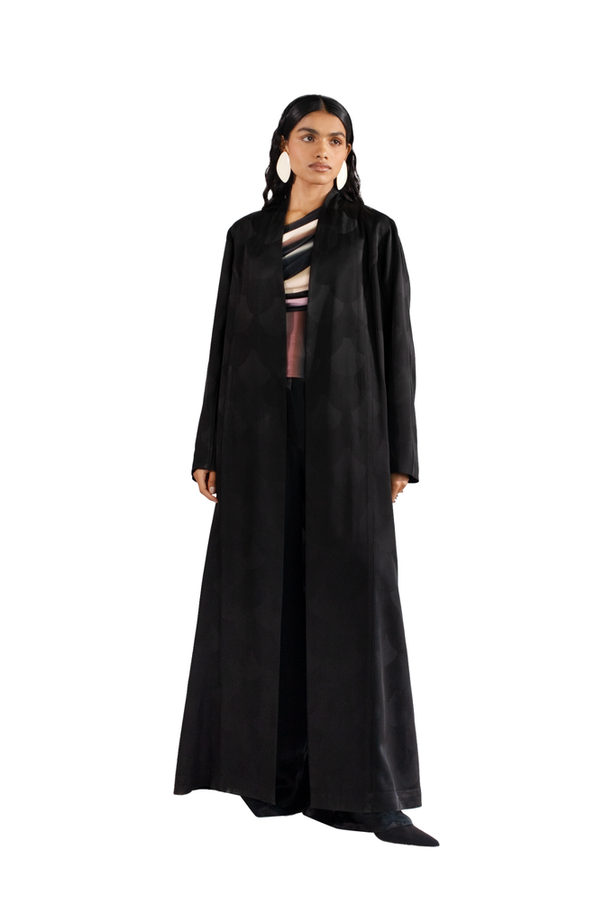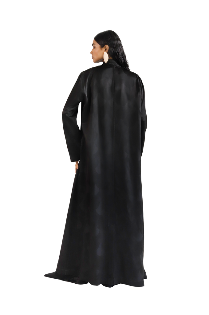 Designed as a feminine and statement-making piece for special occasions, the Penelope abaya features a straight-cut silhouette crafted from luxurious woven silk fabric. The seamless Japanese fan motif, embossed on the sheen base, adds a sophisticated touch of luster and intricate design. In black, the deep hue provides a timeless backdrop, allowing the fan motif to stand out with understated elegance.