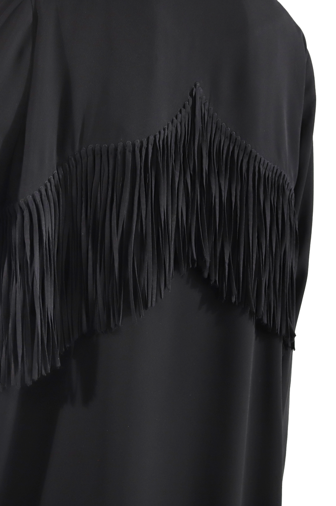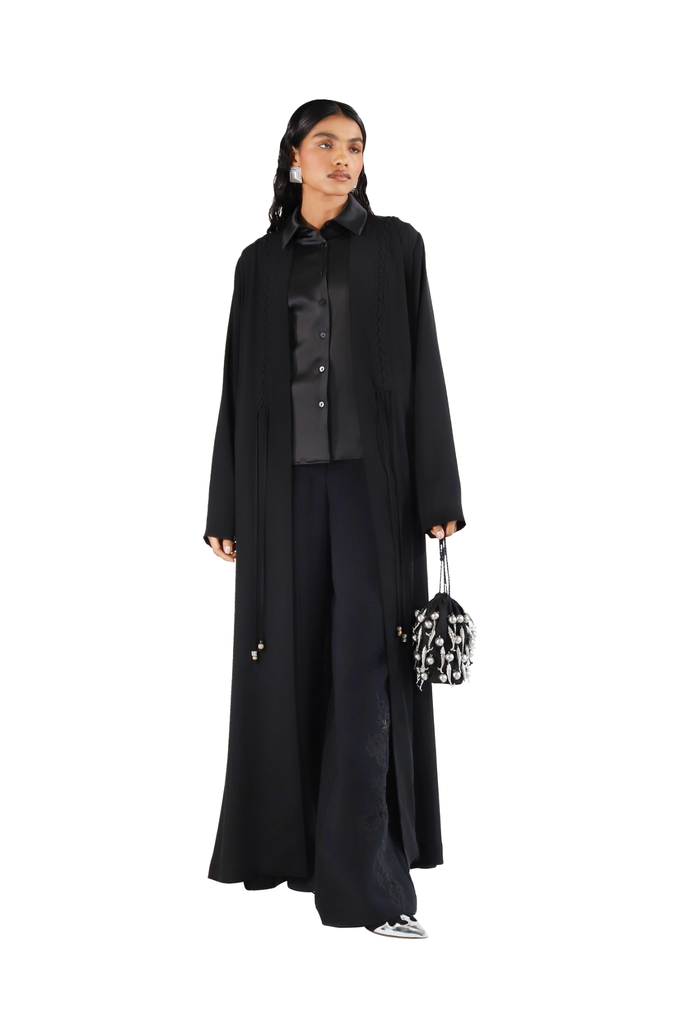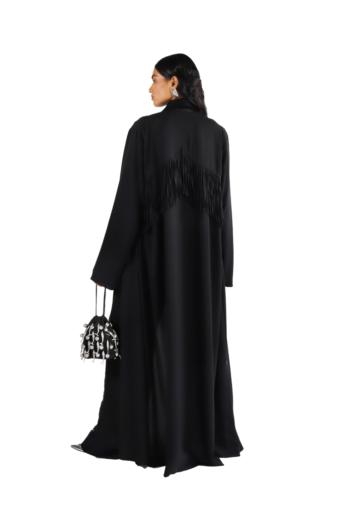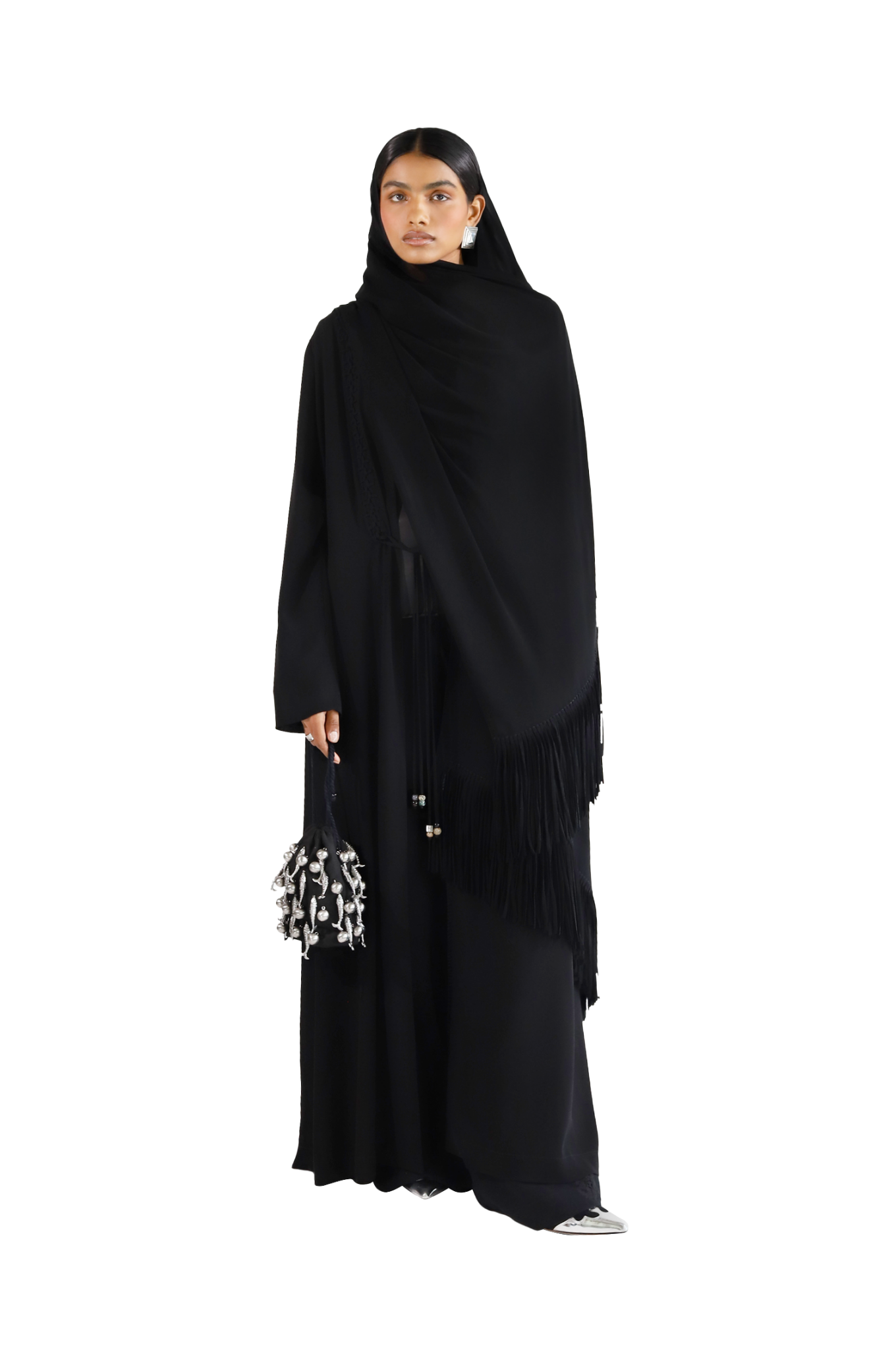 The Serena abaya flows in an elegant A-line silhouette, tailored from lightweight black crepe for a fluid, graceful drape. Braided and beaded accents embellish the front, adding depth and artisanal detail, while soft fringes cascade along the back—creating a striking interplay of texture and movement.