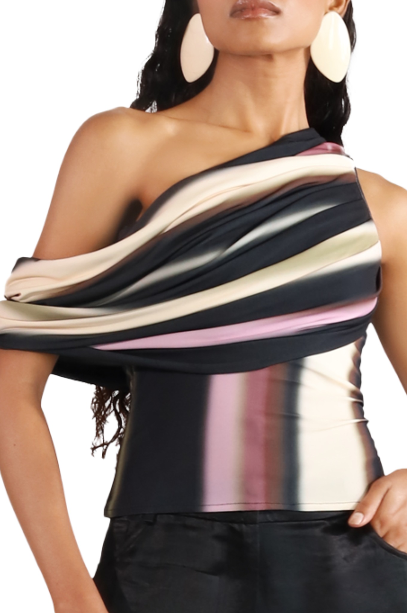 crafted from soft jersey fabric, this draped off shoulder top blends comfort with striking multi-tone elegance.