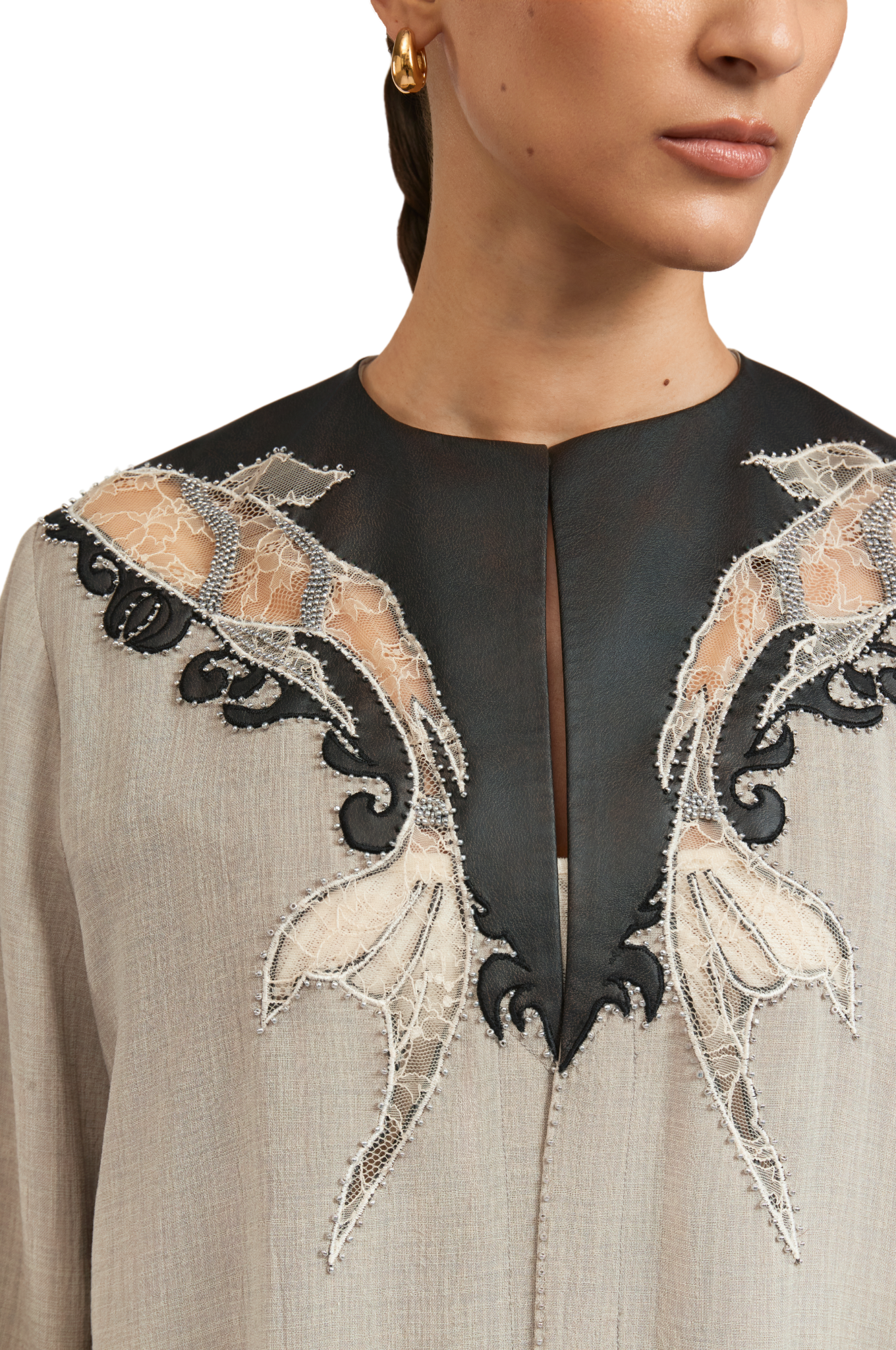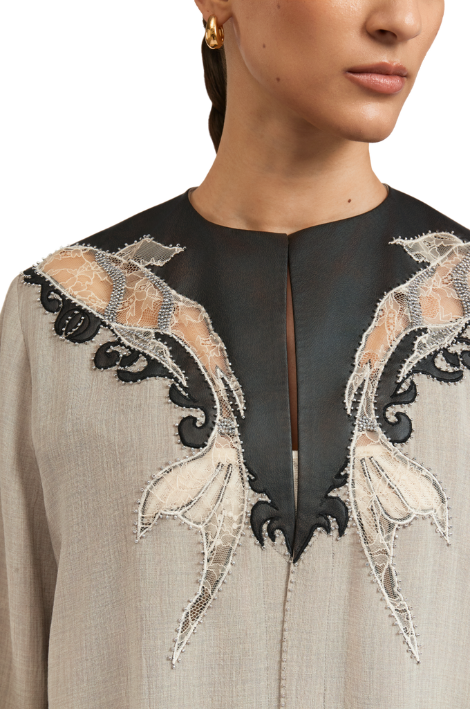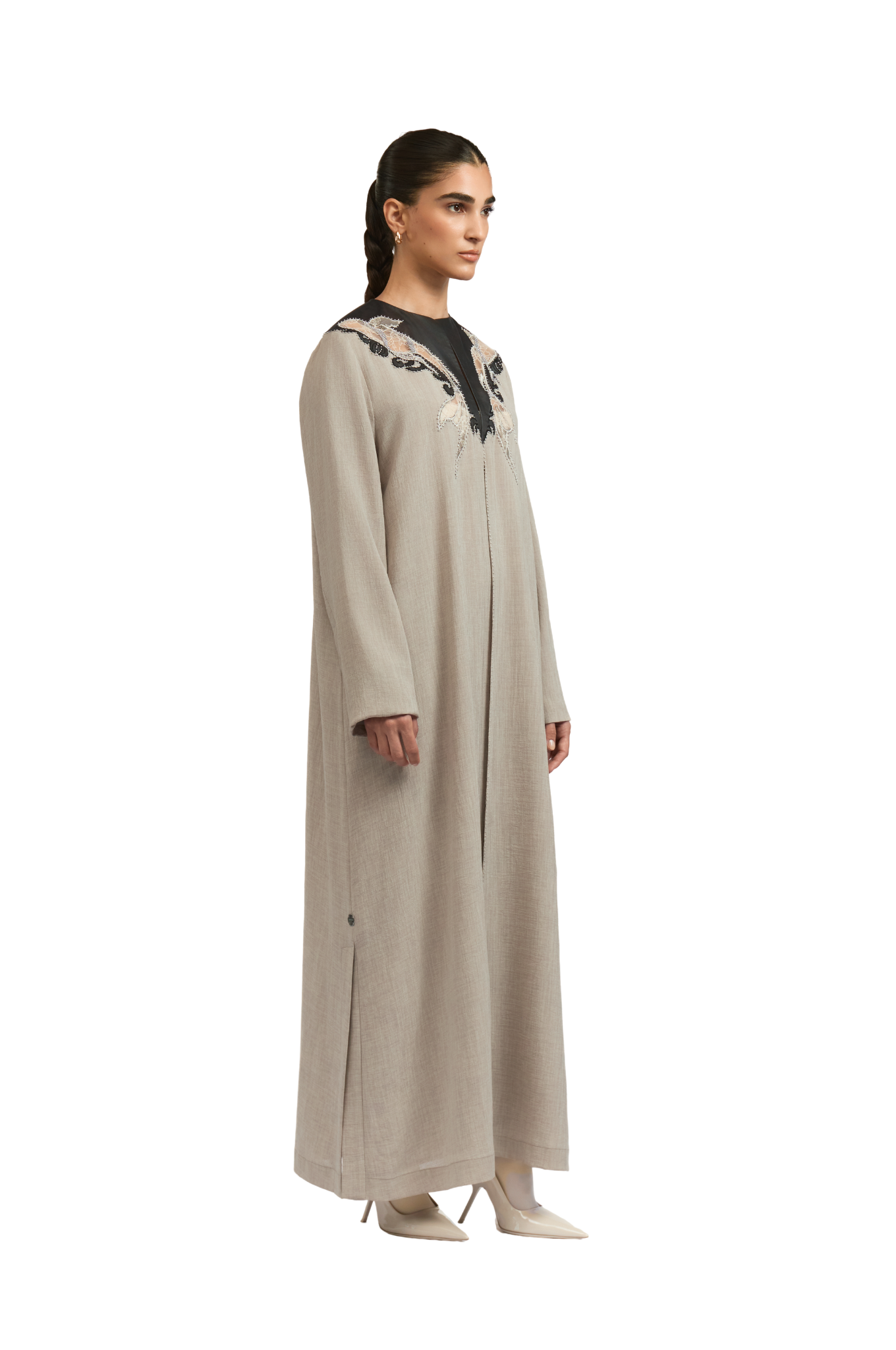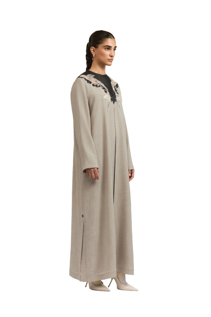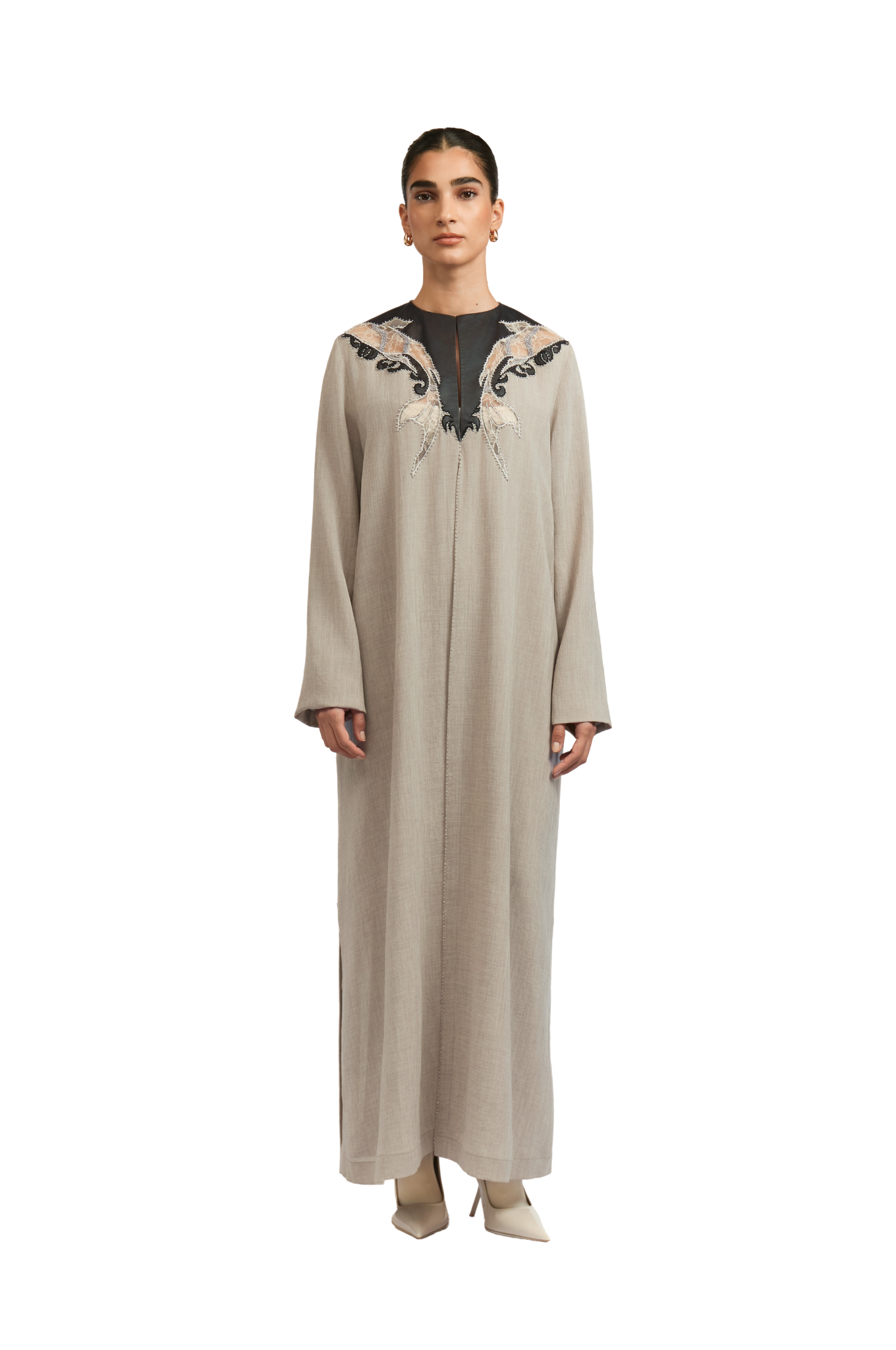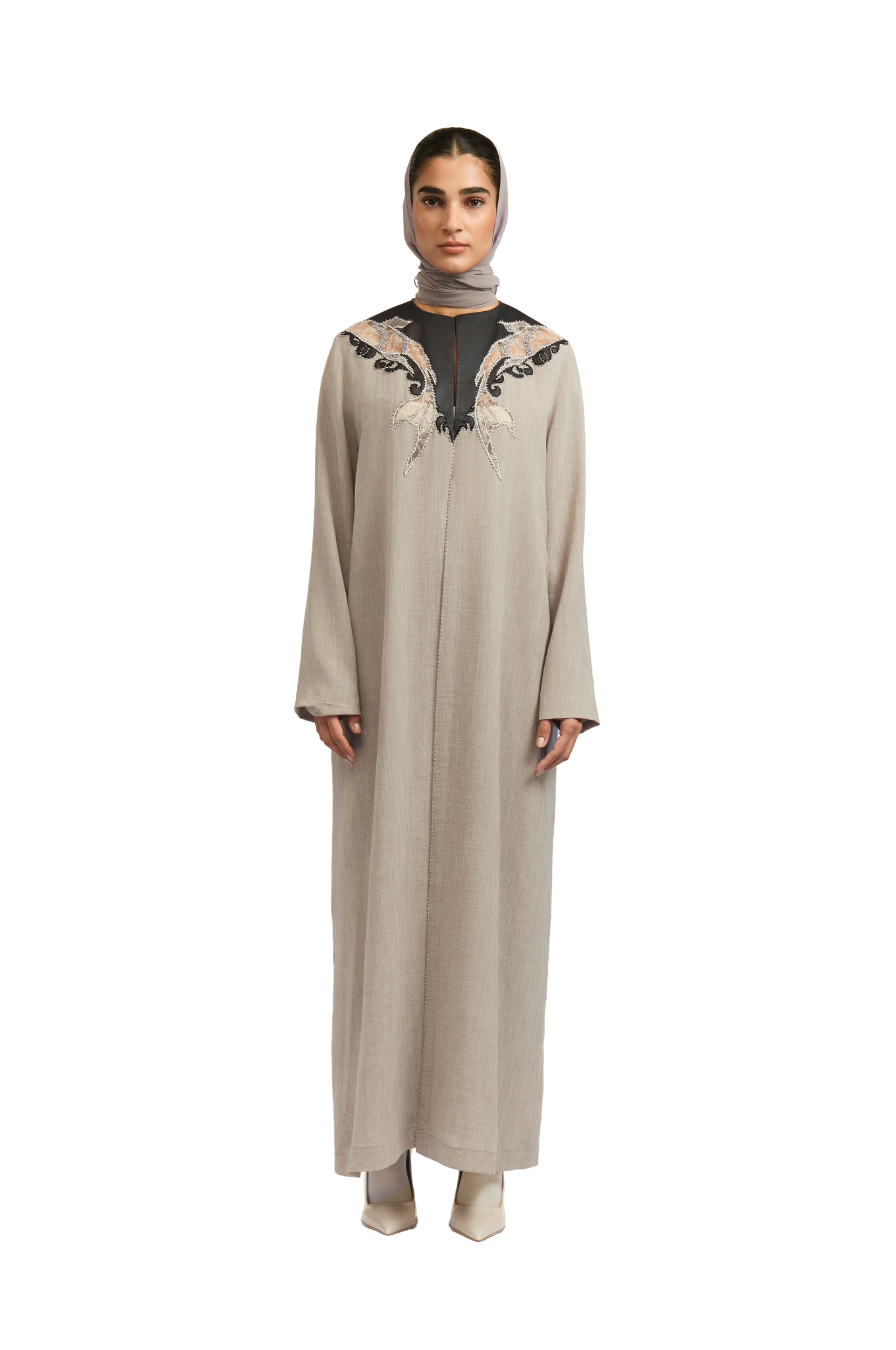Crafted from luxurious beige linen, this abaya features a straight cut silhouette, enhanced by a unique western-inspired patchwork design. The focal point is a meticulously crafted fish motif, made from soft leather, delicate lace, and beaded accents. The fusion of bold, artistic elements with intricate craftsmanship creates a one-of-a-kind piece, blending innovation with effortless sophistication.