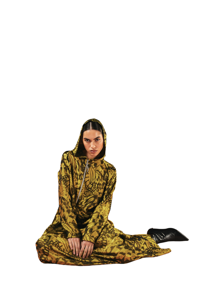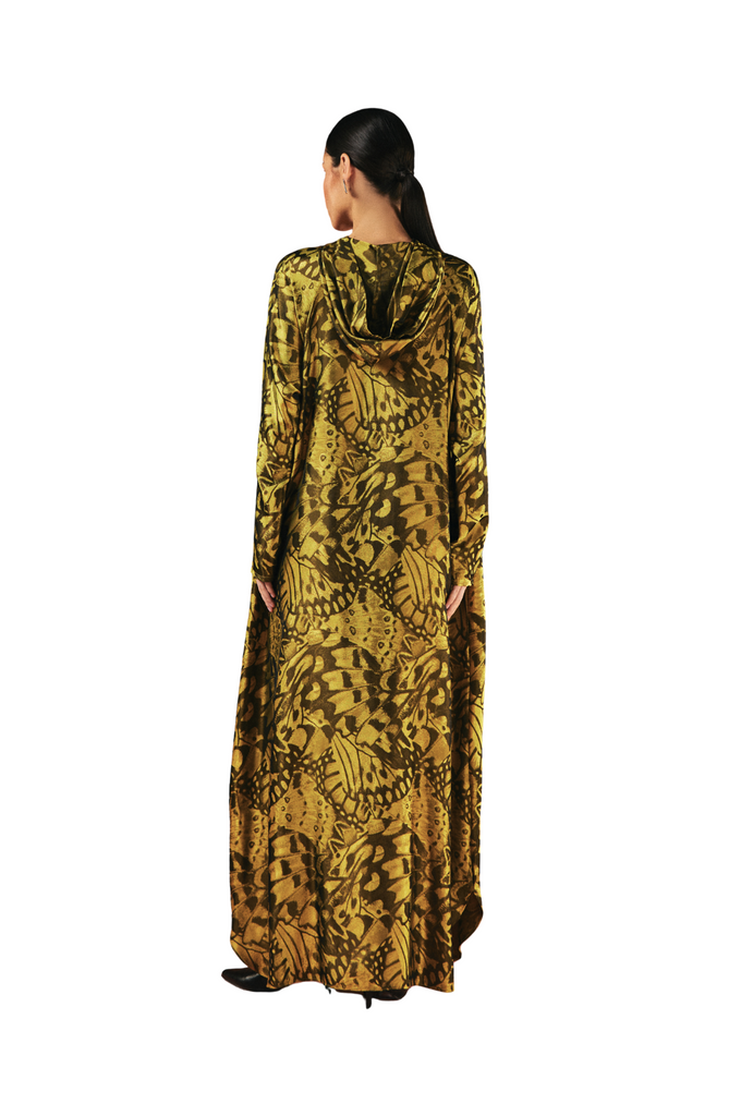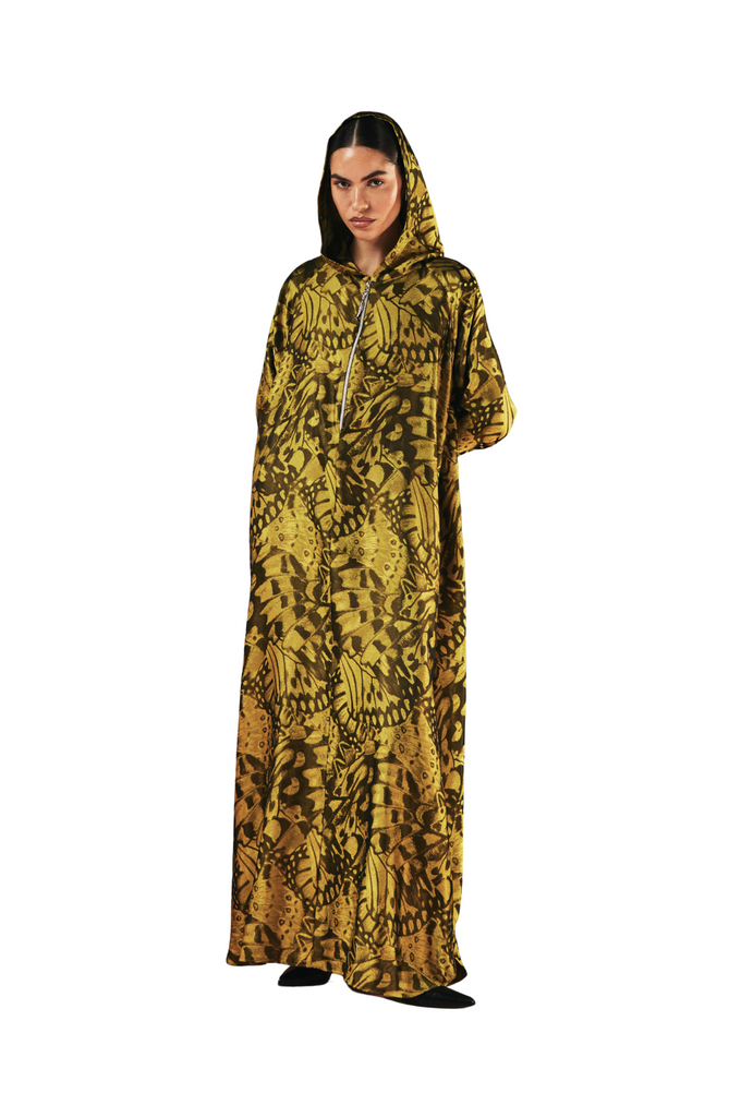 This bold kaftan features an abstract butterfly print in yellow and black, with raglan sleeves and a cozy hood. The custom 1309 zipper adds a modern touch, blending artistic flair with contemporary style.