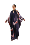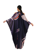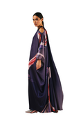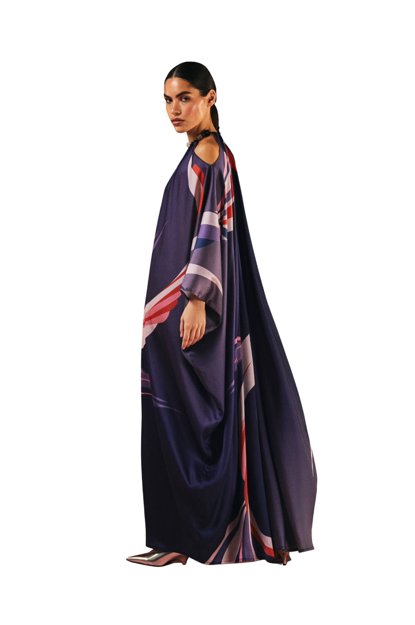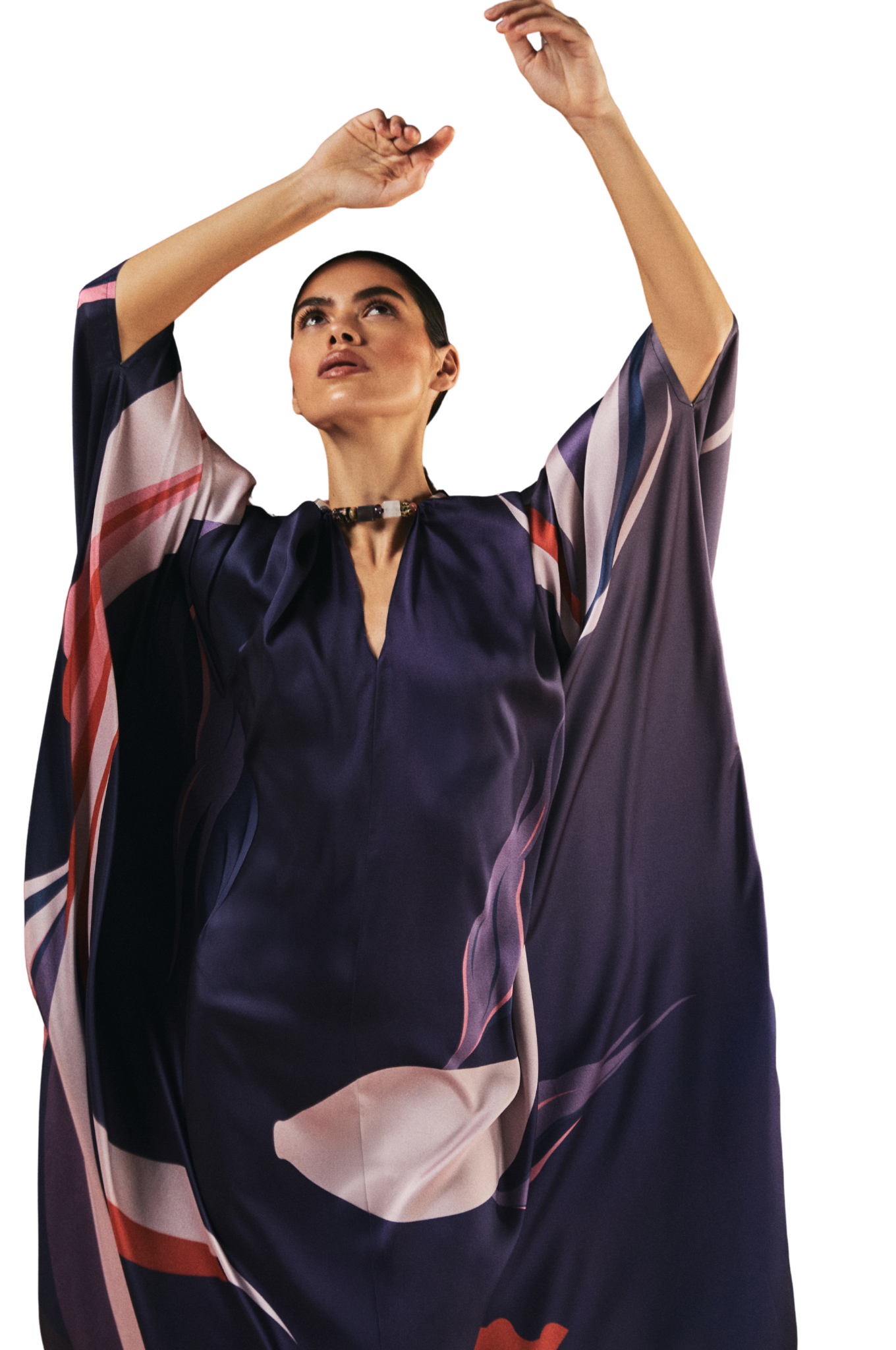 This stunning kaftan, crafted from luxurious silk twill, features an exclusive 1309 in-house fish print that evokes the fluid elegance of aquatic life. The rhythmic, flowing design complements the v-neckline, shoulder cutouts, and an attached beaded choker, blending artistry with modern sophistication.