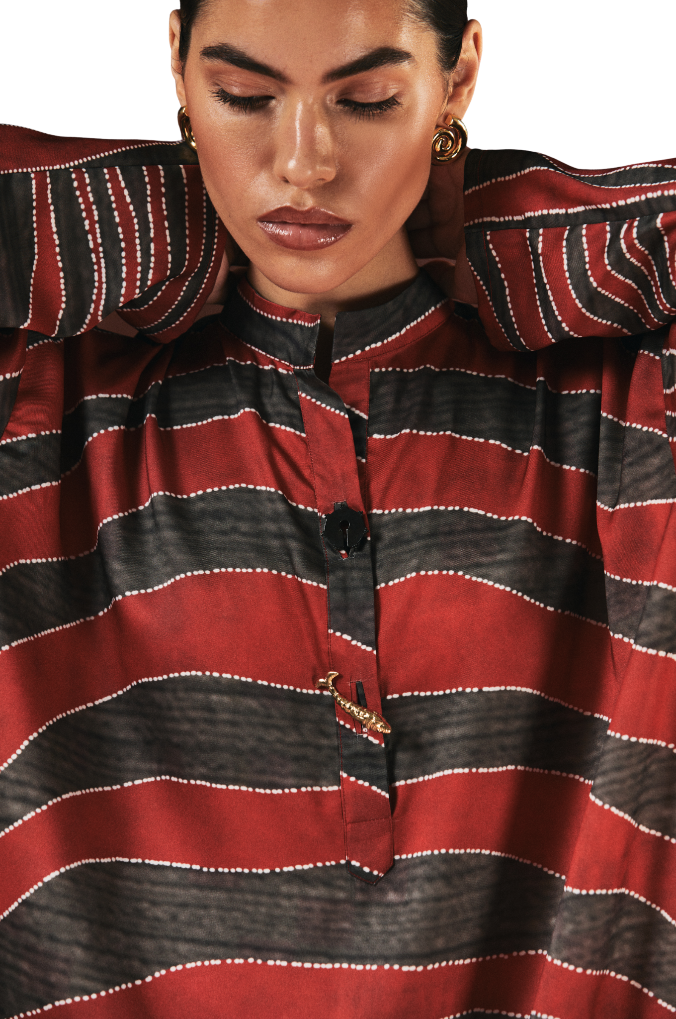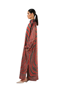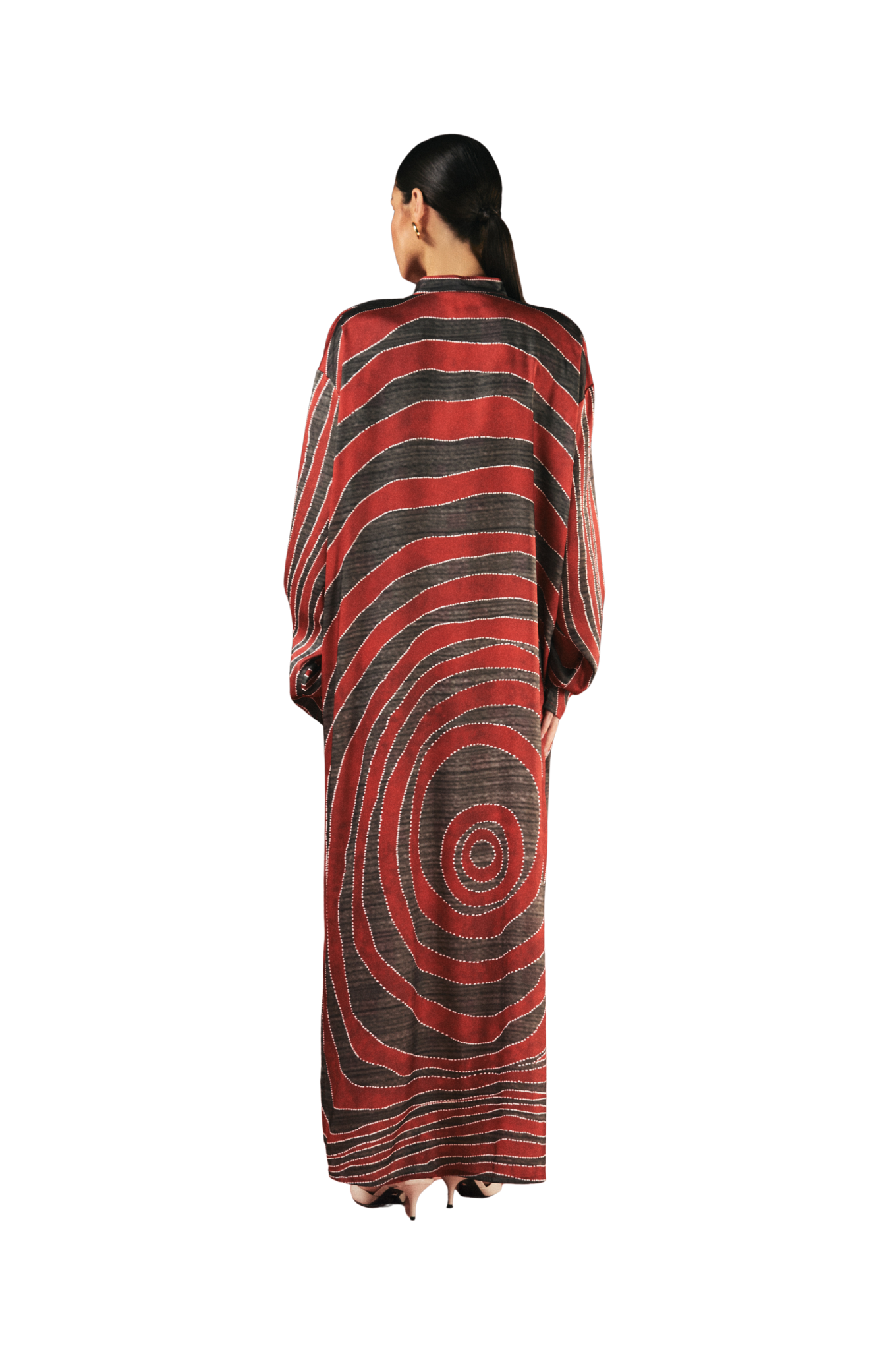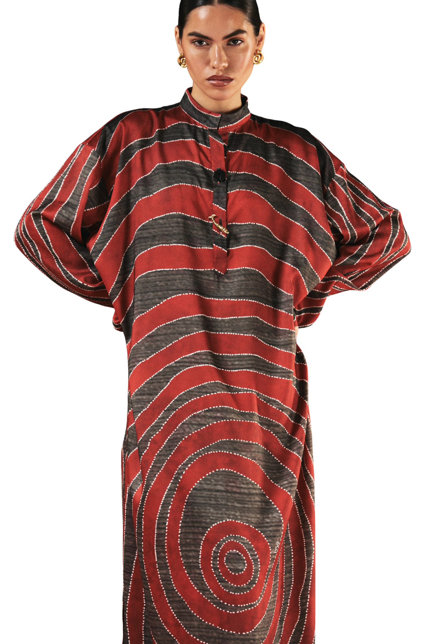 This thobe is both chic and comfortable, making it ideal for dressing up or down. It is cut from a luxurious red 1309 in-house print, featuring a captivating abstract swirl that weaves together fluid, dynamic shapes, creating a sense of movement and artistry. The design is both intricate and bold, adding a unique, creative dimension to the piece. Adorned with custom 1309 buttons as part of the new season, this thobe effortlessly blends sophistication with modern flair.