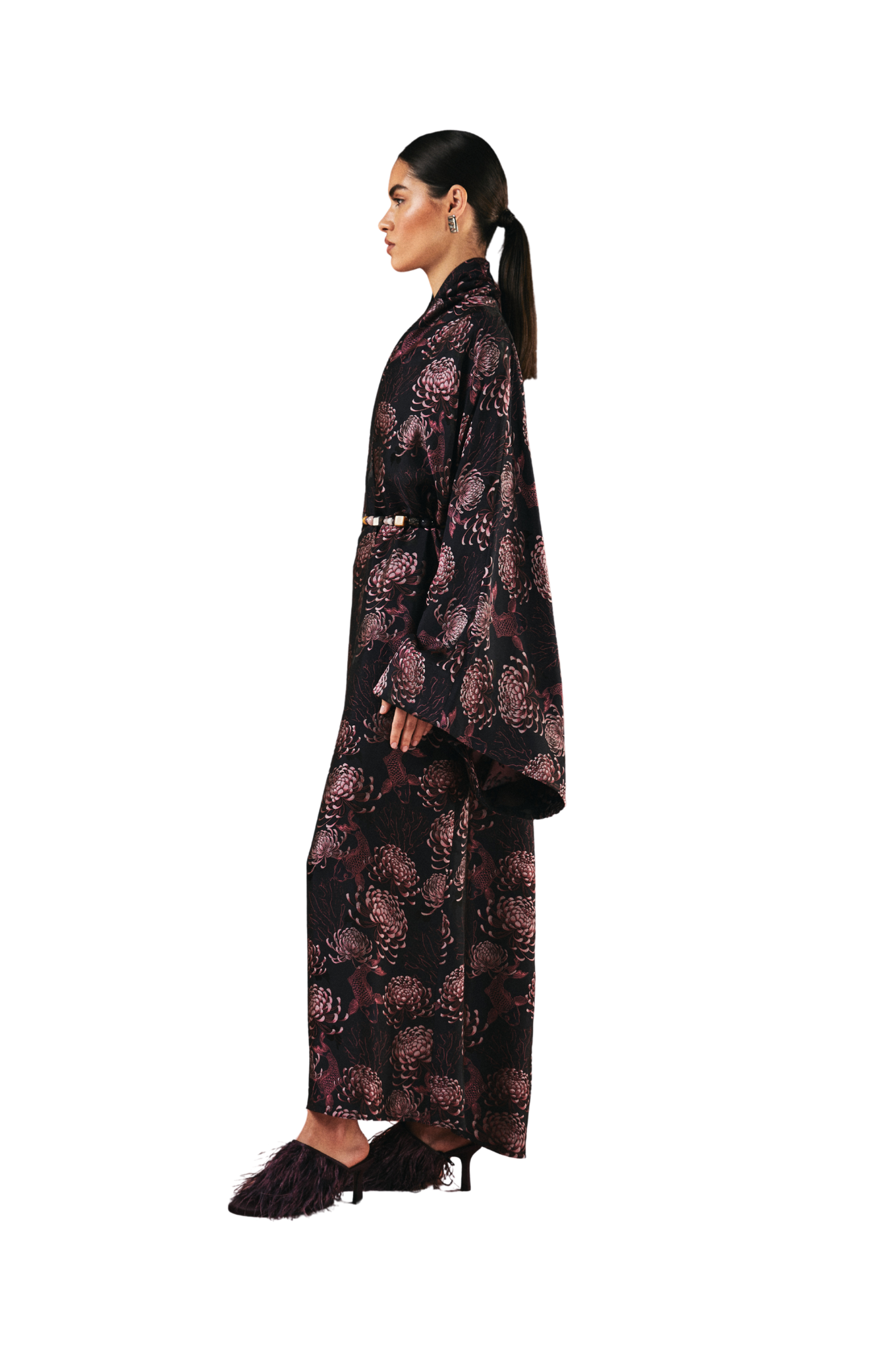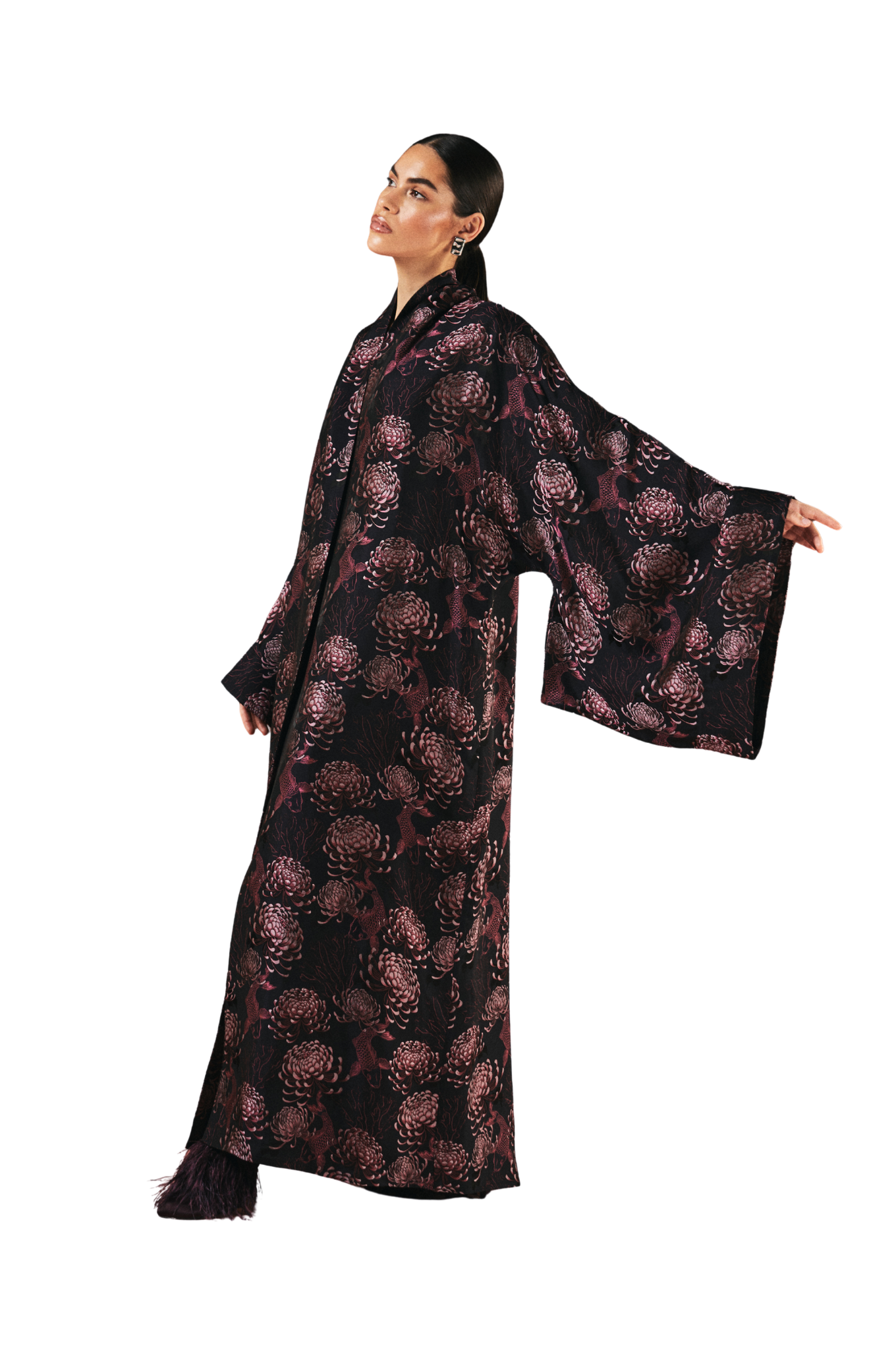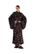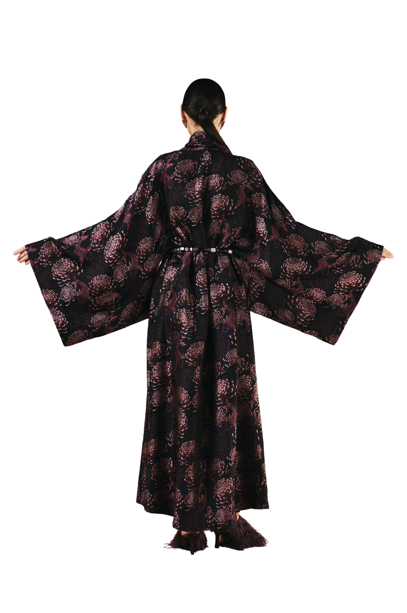 This elegant kimono features a striking koi fish print in rich black and soft pink tones, creating a beautiful contrast that captures the essence of tranquility and movement. Styled with a 1309 beaded belt, it cinches the waist and adds a touch of refined detail. The flowing silhouette and delicate design make it a perfect blend of traditional style and modern flair, ideal for adding a touch of artistic sophistication to any wardrobe.
