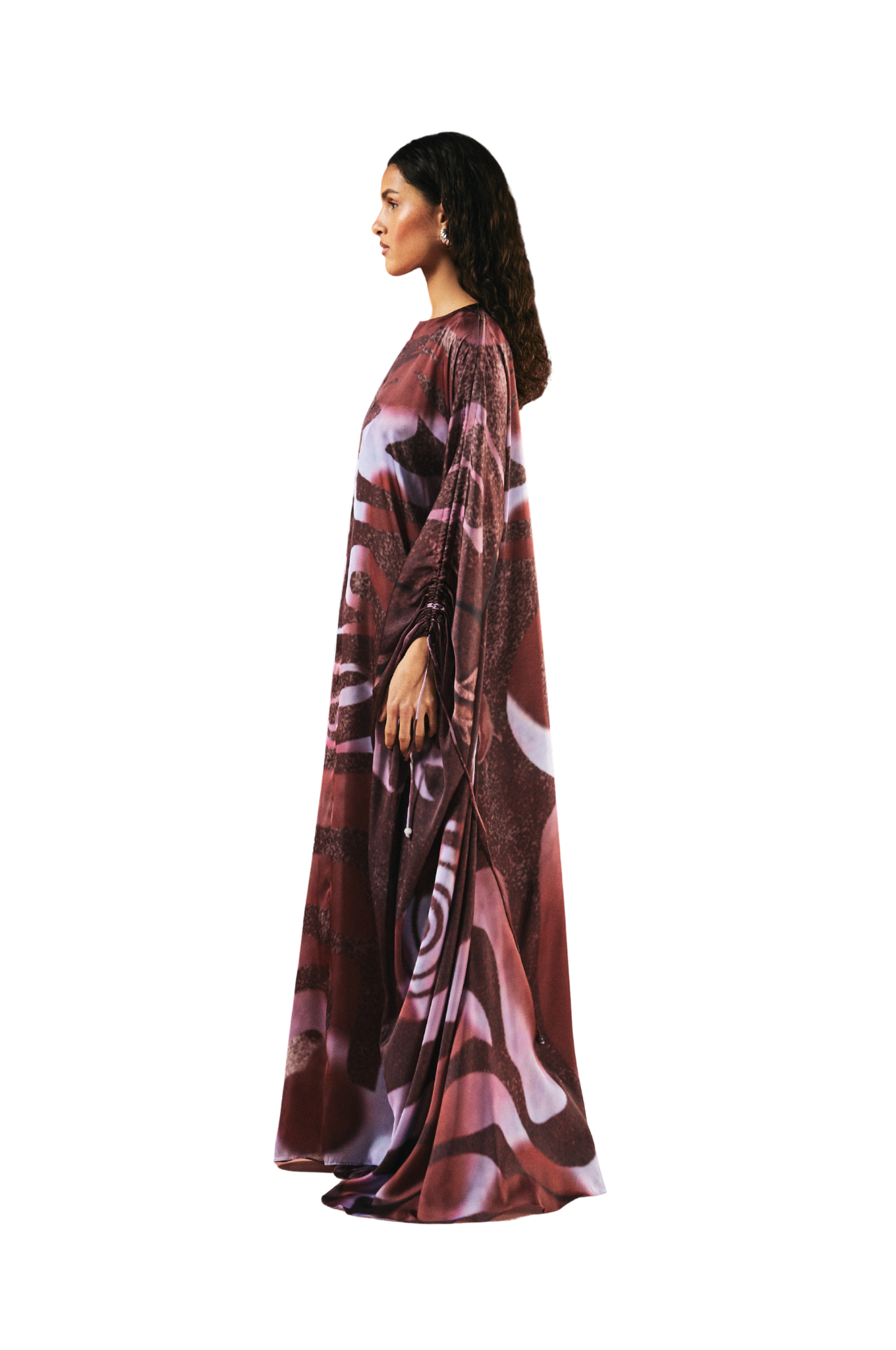 A cozy dress crafted from luxurious polytwill, featuring a full abstract print in serene pink tones that evokes the tranquil yet dynamic essence of the ocean. The design is enhanced with cut-outs on each side, adding a unique and intriguing detail. Ruched shoulder seams, adorned with charming accents, elevate this piece for any occasion. Beaded cords add a touch of intricate elegance, while adjustable-length sleeves offer a customizable fit.