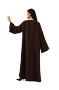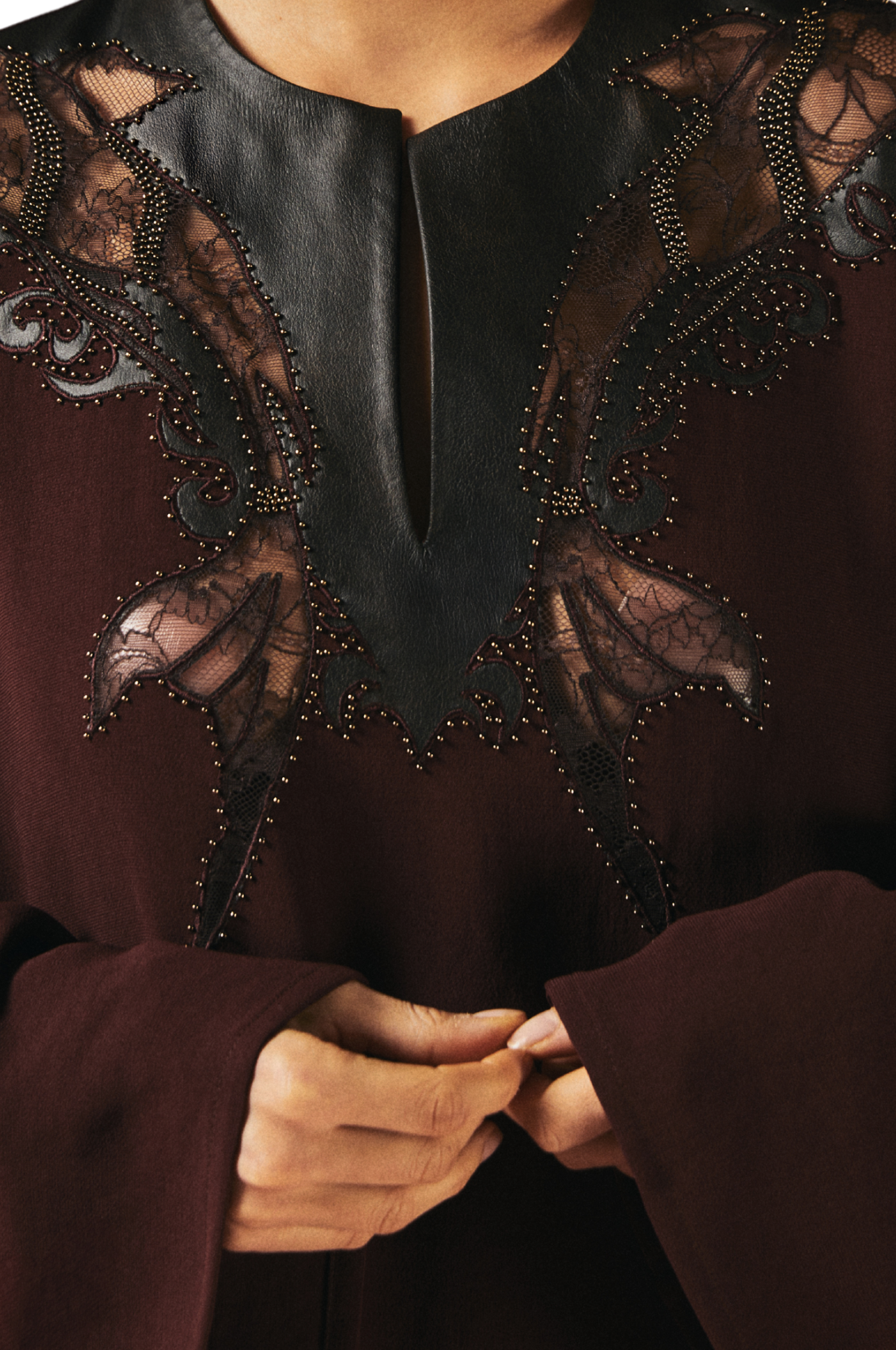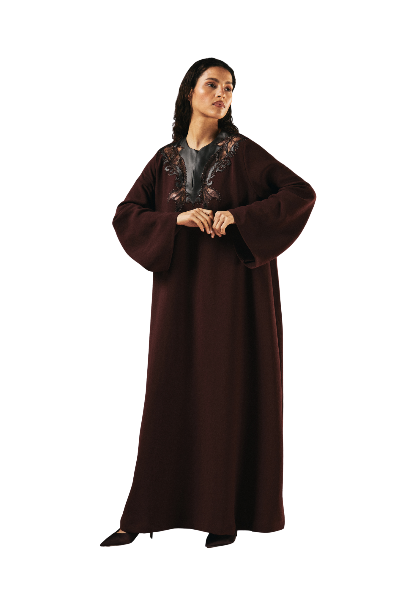 This kaftan is crafted from a rich texture brown fabric, exuding a modern yet timeless elegance. The v-neckline adds a flattering touch, enhancing the silhouette. The design is enriched with a unique western-inspired patchwork, featuring a fish motif meticulously crafted from soft leather, delicate lace, and beaded accents. The fusion of bold patterns with intricate craftsmanship creates a one-of-a-kind piece, seamlessly blending artistic innovation with effortless sophistication.