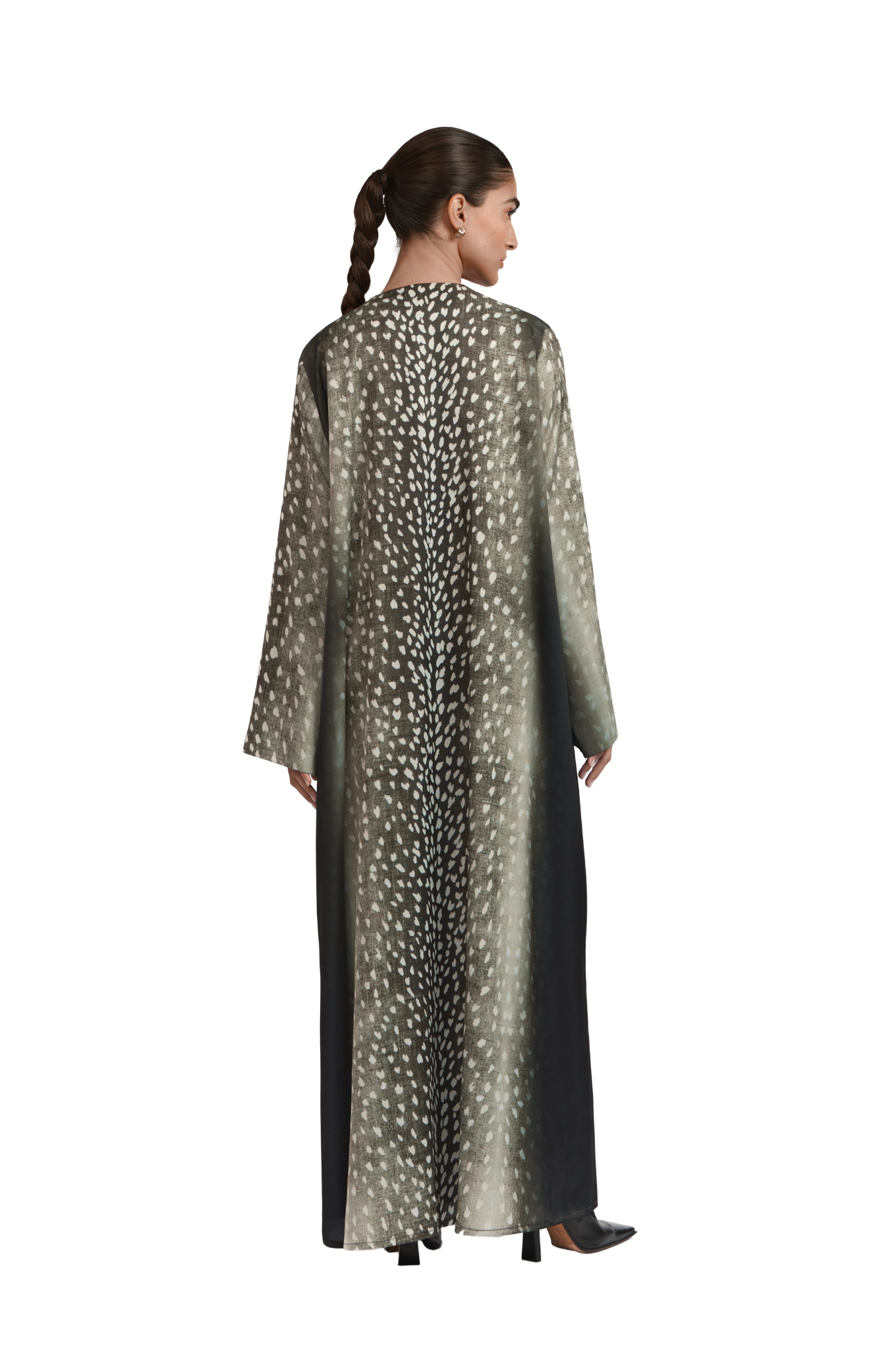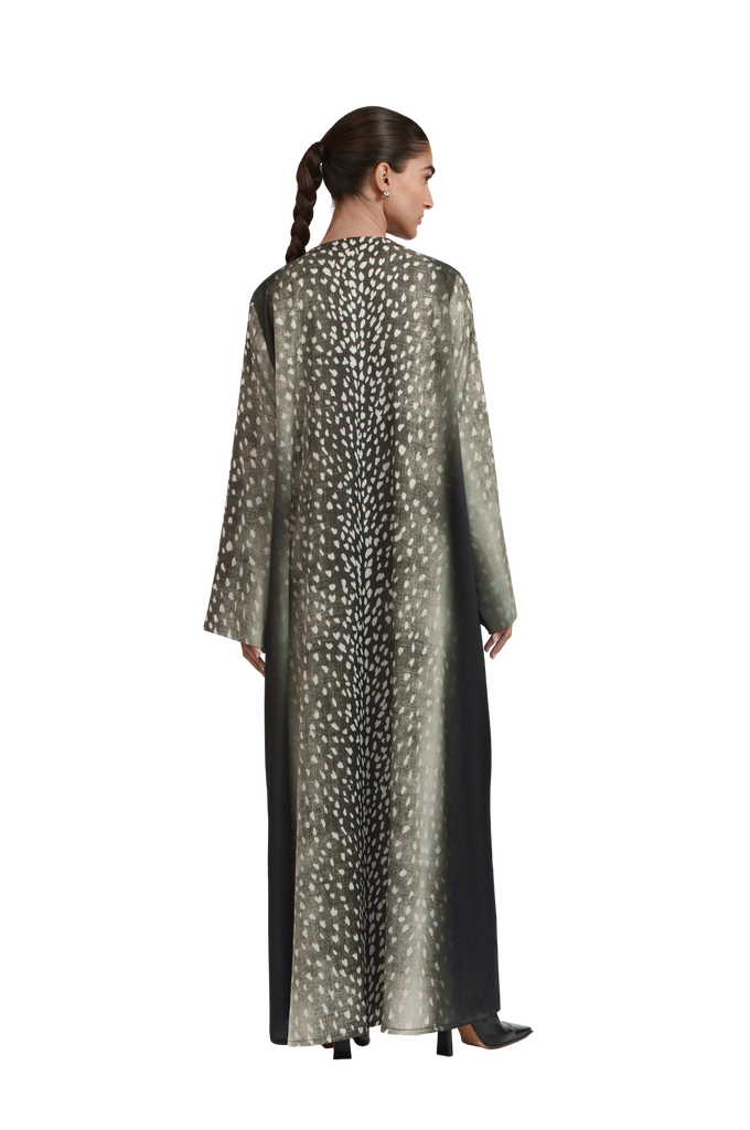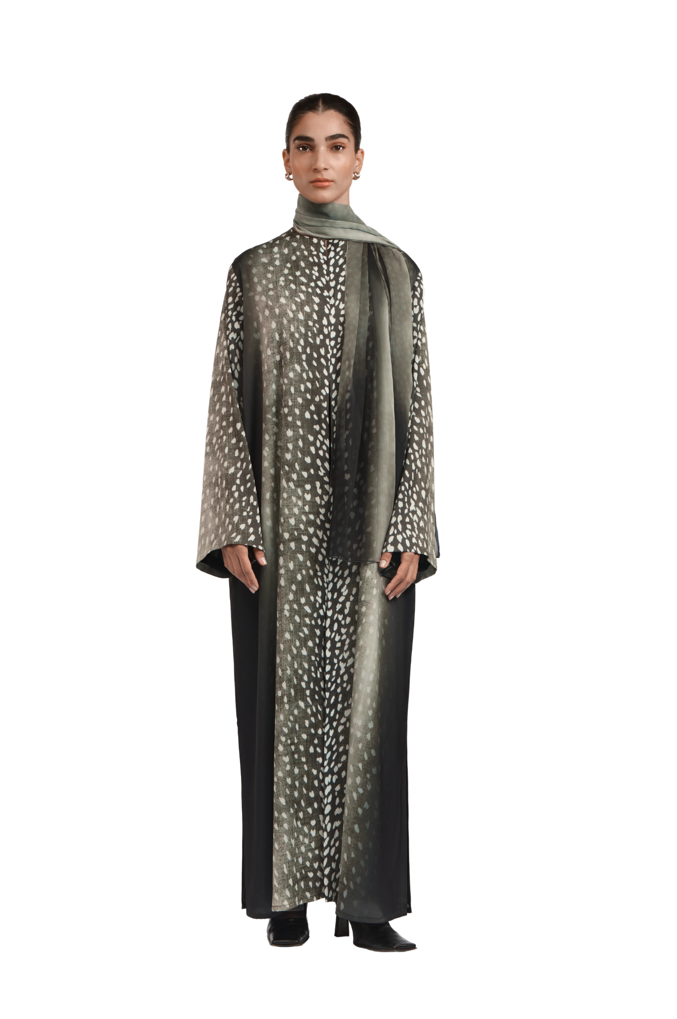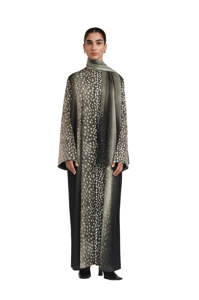 Made from sumptuous green wrinkle silk fabric, this straight-cut abaya showcases a dynamic 1309 in house animal print that adds a fresh, lively touch.