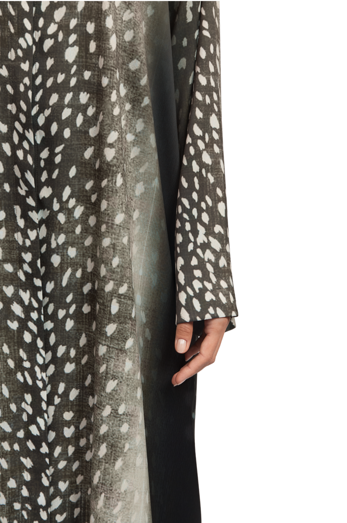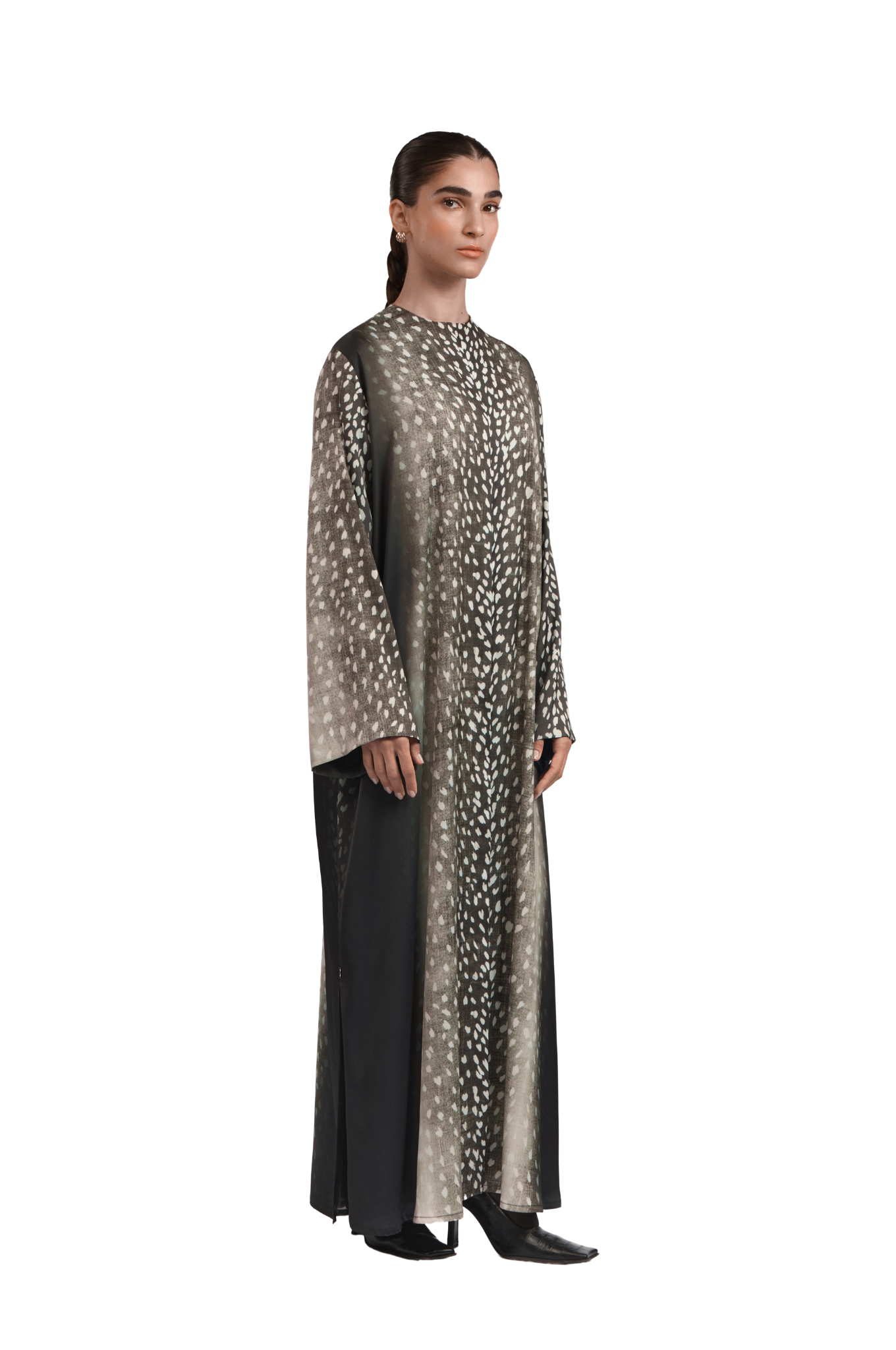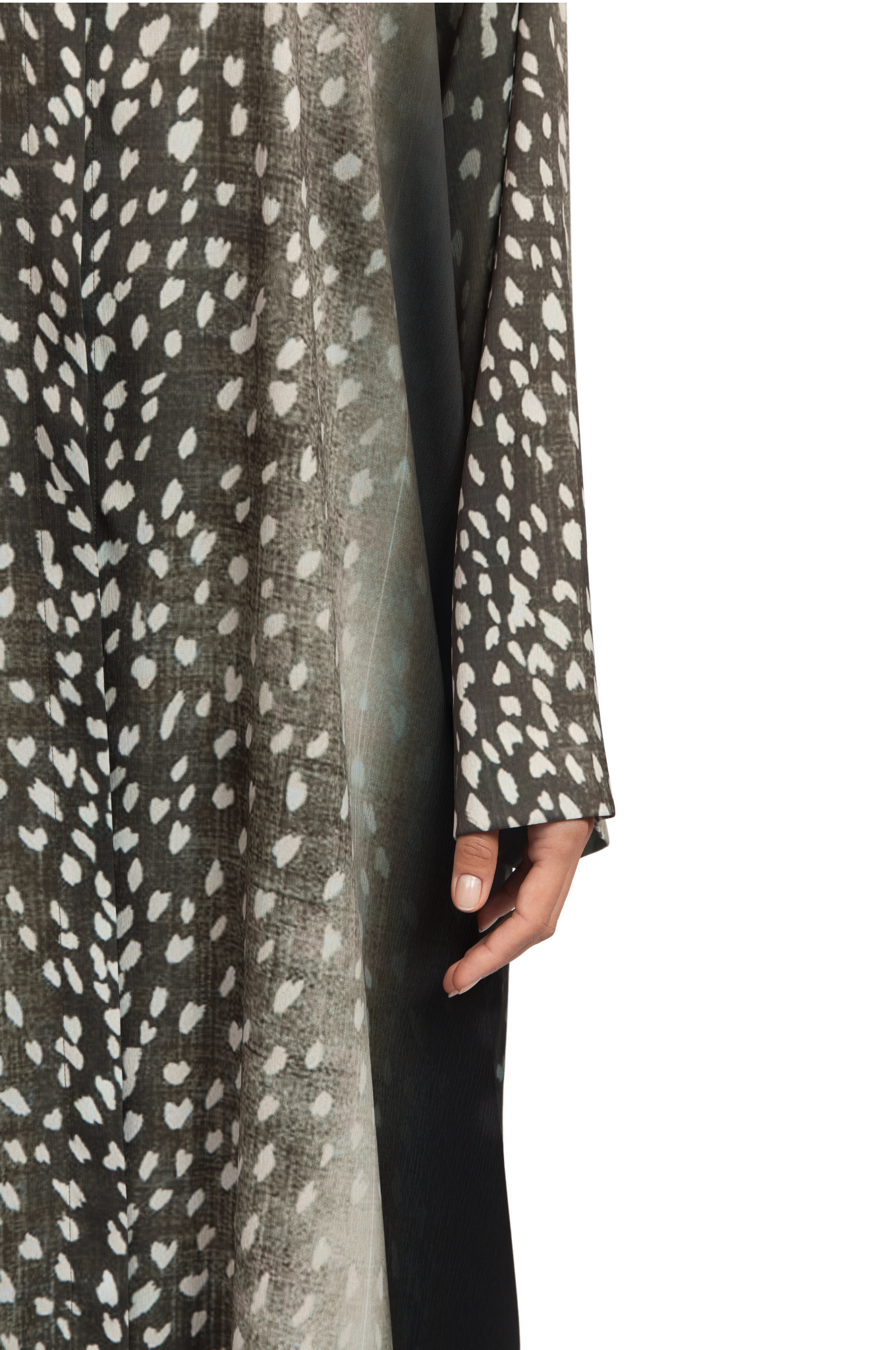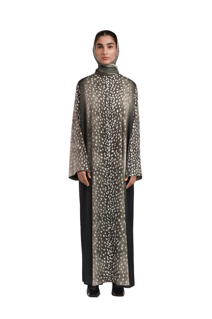 Made from sumptuous green wrinkle silk fabric, this straight-cut abaya showcases a dynamic 1309 in house animal print that adds a fresh, lively touch.