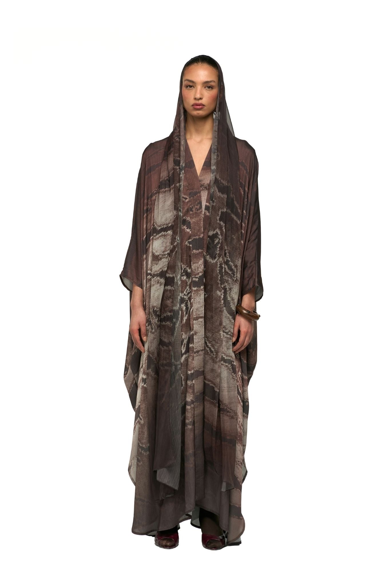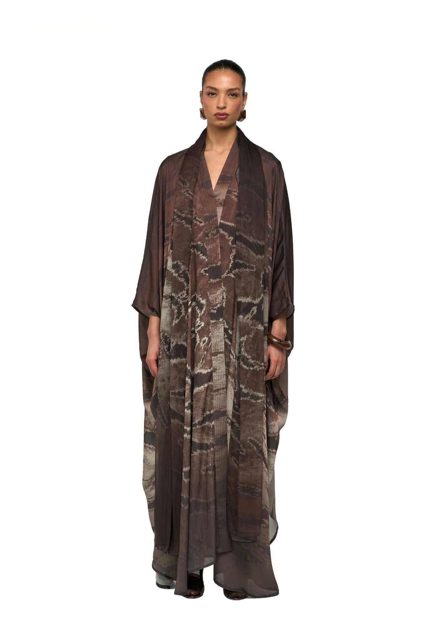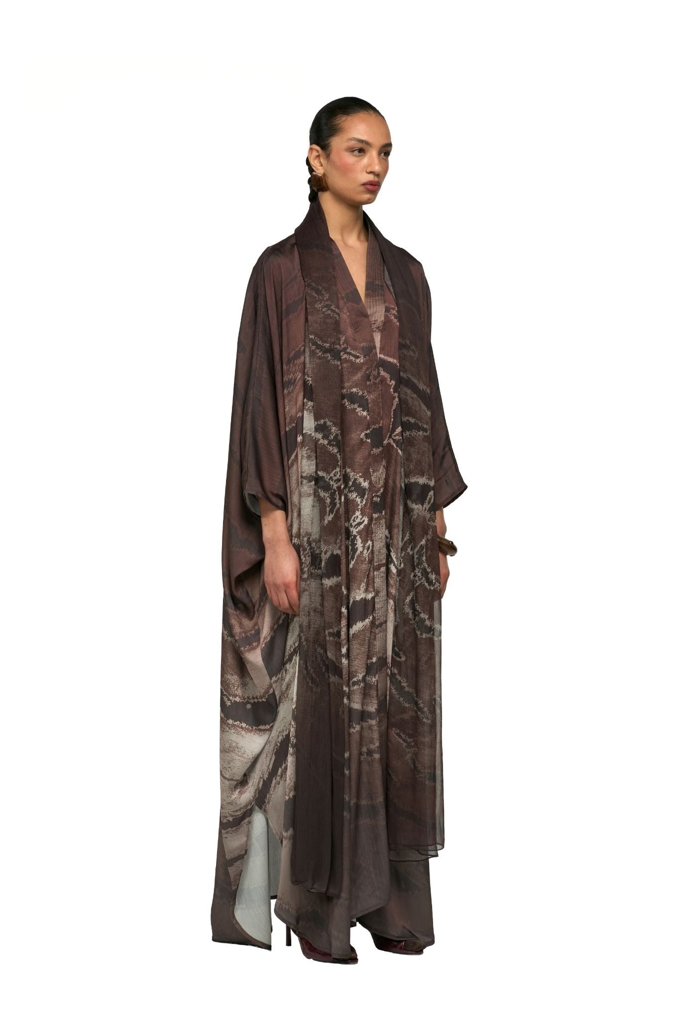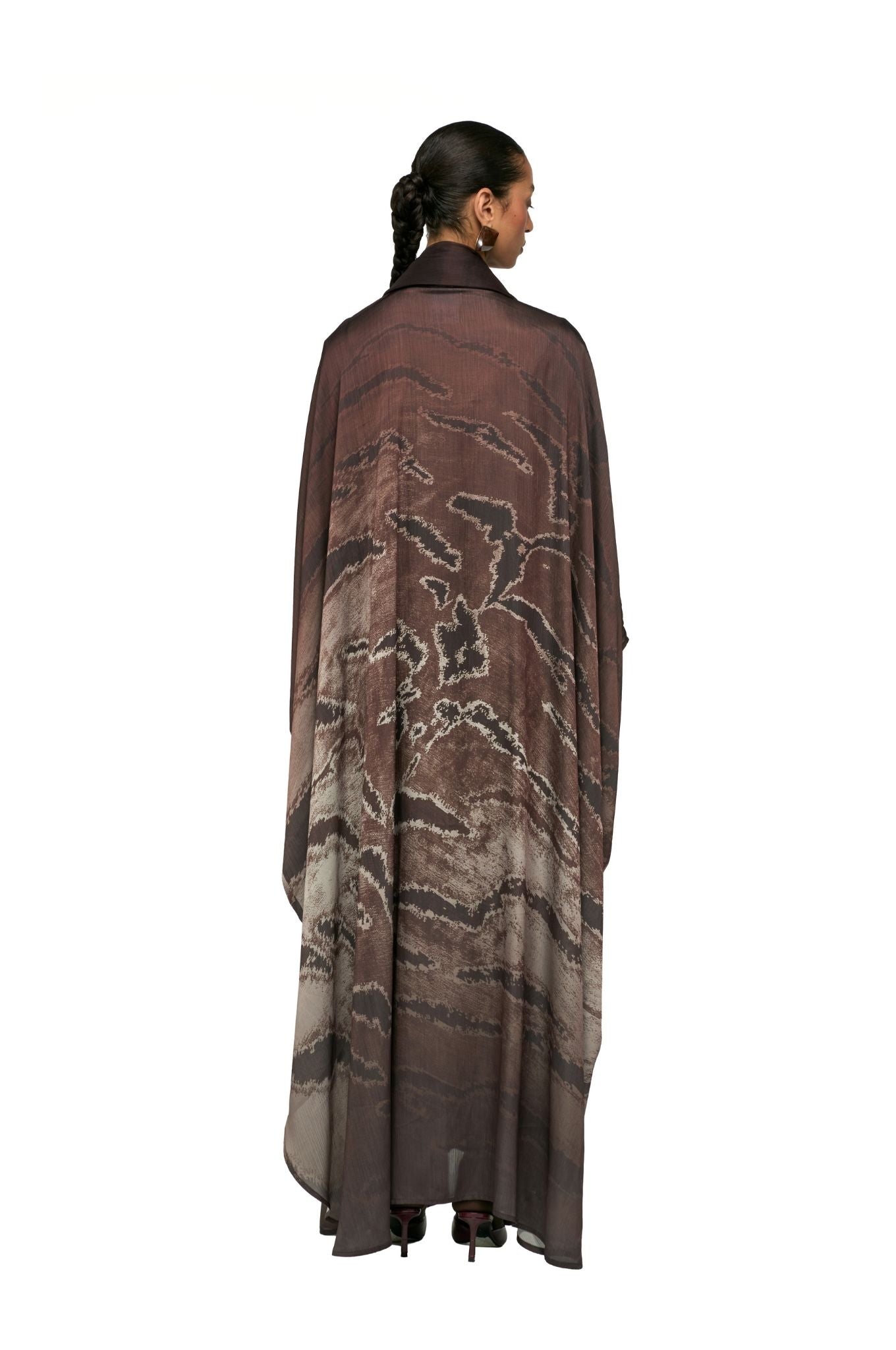 This abaya reimagines the classic bisht cut in animal printed. It comes with an attached matching printed sheila, completing a polished and sophisticated look.