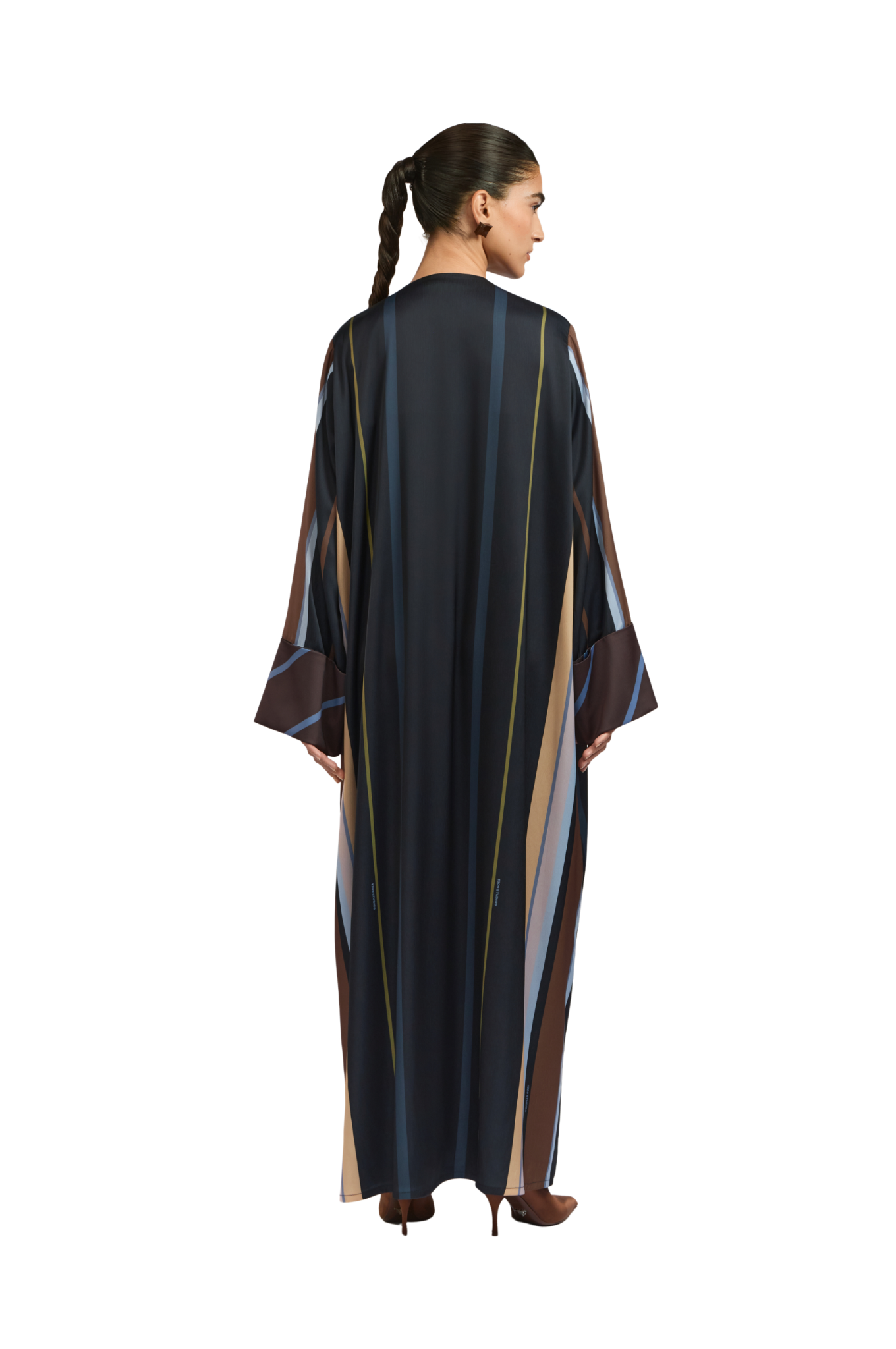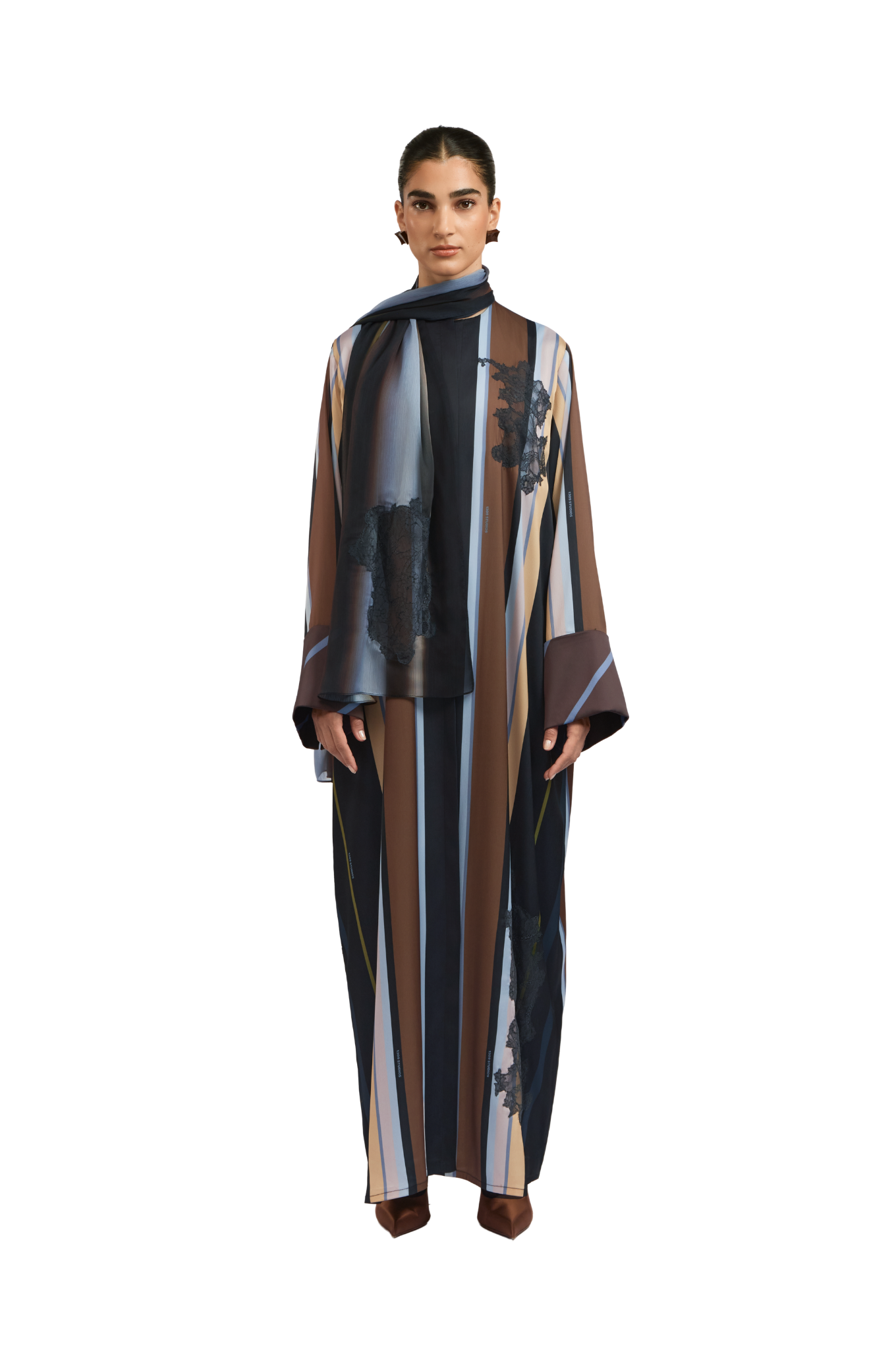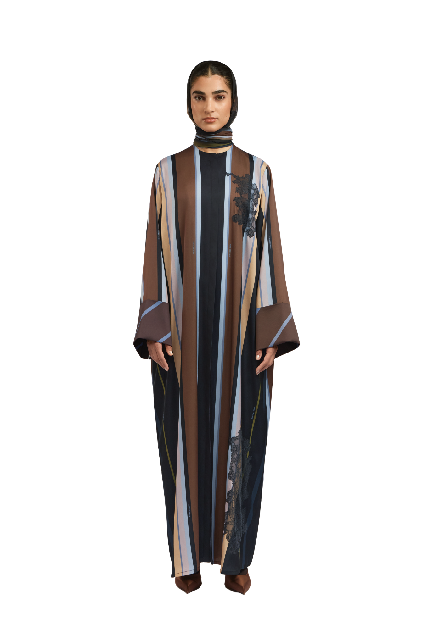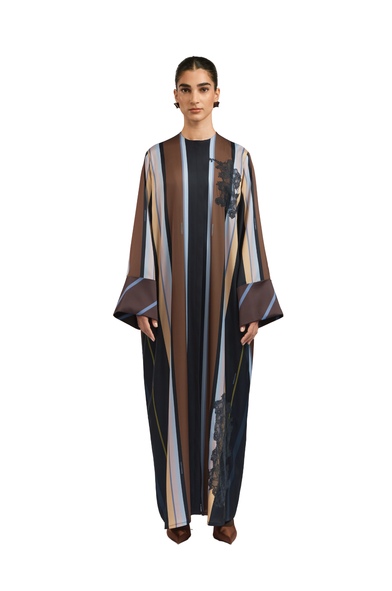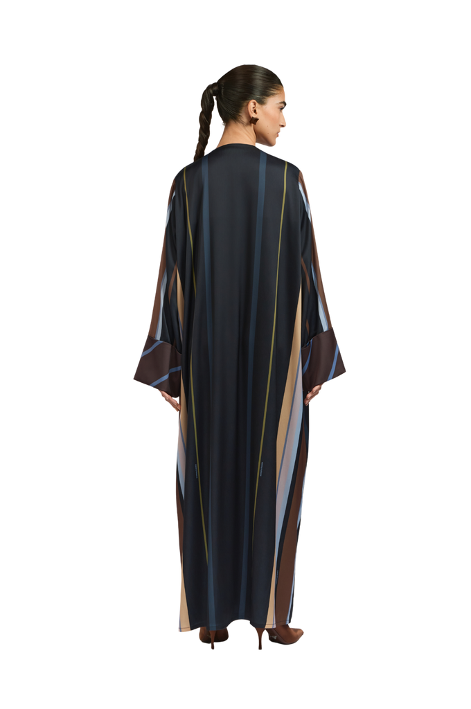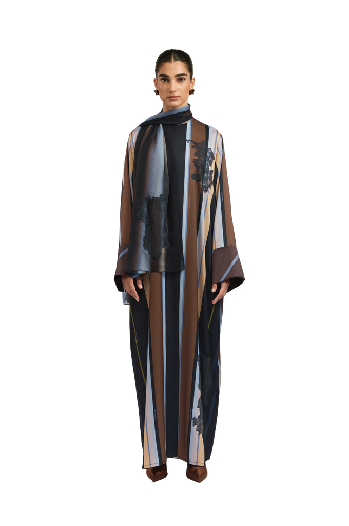 Crafted from fine, textured silk, the Bryn Lilac Abaya offers a soft, fluid drape and a naturally elegant finish. The design features graceful stripes in lilac, dark brown, and cream, The abaya is enhanced with delicate lace detailing, adding a touch of refined femininity to the design. a sophisticated and harmonious contrast. The cuffs are detailed with diagonal lines that complement the overall palette, adding a subtle yet distinctive touch of refinement.