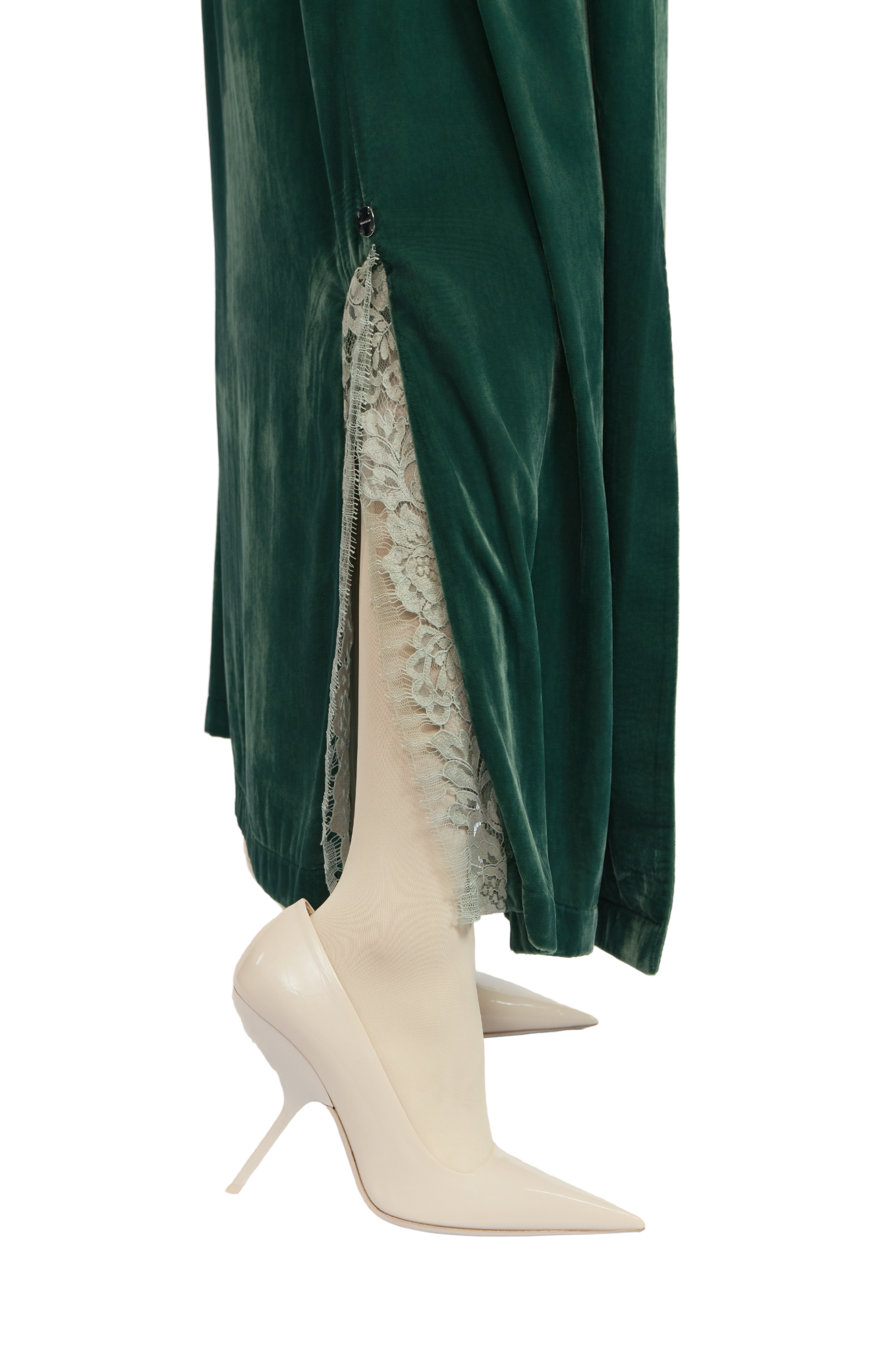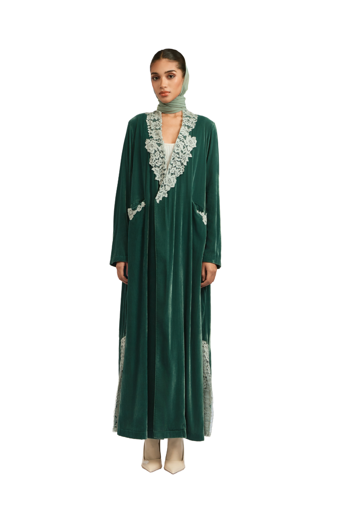 The Ines green abaya showcases elegant tailoring in a sleek, balanced silhouette. Made from deep green velvet, this collared trench-style abaya features delicate lace accents that add texture and flowing movement. The subtle side-closure design provides gentle structure, reflecting 1309’s signature blend of sophistication and effortless grace.