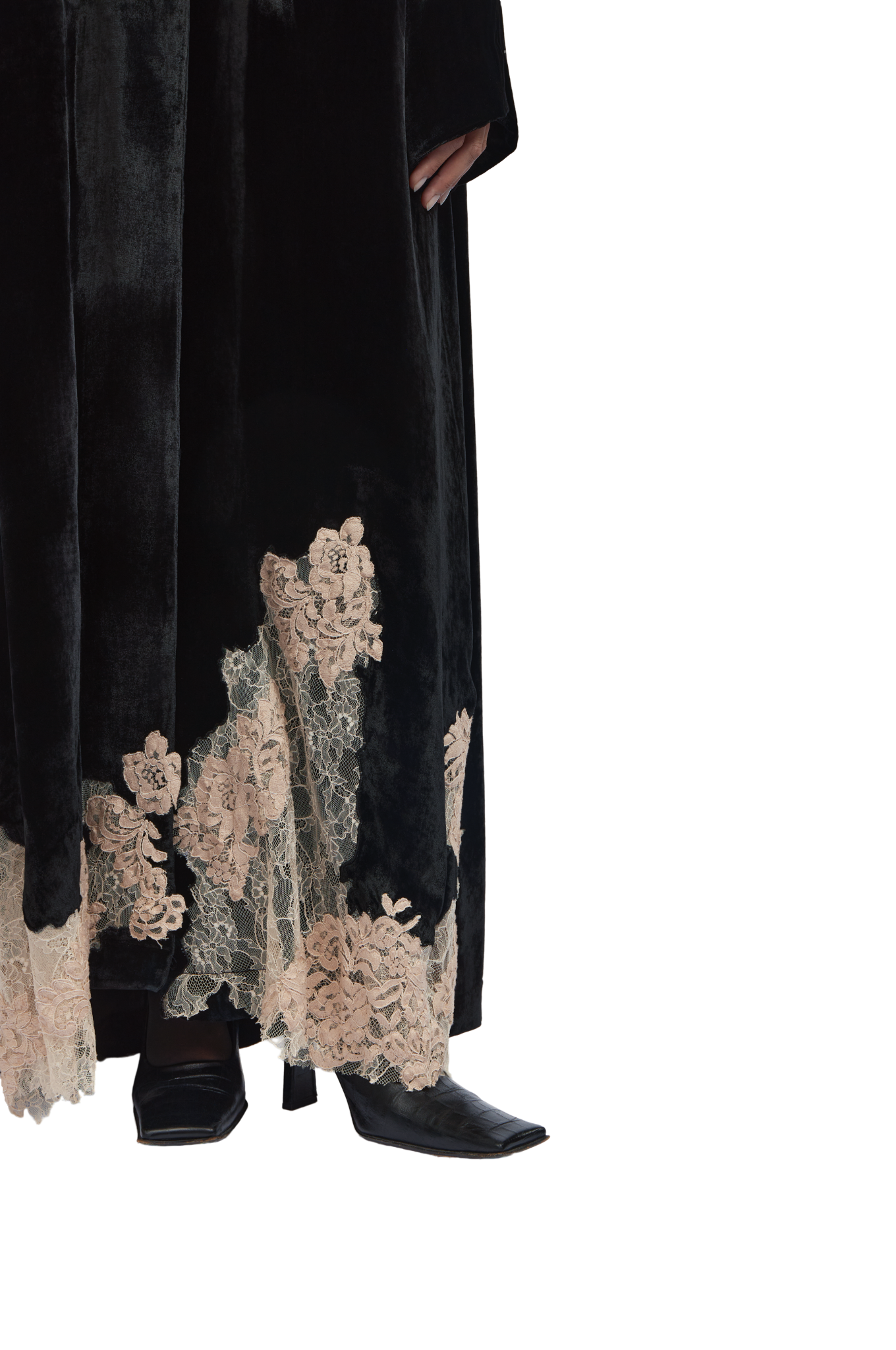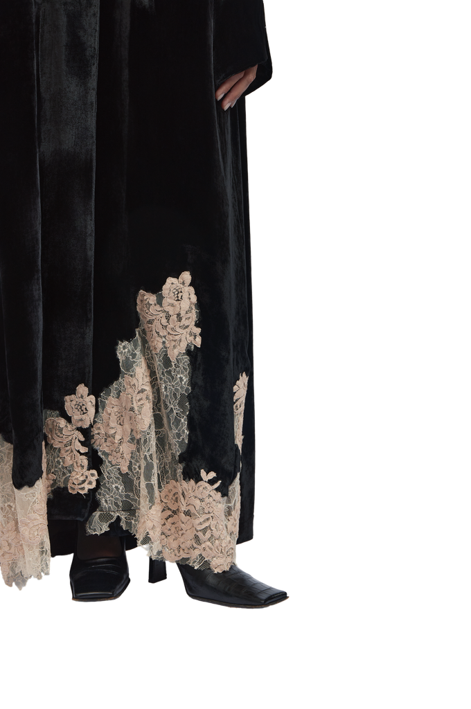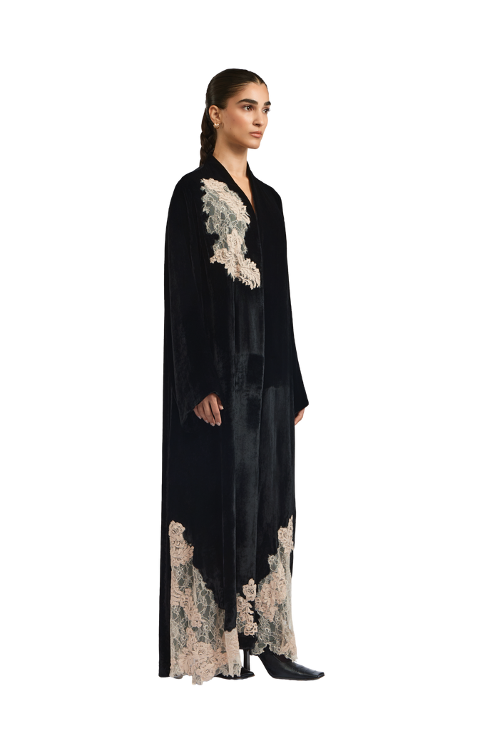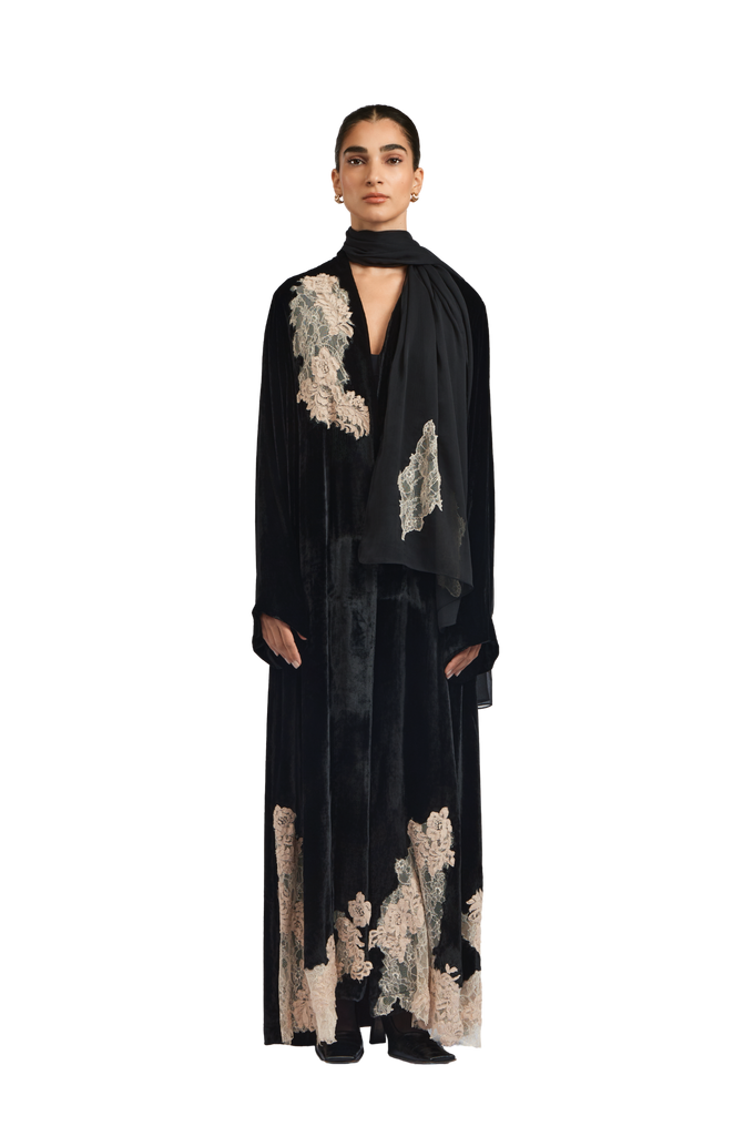 Exuding quiet elegance, the Kia Abaya is crafted from luxurious velvet, offering a rich texture and graceful drape. Its straight-cut silhouette delivers a clean, flattering fit, while delicate lace patchwork is thoughtfully placed throughout the design, creating a subtle contrast that adds depth and refinement.