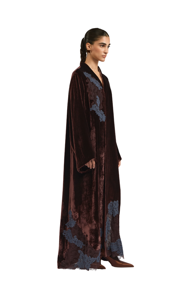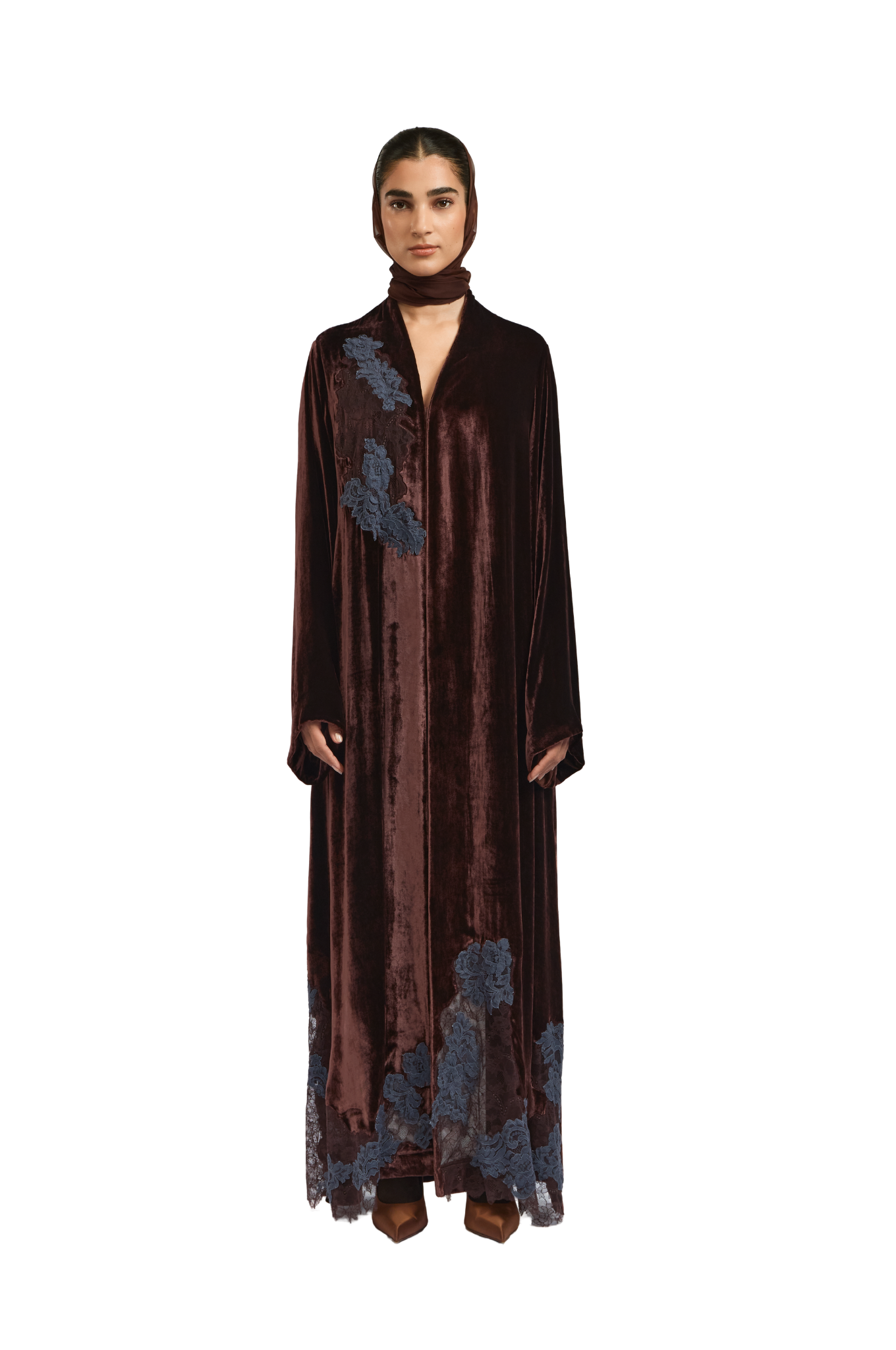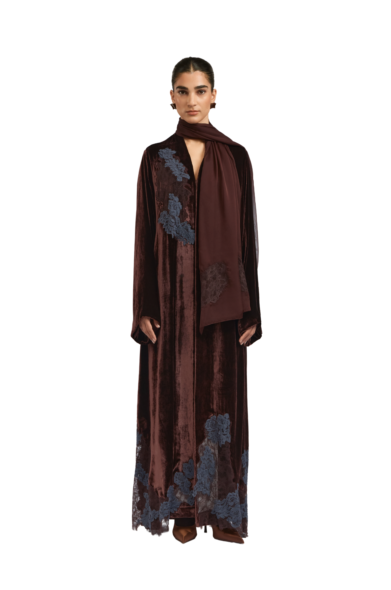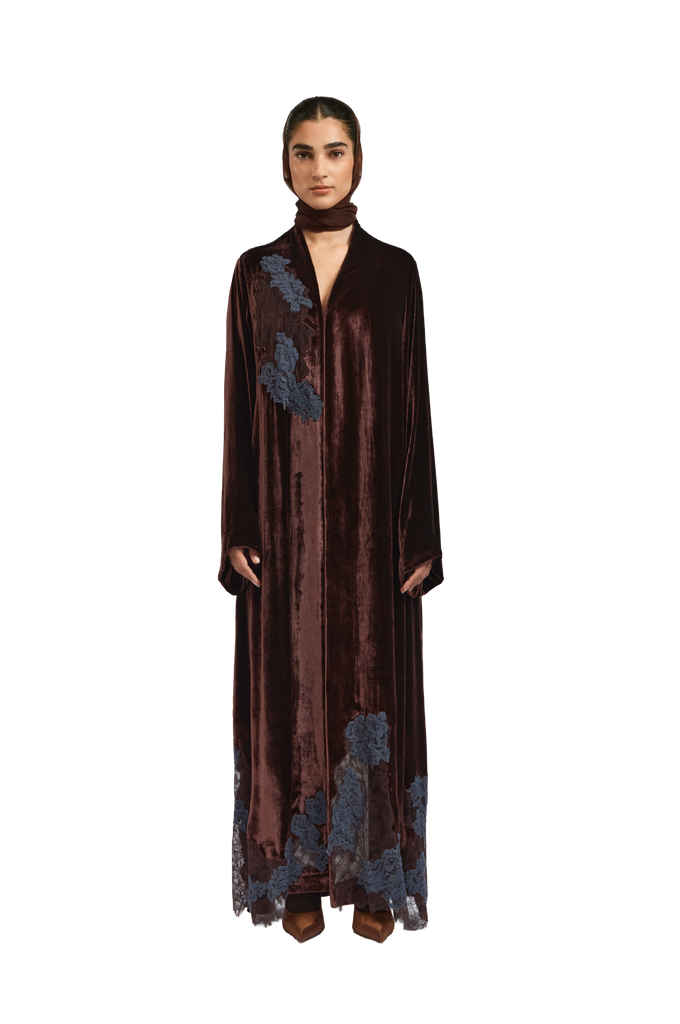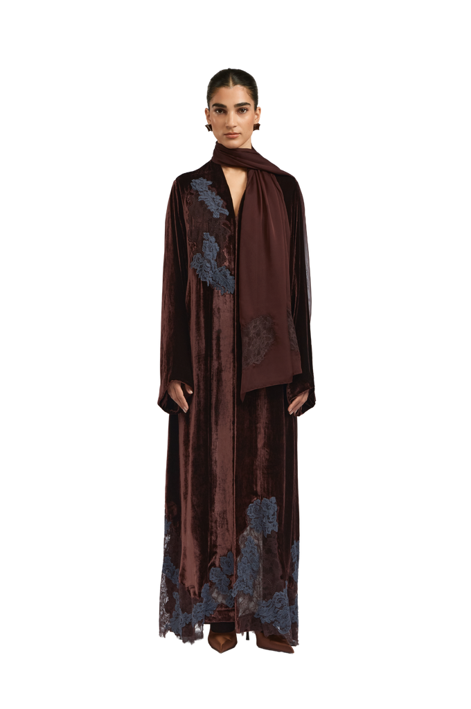 Exuding quiet elegance, the Kia Abaya is crafted from luxurious velvet, offering a rich texture and graceful drape. Its straight-cut silhouette delivers a clean, flattering fit, while delicate lace patchwork is thoughtfully placed throughout the design, creating a subtle contrast that adds depth and refinement.