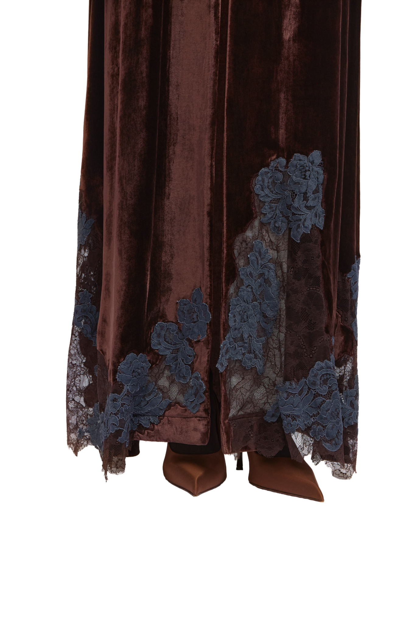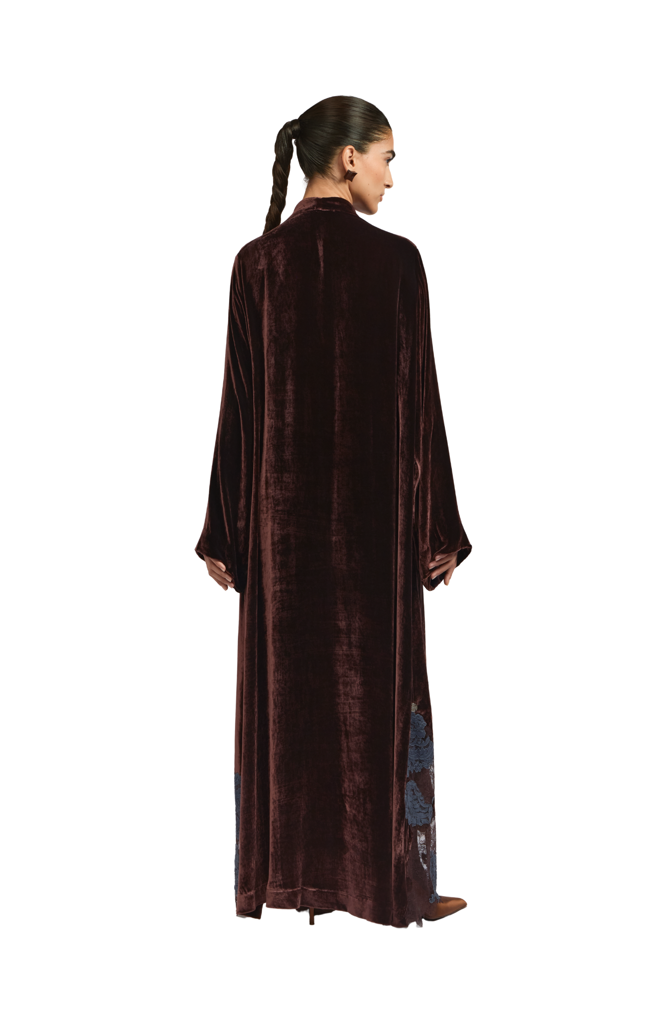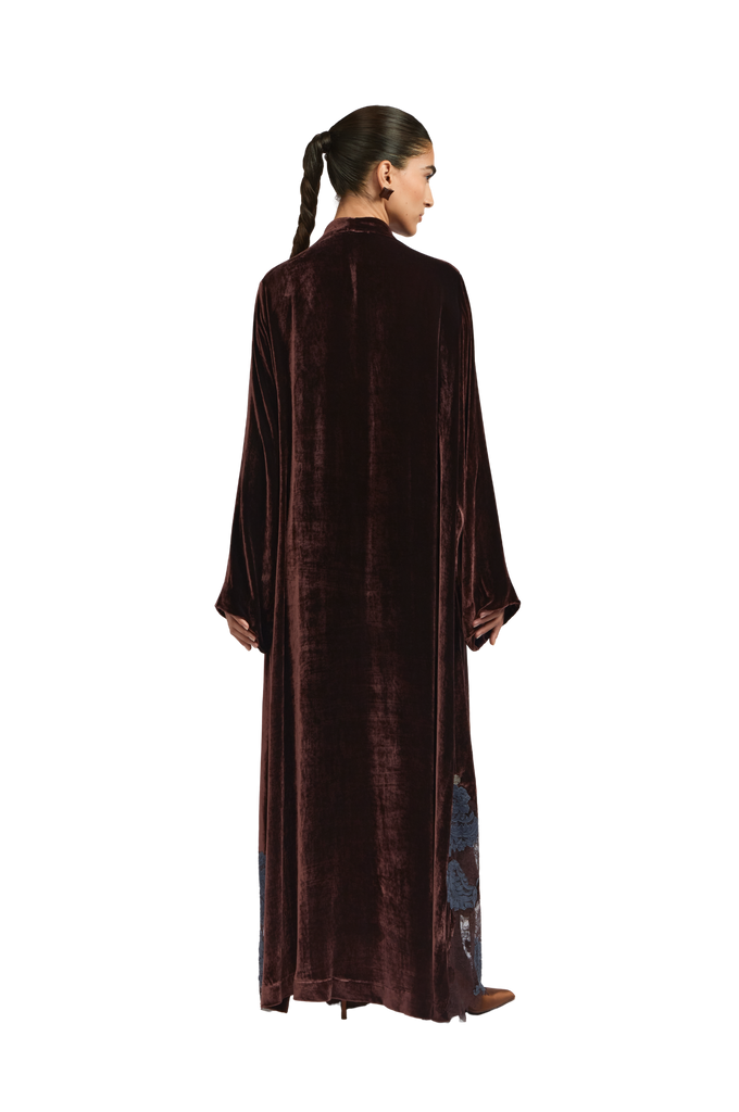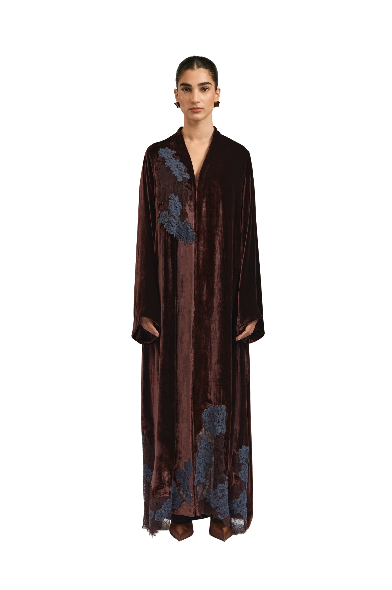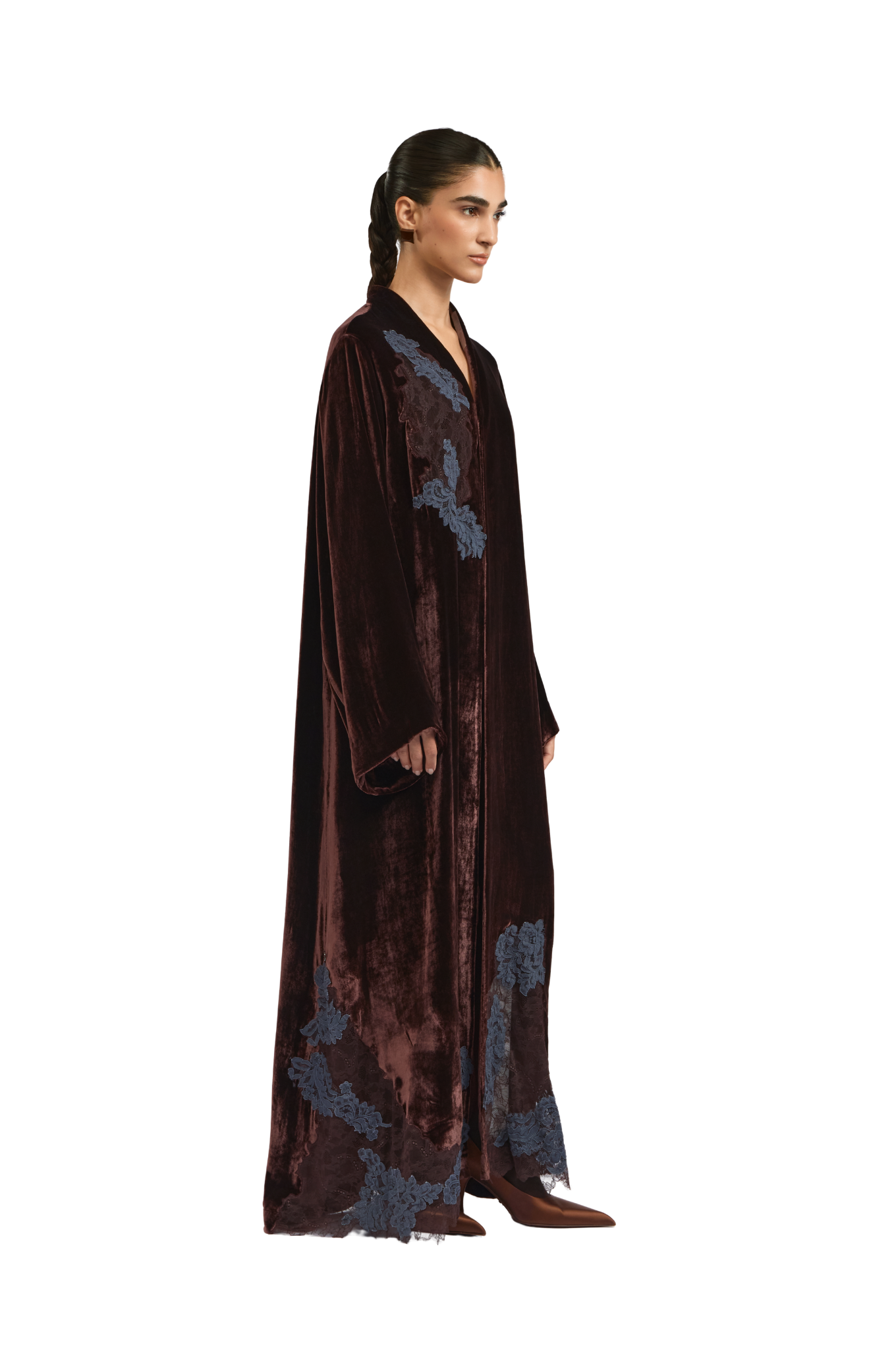 Exuding quiet elegance, the Kia Abaya is crafted from luxurious velvet, offering a rich texture and graceful drape. Its straight-cut silhouette delivers a clean, flattering fit, while delicate lace patchwork is thoughtfully placed throughout the design, creating a subtle contrast that adds depth and refinement.