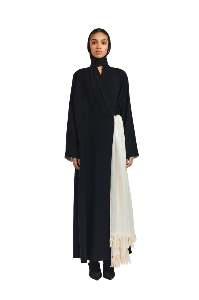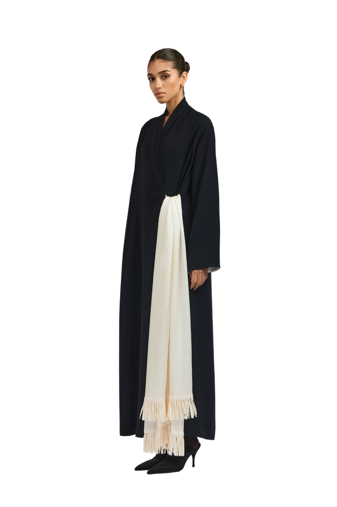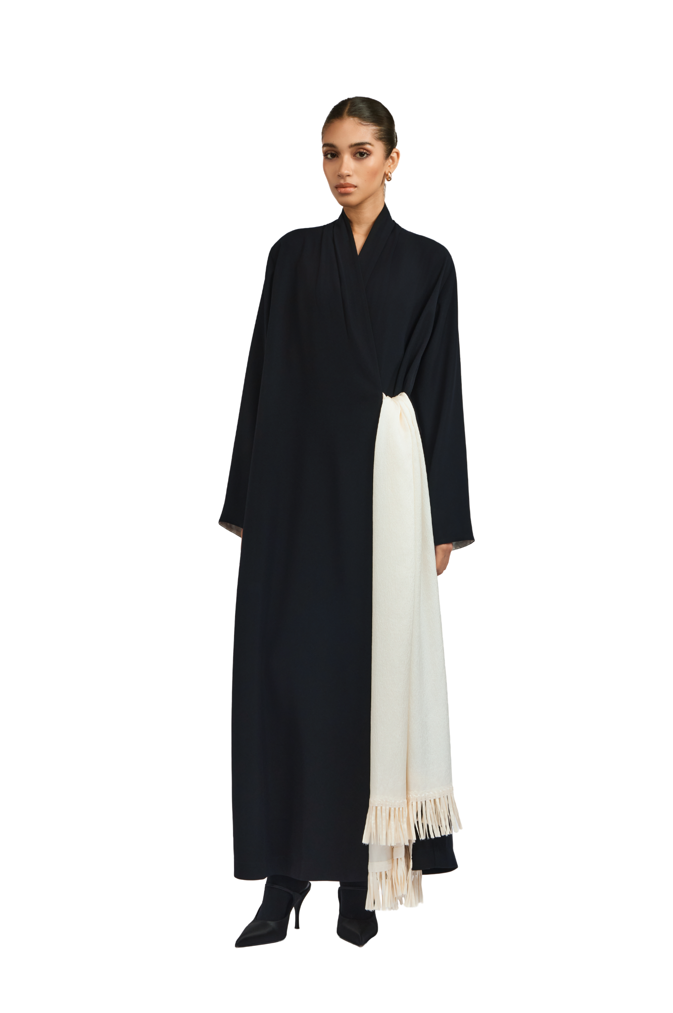 The Kyara abaya presents a contemporary take on the classic slim bisht cut, seamlessly blending tradition with modern elegance. Crafted from RICH crepe in a striking black and white palette, IT features a side-tie closure in textured silk, finished with delicate fringes for a distinctive touch. and flows into a soft, graceful trail.
