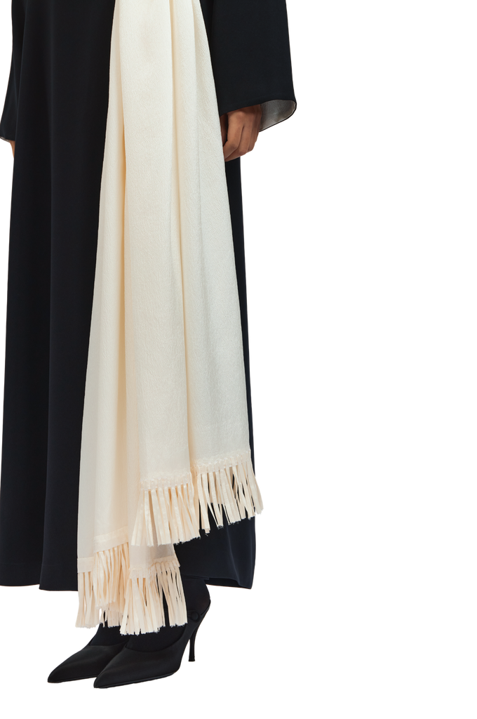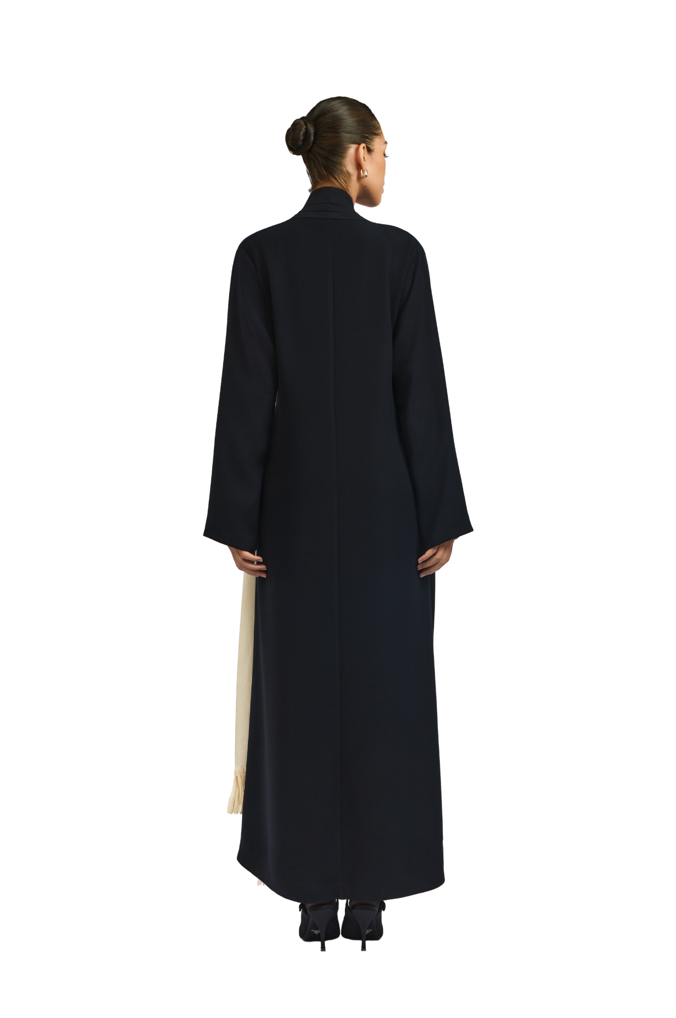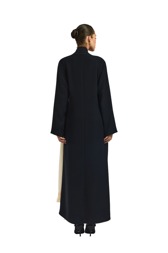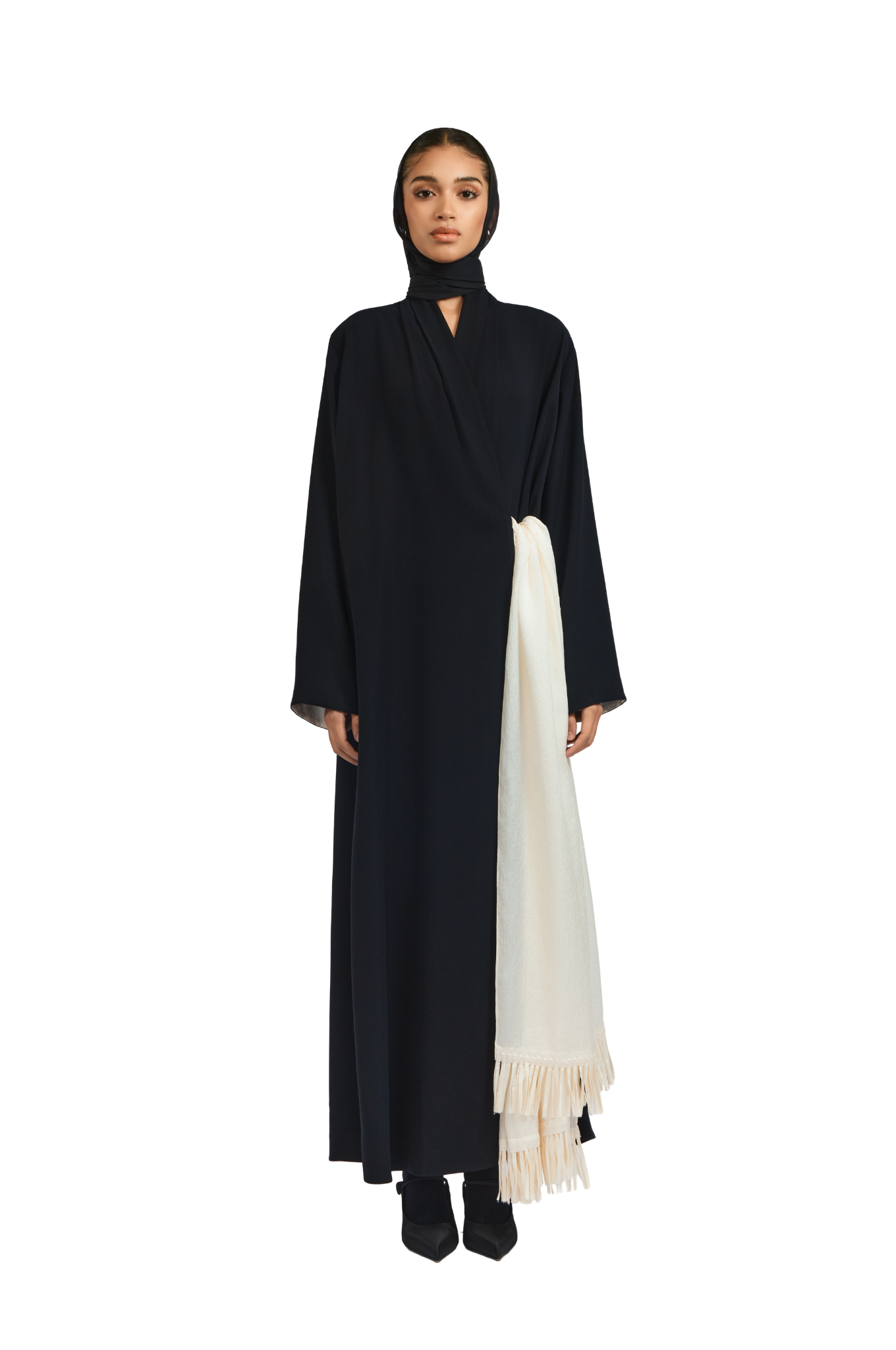 The Kyara abaya presents a contemporary take on the classic slim bisht cut, seamlessly blending tradition with modern elegance. Crafted from RICH crepe in a striking black and white palette, IT features a side-tie closure in textured silk, finished with delicate fringes for a distinctive touch. and flows into a soft, graceful trail.