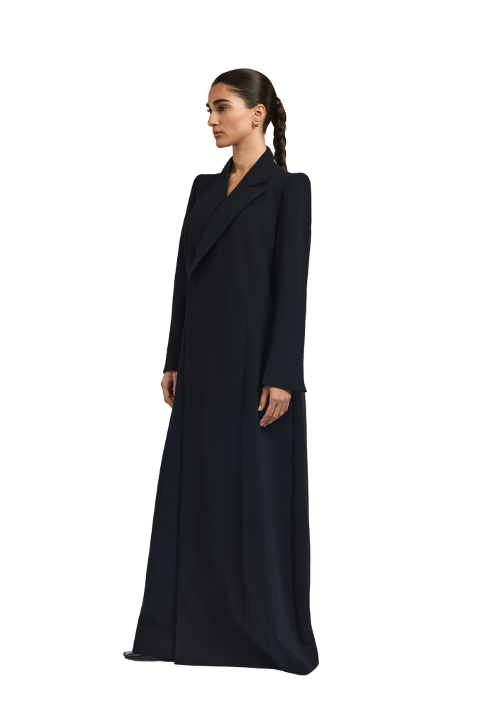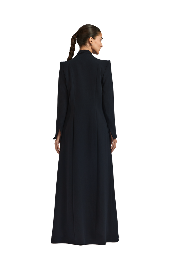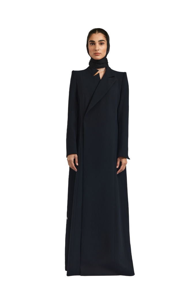 Rumi black abaya exudes effortless elegance with a tailored, blazer-inspired silhouette. Crafted from soft black crepe, the abaya features padded shoulders that provide structure and a poised presence. A subtle side-closure design gently shapes the garment, delivering a polished and graceful finish.