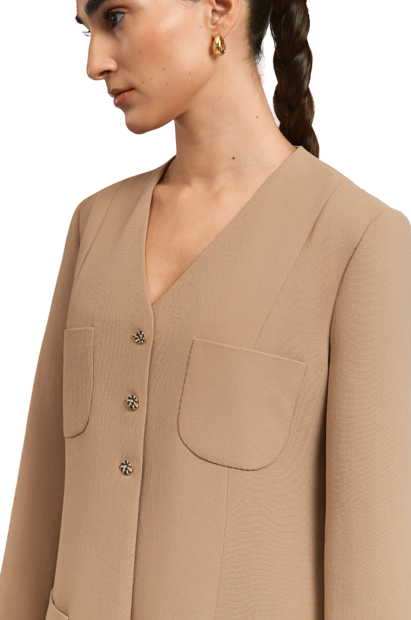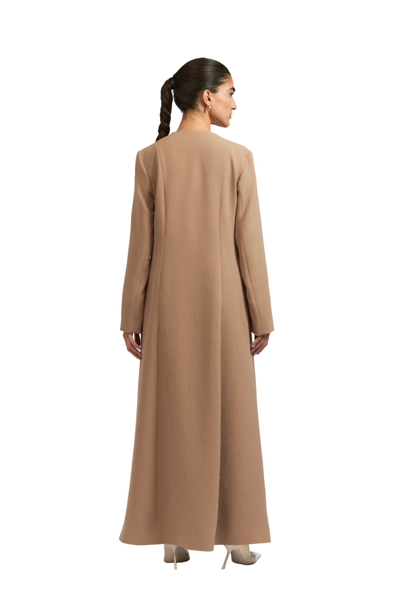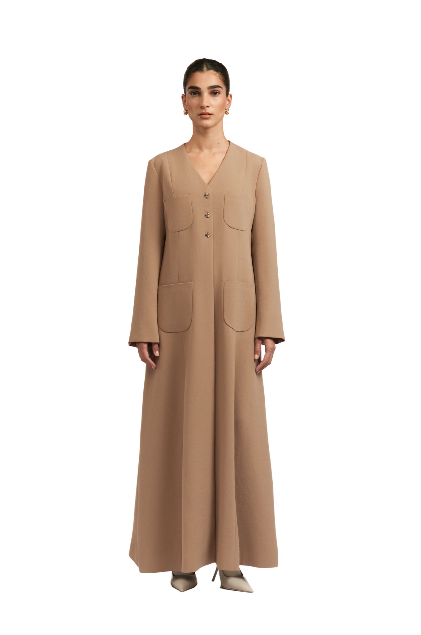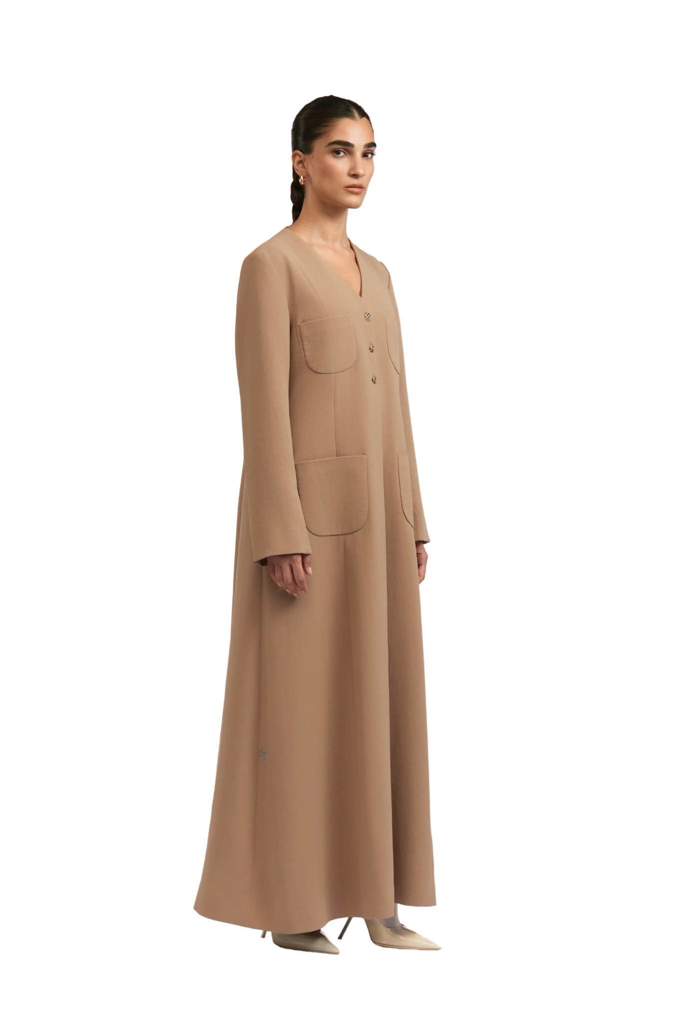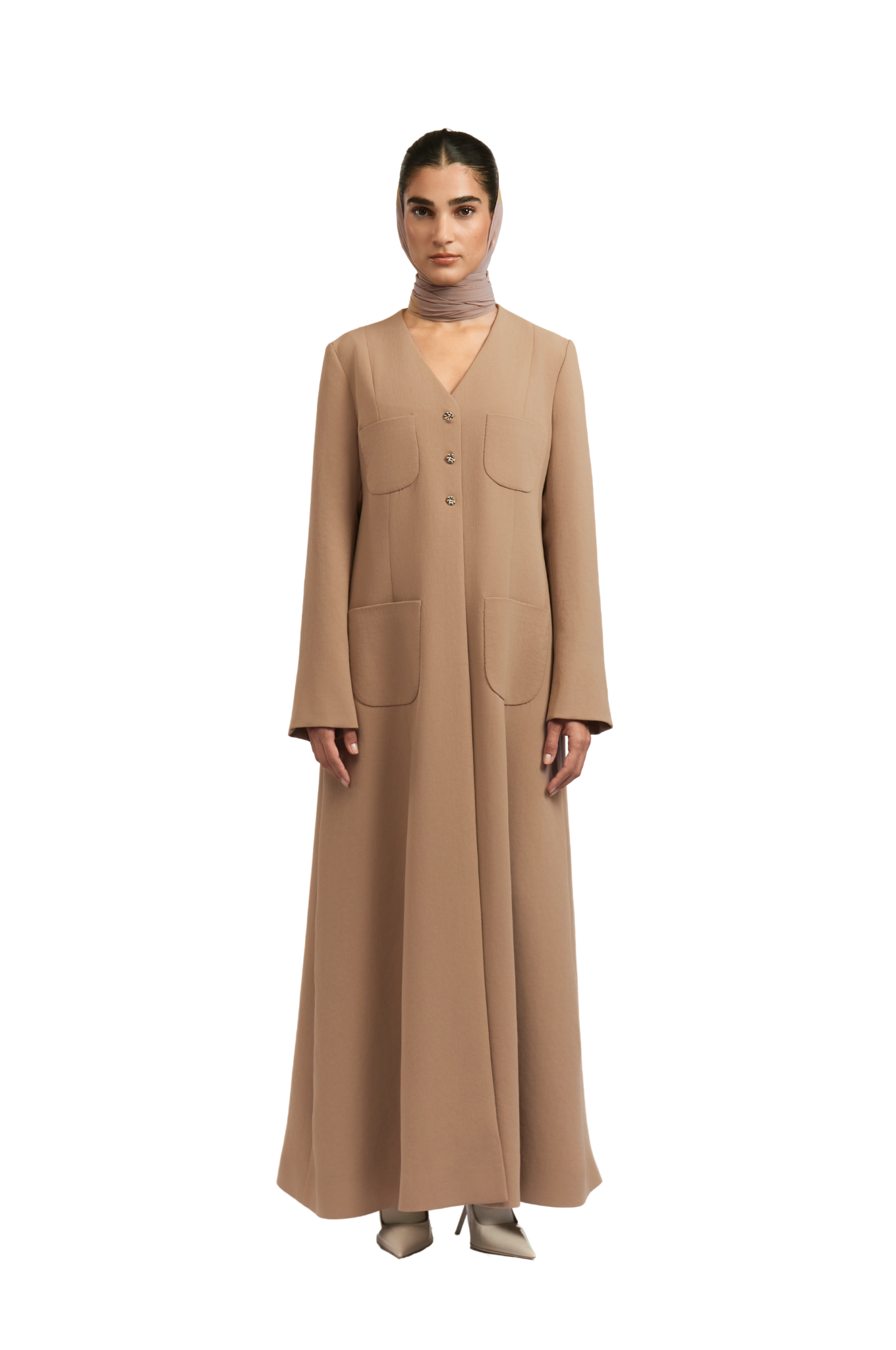 Taking simplicity to the next level, this flare cut silhouette abaya is made out of fit and flare crepe fabric, with four frontal pockets and 1309 Studios’ unique spiral buttons.