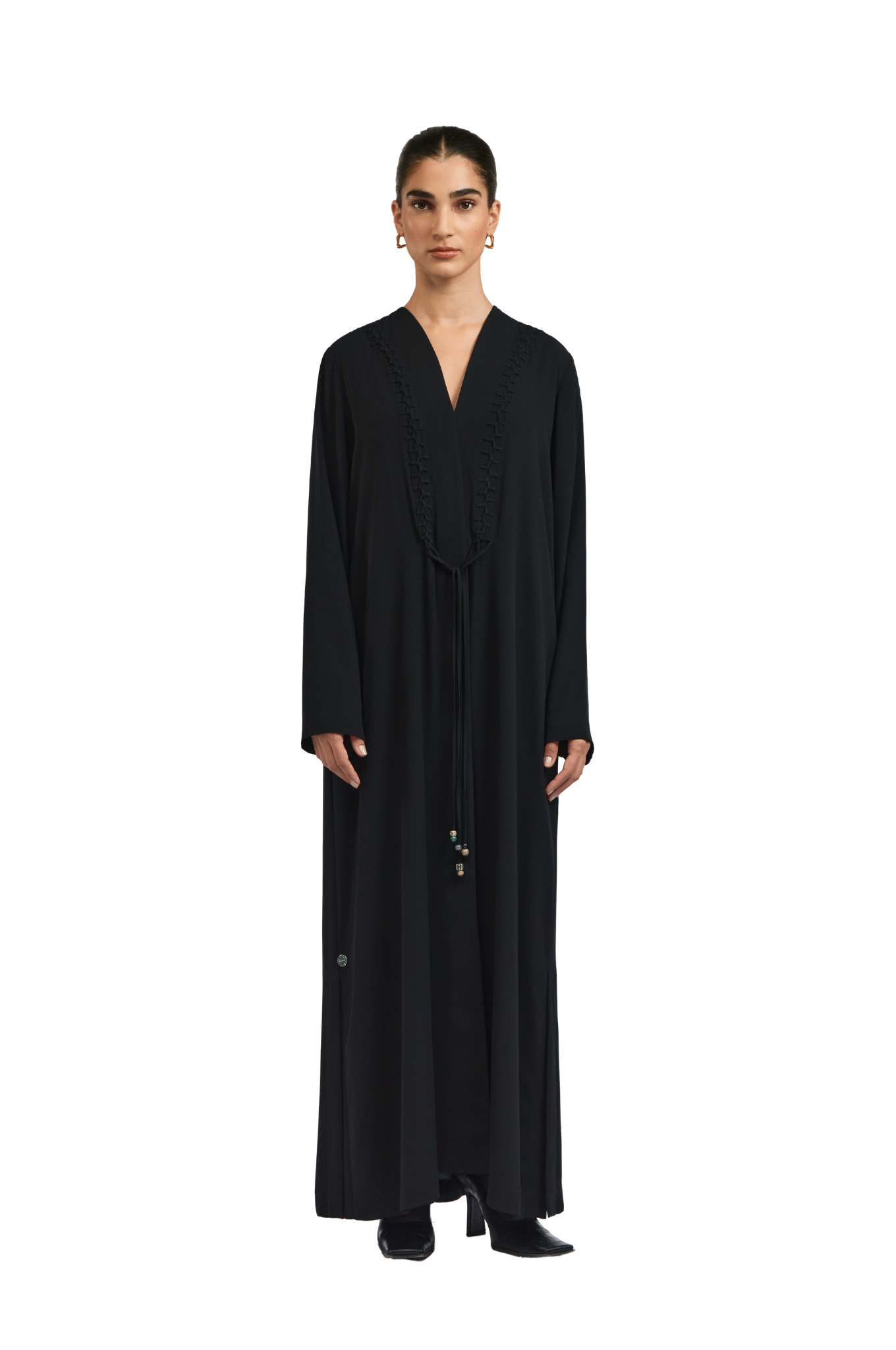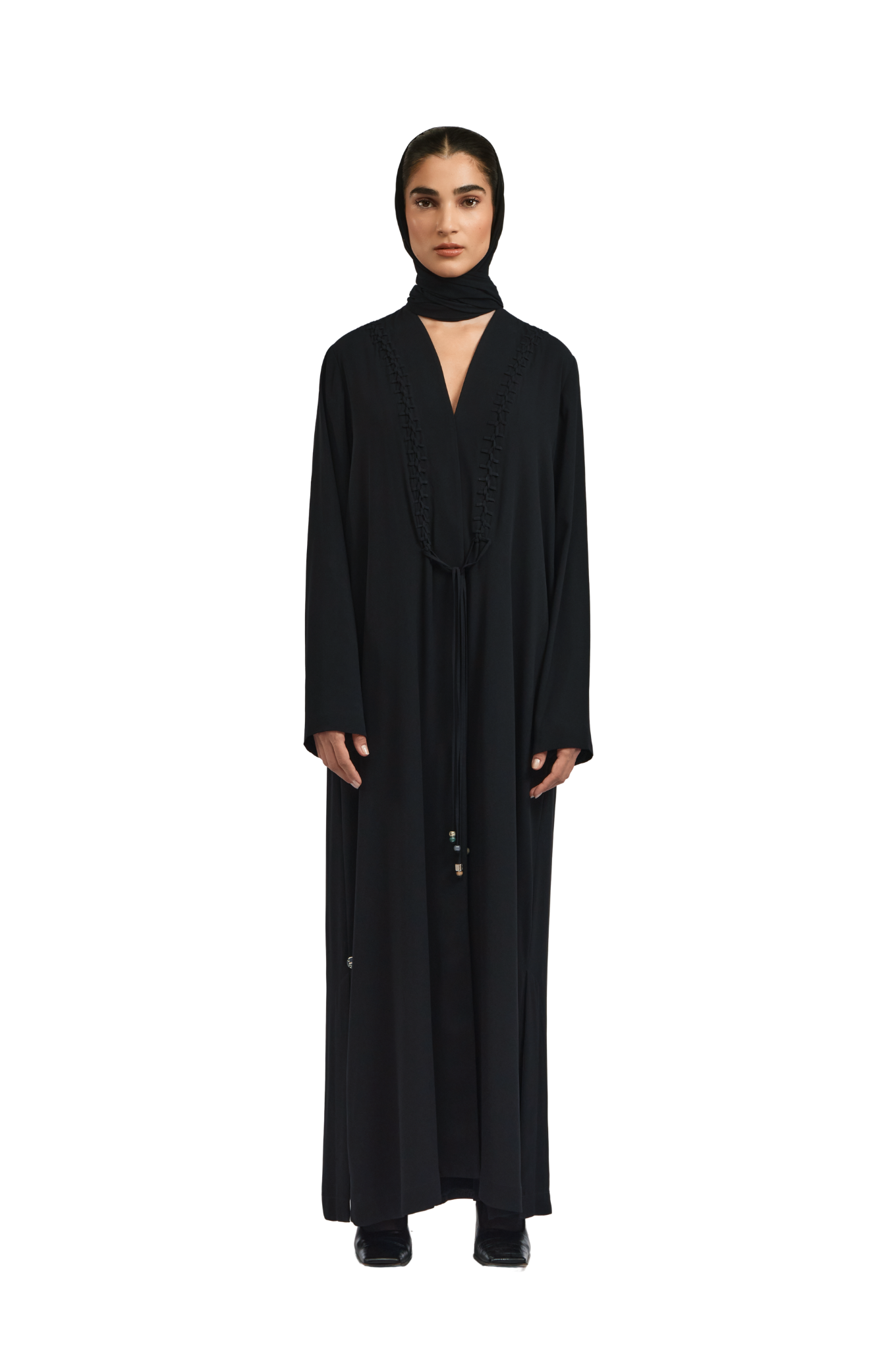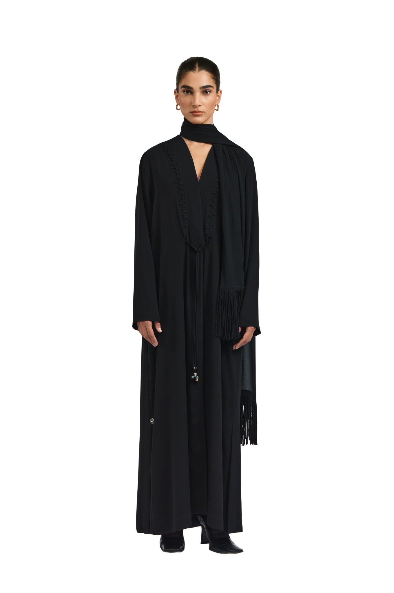 The Serena abaya flows in an elegant A-line silhouette, tailored from lightweight black crepe for a fluid, graceful drape. Braided and beaded accents embellish the front, adding depth and artisanal detail, while soft fringes cascade along the back—creating a striking interplay of texture and movement.