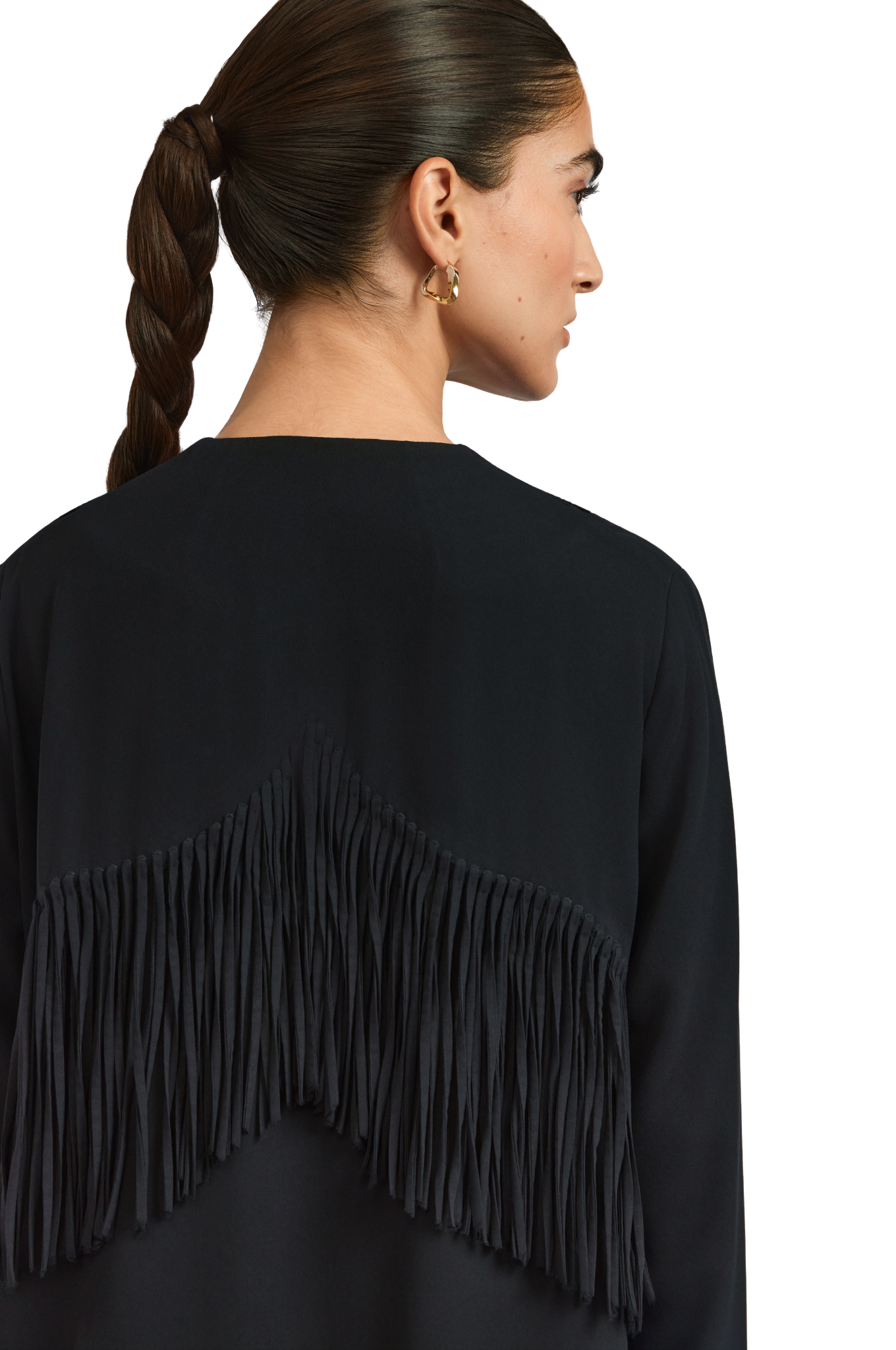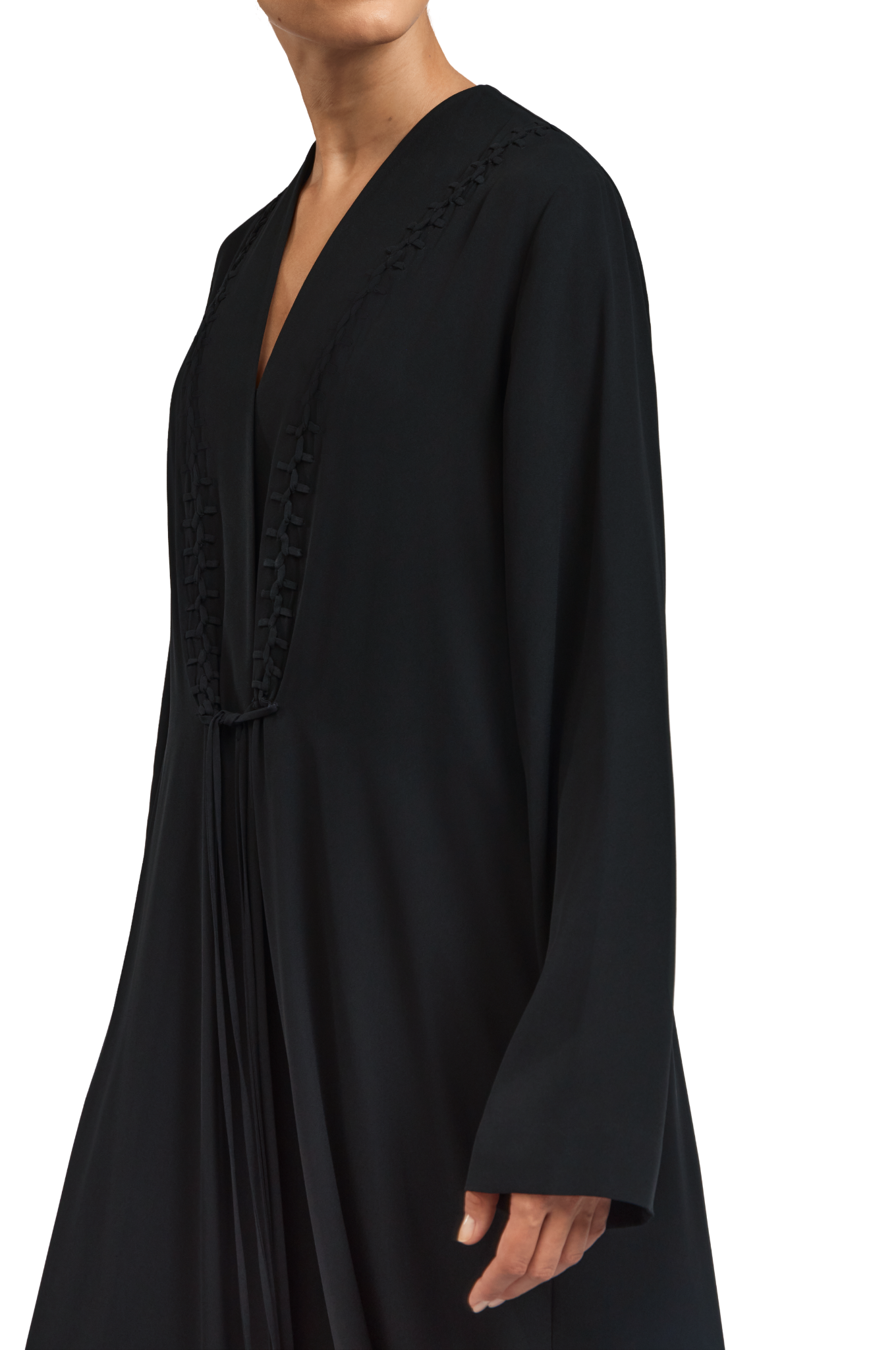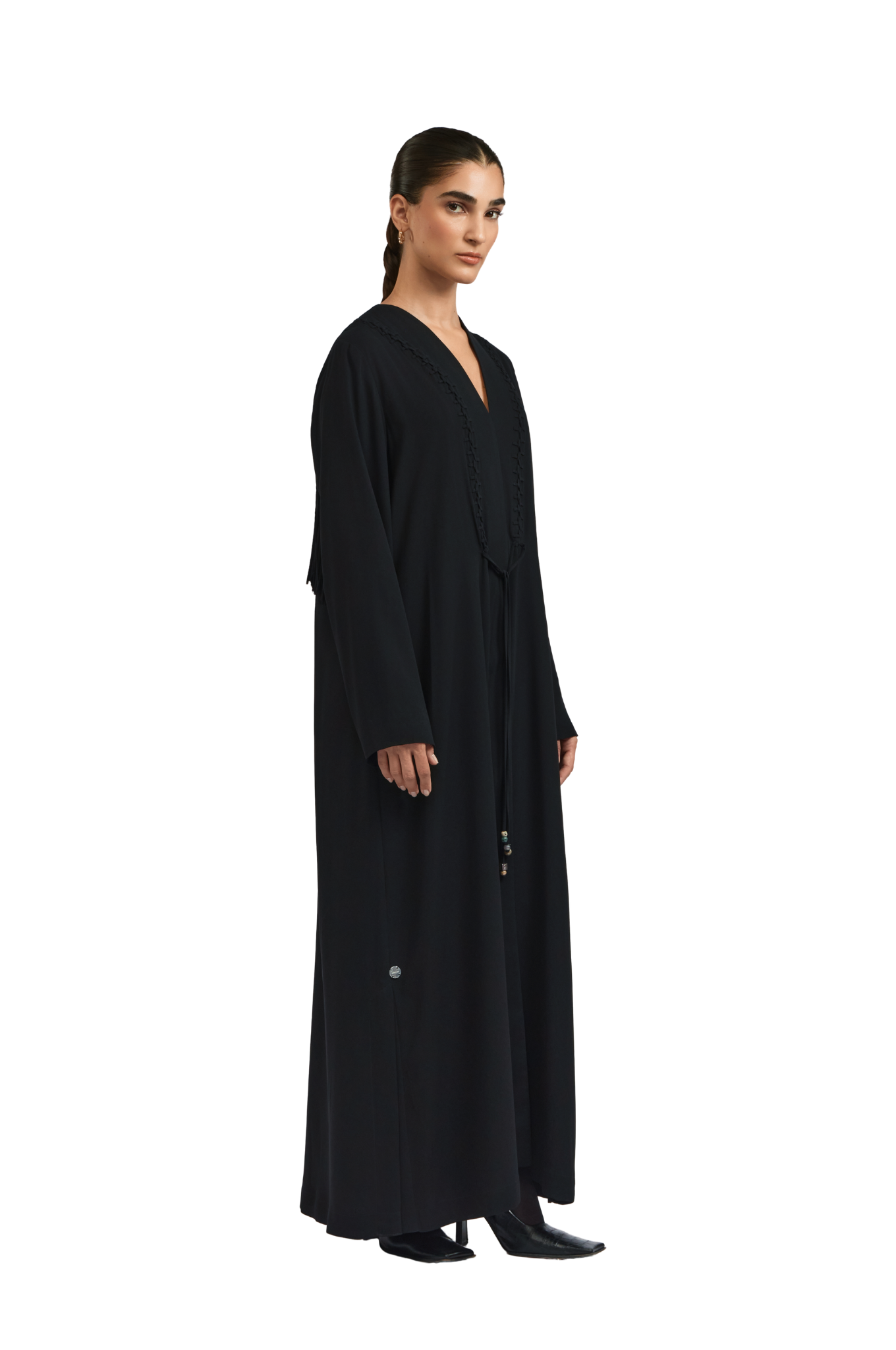 The Serena abaya flows in an elegant A-line silhouette, tailored from lightweight black crepe for a fluid, graceful drape. Braided and beaded accents embellish the front, adding depth and artisanal detail, while soft fringes cascade along the back—creating a striking interplay of texture and movement.