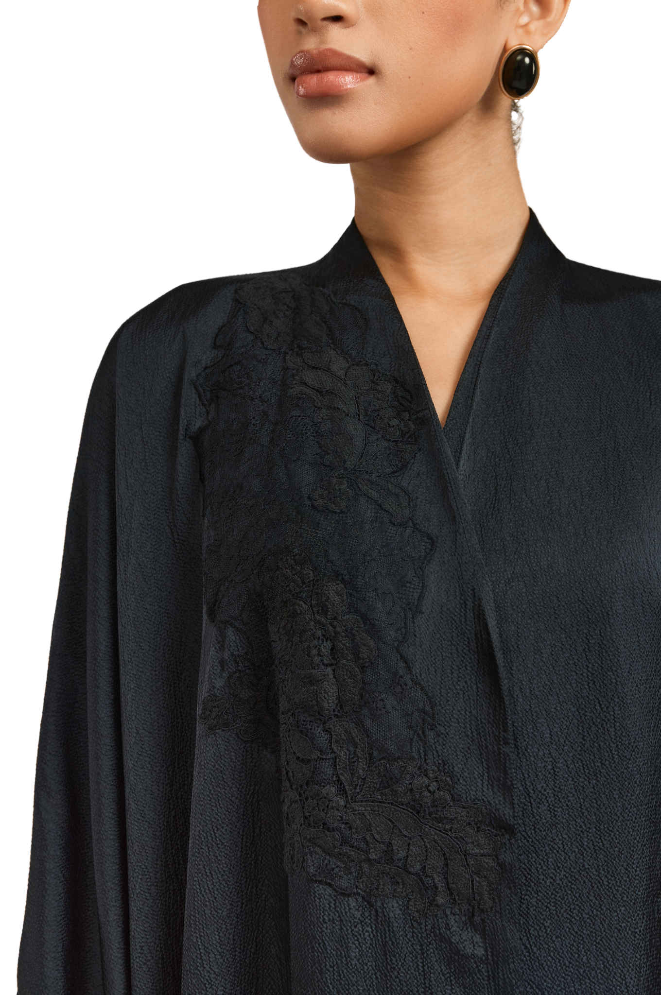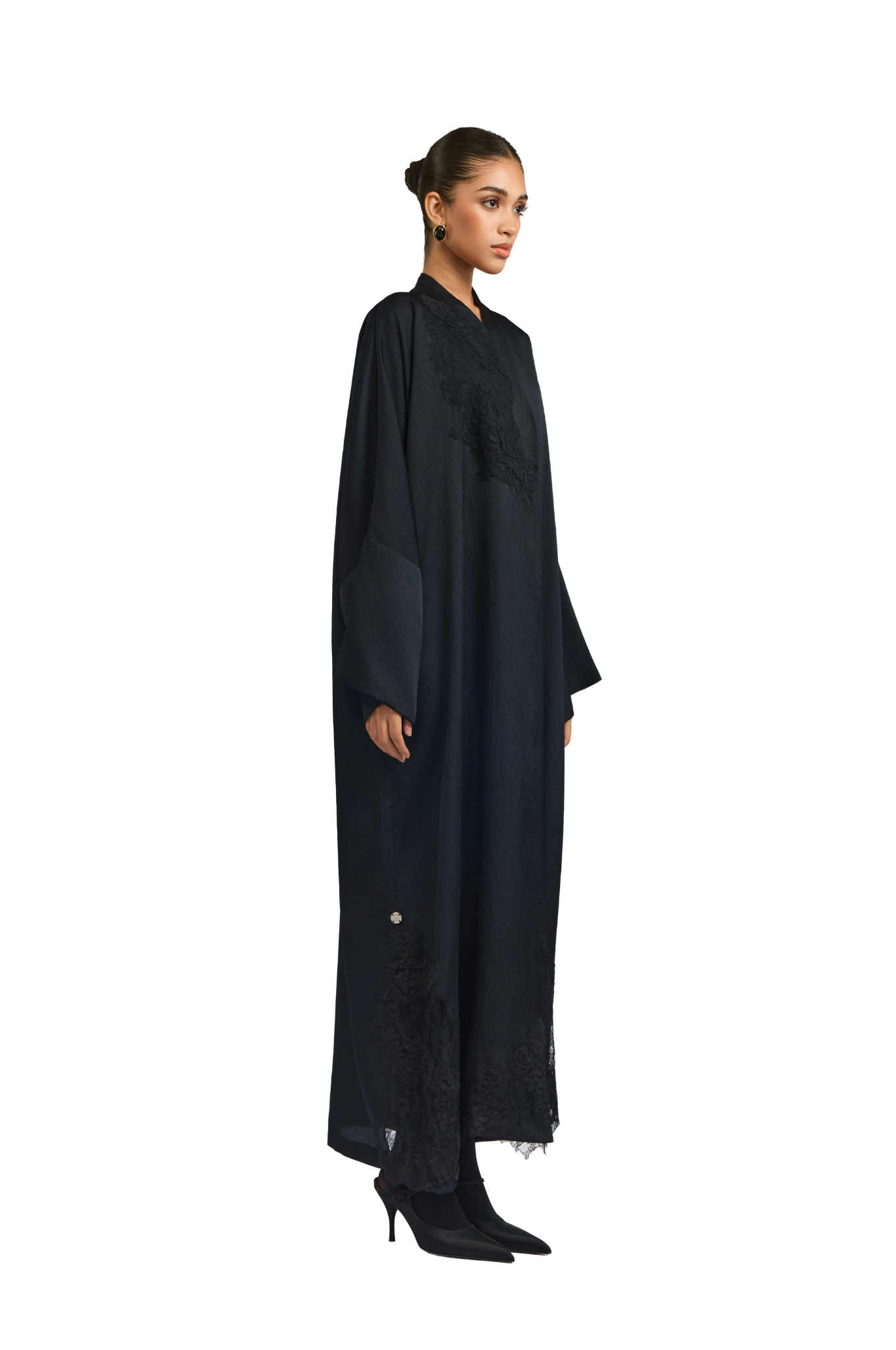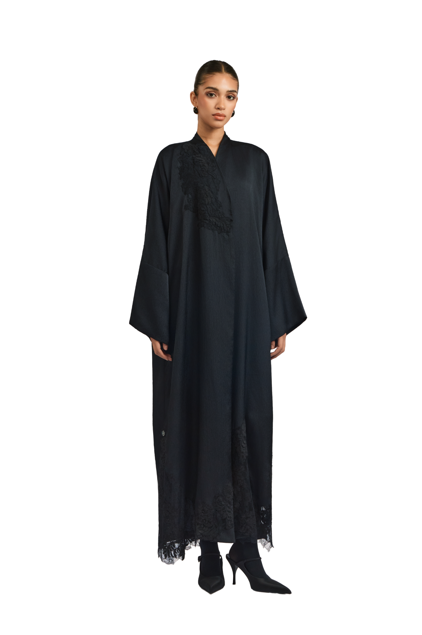 Exuding quiet elegance, the Kia Abaya is crafted from fluid crepe satin in timeless black, offering a soft sheen and graceful drape. Its straight-cut silhouette delivers a sleek, flattering fit, while tonal black lace patchwork is thoughtfully placed throughout the design—adding texture, depth, and subtle sophistication.