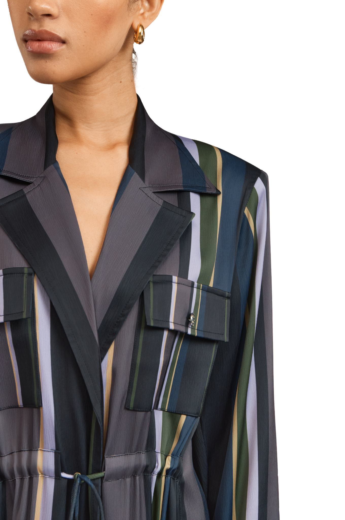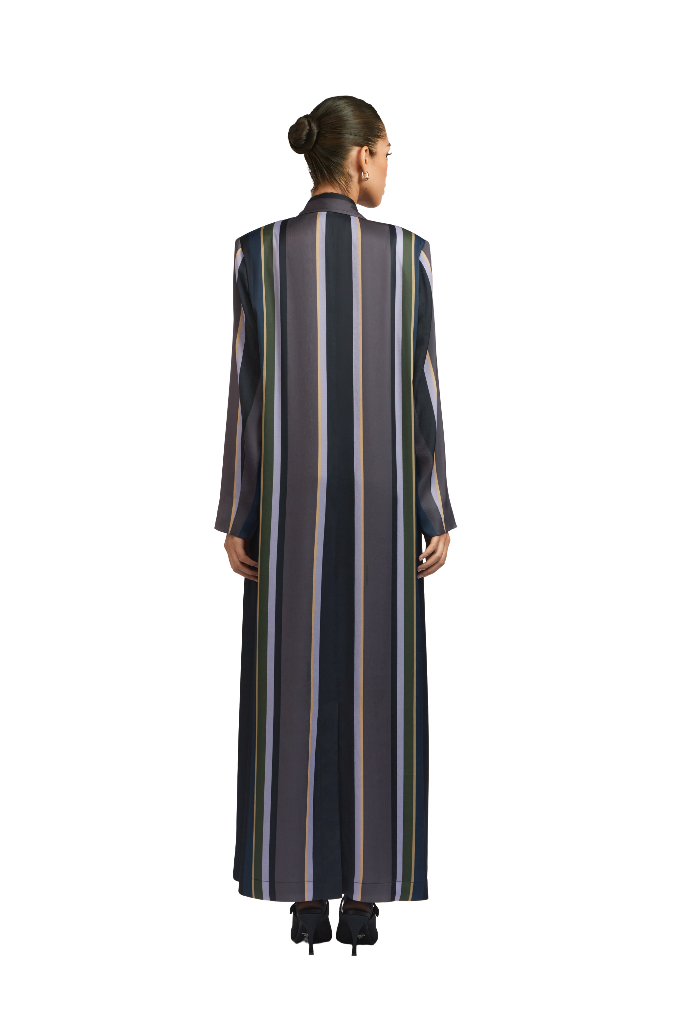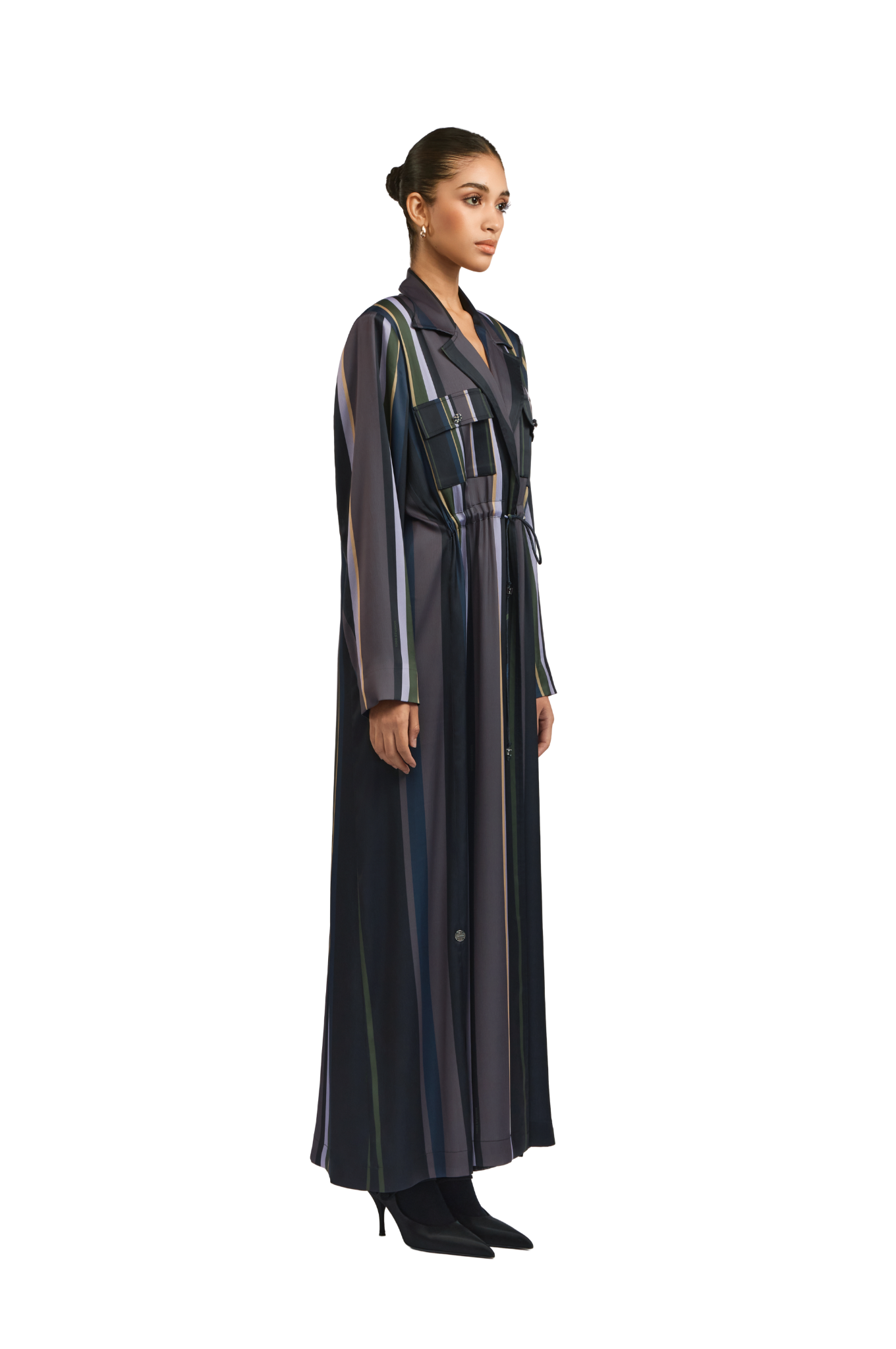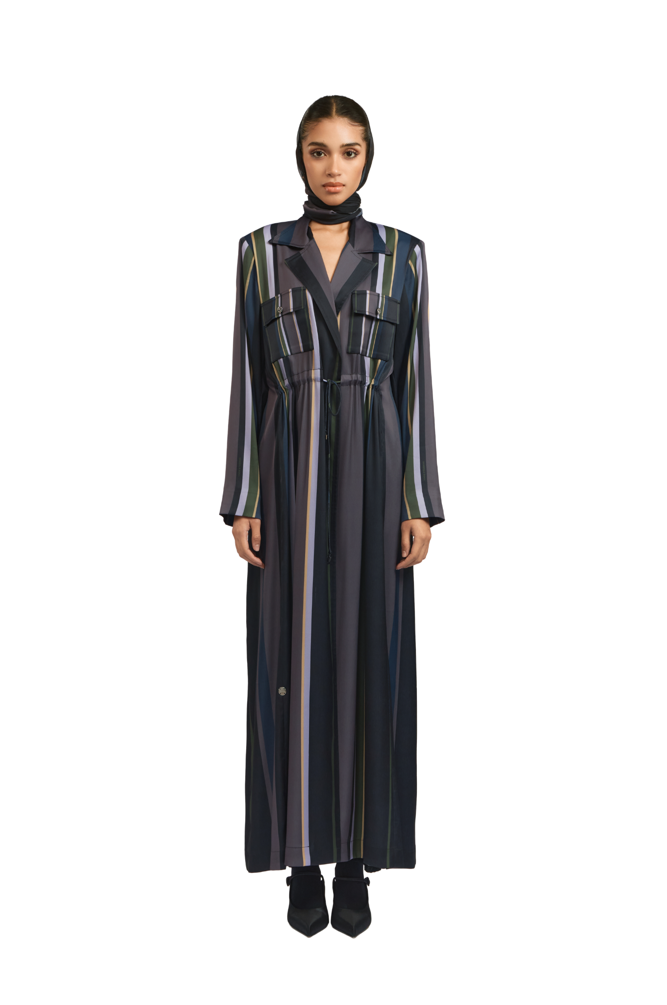 The Sybil Stripe Abaya is crafted in rich twill fabric with exclusive in House 1309 stripe print. It features functional front pockets secured with SpiraL buttons, and a waist‑cinching string finished with the signature 1309 cube bead.this piece embodies refined elegance and versatile sophistication for any occasion.